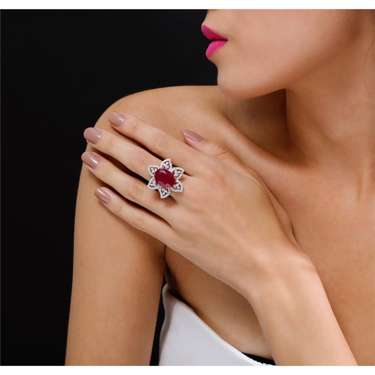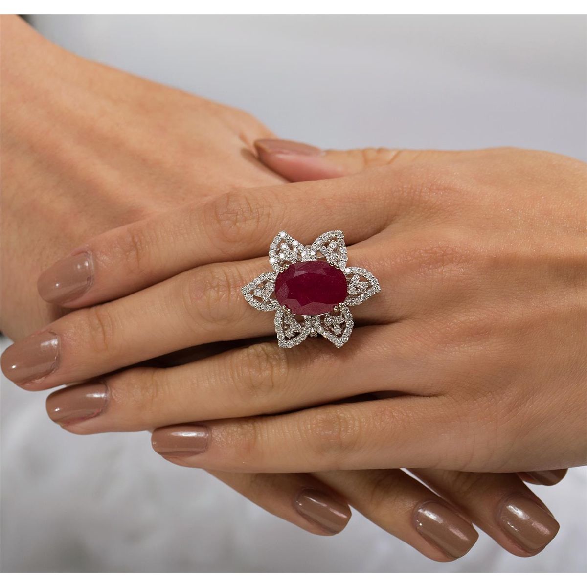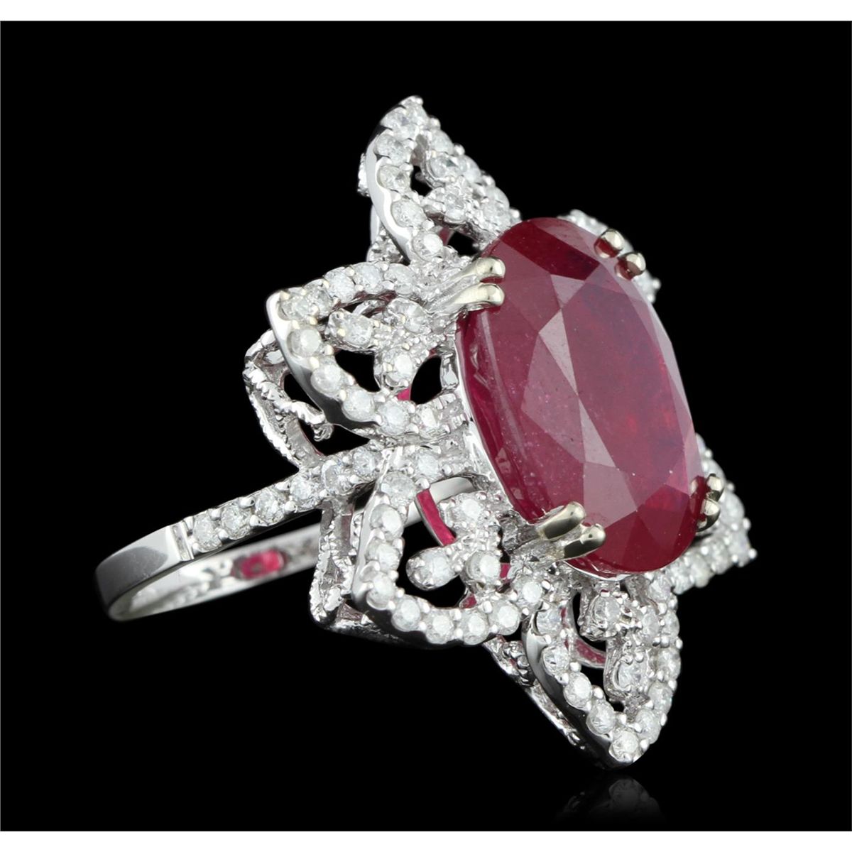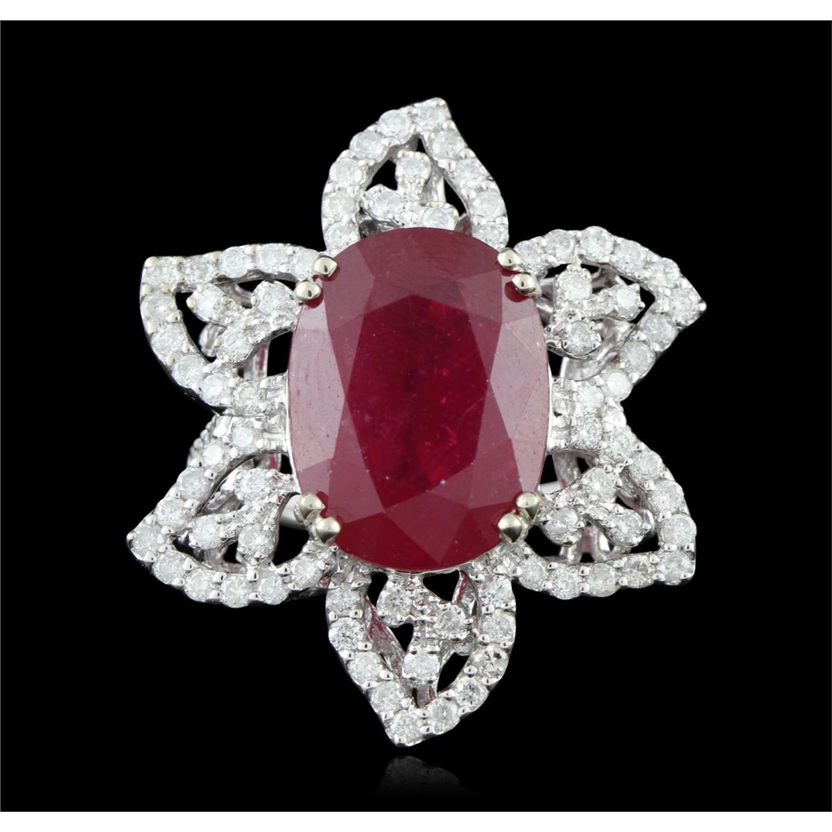 One electronically tested 14KT white gold ladies cast ruby and diamond ring with a bright polish finish. Condition is new, good workmanship. The featured ruby is set within a floral diamond lattice gallery, supported by diamond set shoulders and completed by a two millimeter wide band. Trademark is PMI. Identified with markings of "14K". Containing: One prong set oval mixed cut natural ruby, measuring 15.50 x 11.50 x 7.20mm, 8% bulge factor, approximate weight of 12.00ct., clarity is heavily included, type II, medium dark, moderately strong, slightly purplish red color, (GIA slpR 6/4), cut is good. Transmitting light somewhat diffusely, transparent to translucent. Naturally occurring internal & external characteristics are present. Indications of laboratory high temperature heat treatment, with glass & flux additives. Colored Stone Grading Report attached. Graded in the setting. Ruby has a low tolerance to rhodium plating, repolishing the surface, & ultrasonic cleaning. Ninety prong set round brilliant cut diamonds, measuring 1.60 - 1.50 x 0.93mm (depth est.) approximate total weight of 90 Stones = 1.23ct. Graded in the setting. Clarity I-I to I-2. Color G - I. Total Weight of Colored Stones 12.00ct. Total Weight of Diamonds 1.23ct. Total Weight of Ring 8.40gm. AIG Appraised at $7,400.00.
