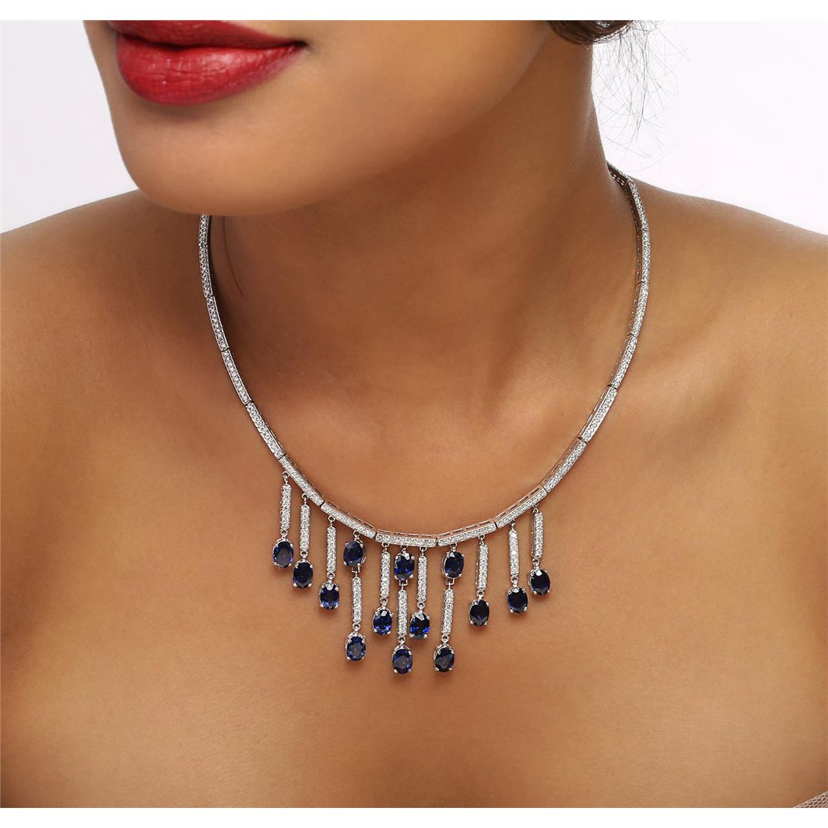 One electronically tested 14KT white gold ladies combination cast & assembled choker necklace with a hidden box clasp with a bright polish finish. Condition is new. Measurements: 14" in length. Identified with markings of "14K". Containing: Fourteen prong set oval modified brilliant cut natural blue sapphires, measuring 6.70 x 4.90 x 3.19mm, approximate. Total Weight of 12.04ct., clarity is eye clean, type II, medium, moderately strong, blue color, (GIA B 5/4), cut is good. Three Hundred Twenty-Seven prong set round brilliant cut diamonds, measuring 1.30 - 1.30 x 0.78mm (depth est.) approximate. Total Weight of 327 Stones = 2.62ct. Clarity: SI-2 to I-1. Color: G - H, Cut is Good. Colored gemstones are presumed to have been subjected to commonly used enhancement processes. All diamonds and colored gemstones are graded in the mounting, unless otherwise stated. Total Weight of Colored Stones 12.04ct. Total Weight of Diamonds 2.62ct. Total Weight of Necklace 31.80 grams. GGL Appraised at $24,720.00.