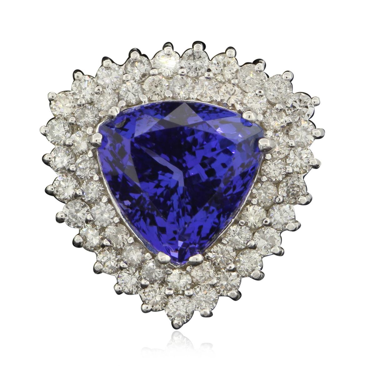 One electronically tested 14KT white gold ladies cast tanzanite and diamond ring with a bright polish finish. Condition is new, good workmanship. The featured tanzanite is set within tiered diamond bezels supported by tapering shoulders, completed by a two and one-half millimeter wide band. Identified with markings of "K14". Containing: One prong set triangular modified brilliant cut natural tanzanite, measuring 13.08 x 13.38 x 10.65mm, exact weight 12.10ct., clarity is eye clean, type I, dark, moderately strong, violetish blue color, (GIA vB 7/4), cut is good. Transmitting light with no distortion, transparent. GIA Colored Stone Grading Report attached. Graded loose prior to setting in the GIA Laboratory, Report #2151735126. Tanzanite is a very rare gemstone that is only found in the country of Tanzania. Originally discovered in 1967. Tiffany & Company, named the stone Tanzanite. It is found in the Usumburu Mountains that border the Umba Valley of northern Tanzania. Tanzanite occurs in gray, brown, violet, blue, reddish-purple, & green. The gem is interesting because of its exceptional pleochroism. Rotated in different directions a tanzanite will exhibit multiple changes of color. Tanzanite has a low tolerance to ultrasonic cleaning, and should not be cleaned using this method. Fifty-one prong set round brilliant cut diamonds, measuring 2.20 - 2.00 x 1.26mm (depth est.) approximate total weight of 51 Stones = 1.82ct. Graded in the setting. Clarity SI-1 to I-1. Color G - I. Total Weight of Colored Stones 12.10ct. Total Weight of Diamonds 1.82ct. Total Weight of Ring 11.72gm. AIG Appraised at $37,320.00.