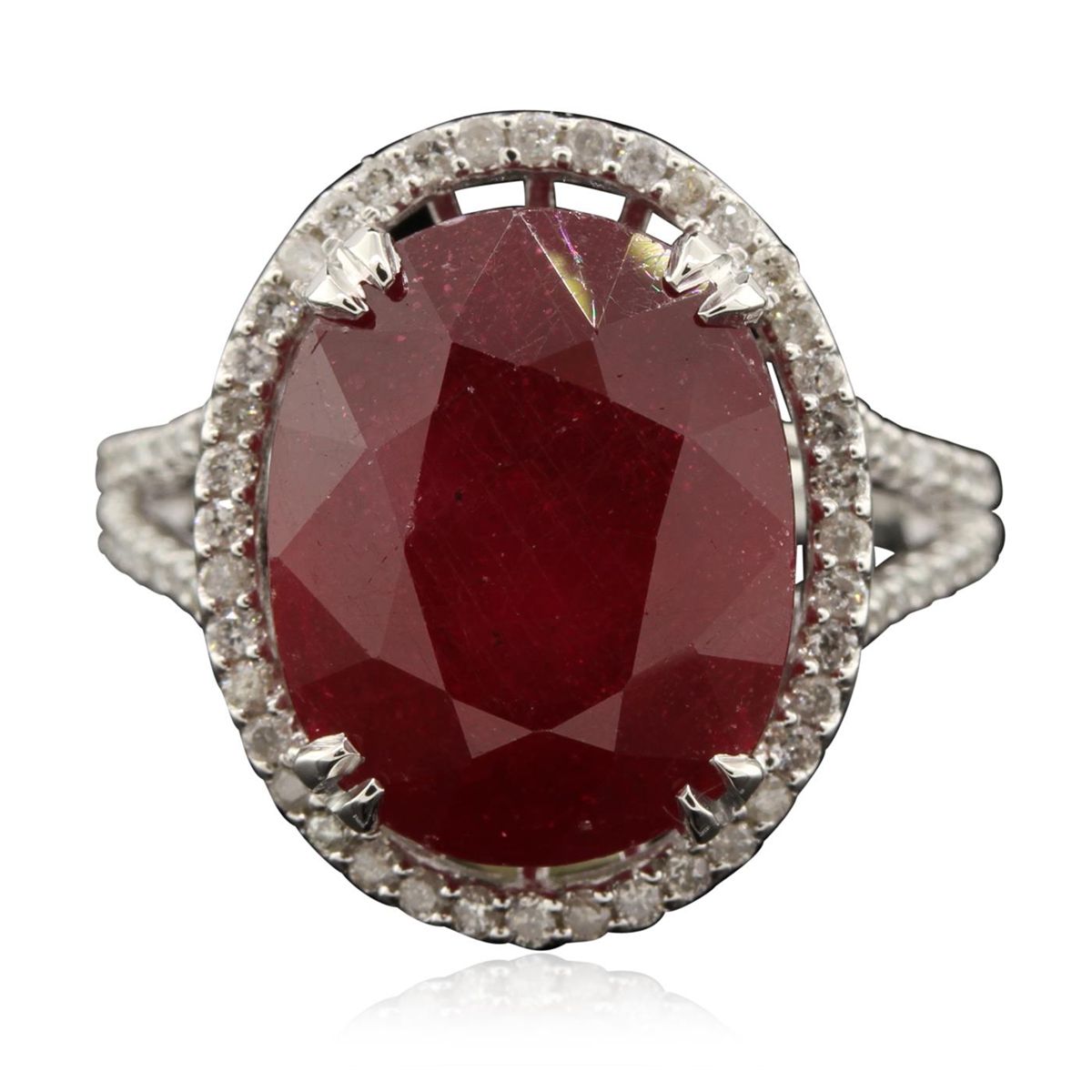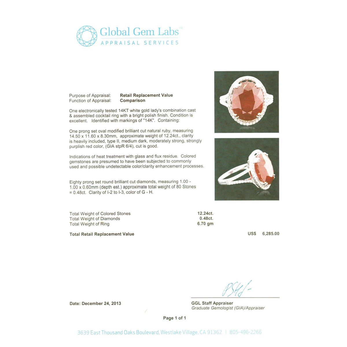 One electronically tested 14KT white gold Ladies combination cast & assembled cocktail ring with a bright polish finish. Identified with markings of "14K". Condition is excellent. Containing: One prong set oval modified brilliant cut natural ruby, measuring 14.50 x 11.60 x 8.30mm, approximate weight of 12.24ct., clarity is heavily included, type II, medium dark, moderately strong, strongly purplish red color, (GIA stpR 6/4), cut is good. Indications of heat treatment with glass and flux residue. Colored gemstones are presumed to have been subjected to commonly used and possible undetectable color/clarity enhancement processes. Eighty prong set round brilliant cut diamonds, measuring 1.00 - 1.00 x 0.60mm (depth est.) approximate total weight of 80 Stones = 0.48ct. Clarity of I-2 to I-3, Color of G - H. Total Weight of Colored Stones 12.24ct. Total Weight of Diamonds 0.48ct. Total Weight of Ring 6.70gm. GGL Appraised at $6,285.00.