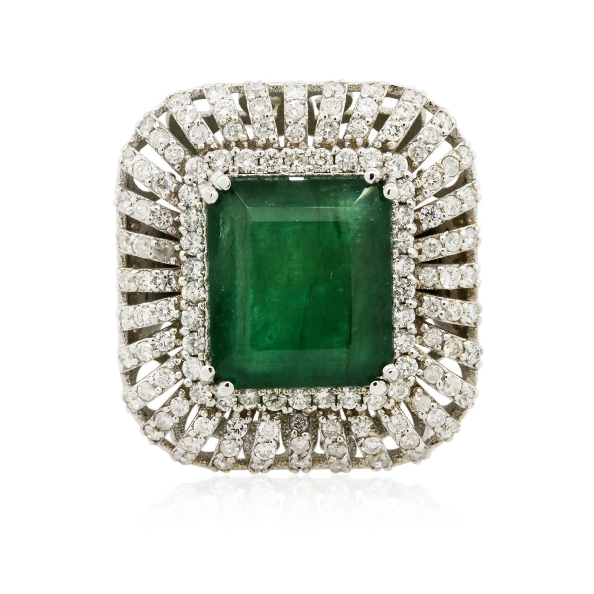 One electronically tested 14KT white gold Ladies combination cast & assembled ring with a bright polish finish. Condition is new. Identified with markings of "14K". Containing: One prong set emerald standard step cut natural emerald, measuring 14.40 x 12.60 x 9.19mm, approximate weight of 12.25ct., clarity is heavily included, type III, medium dark, moderately strong, green color, (GIA G 6/4), cut is good. Colored gemstones are presumed to have been subjected to commonly used color/clarity enhancement processes. One Hundred Sixty-Eight prong set round brilliant cut diamonds, measuring 1.30 - 1.30 x 0.78mm (depth est.) approximate. Total Weight of 168 Stones = 1.34ct. Clarity: I-1 to I-2. Color: H - J, Cut is Good. Total Weight of Colored Stones 12.25ct. Total Weight of Diamonds 1.34ct. Total Weight of Ring 17.10 grams. GGL Appraised at $19,720.00.