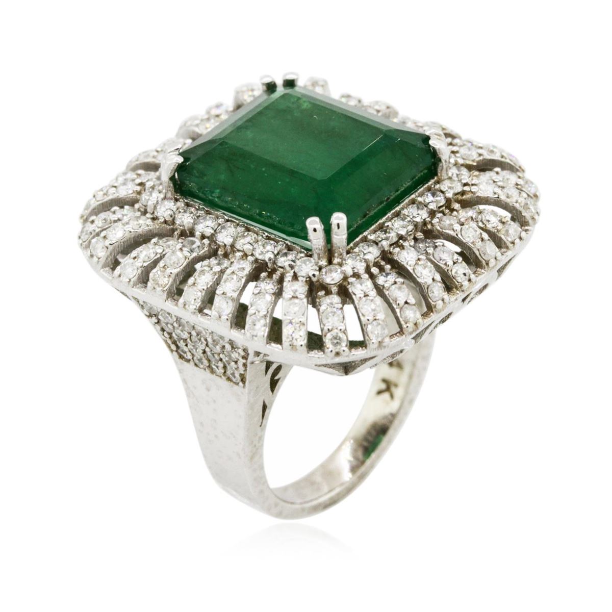 One electronically tested 14KT white gold Ladies combination cast & assembled ring with a bright polish finish. Condition is new. Identified with markings of "14K". Containing: One prong set emerald standard step cut natural emerald, measuring 14.40 x 12.60 x 9.19mm, approximate weight of 12.25ct., clarity is heavily included, type III, medium dark, moderately strong, green color, (GIA G 6/4), cut is good. Colored gemstones are presumed to have been subjected to commonly used color/clarity enhancement processes. One Hundred Sixty-Eight prong set round brilliant cut diamonds, measuring 1.30 - 1.30 x 0.78mm (depth est.) approximate. Total Weight of 168 Stones = 1.34ct. Clarity: I-1 to I-2. Color: H - J, Cut is Good. Total Weight of Colored Stones 12.25ct. Total Weight of Diamonds 1.34ct. Total Weight of Ring 17.10 grams. GGL Appraised at $19,720.00.