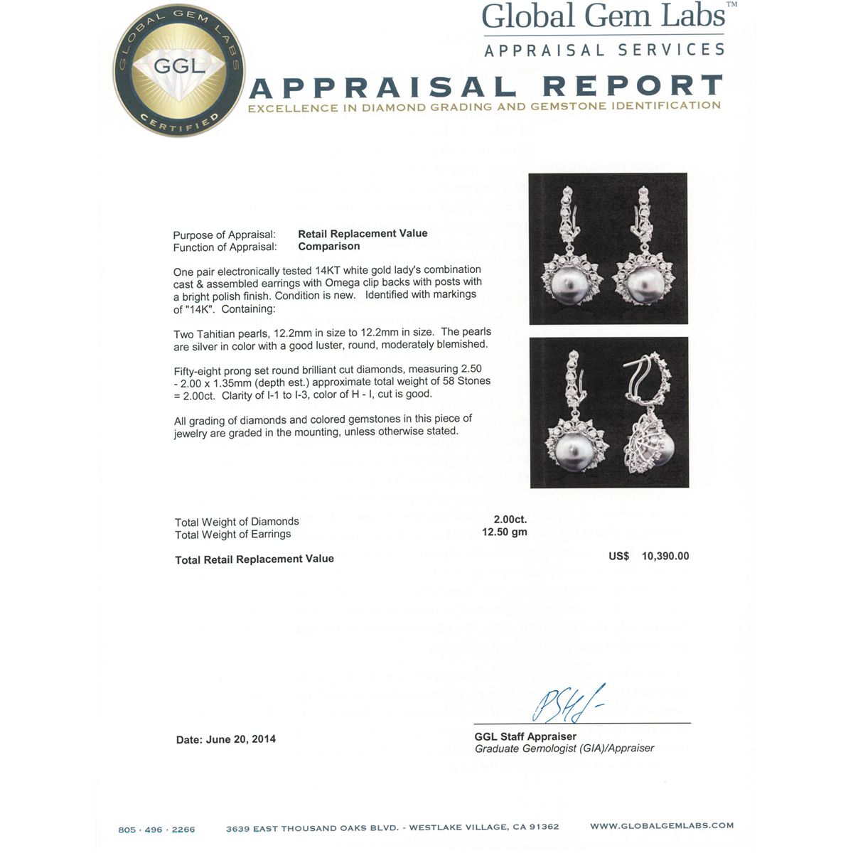 One pair electronically tested 14KT white gold Ladies combination cast & assembled earrings with Omega clip backs with posts with a bright polish finish. Condition is new. Identified with markings of "14K". Containing: Two Tahitian pearls, 12.2mm in size to 12.2mm in size. The pearls are silver in color with a good luster, round, moderately blemished. Fifty-Eight prong set round brilliant cut diamonds, measuring 2.50 - 2.00 x 1.35mm (depth est.) approximate. Total Weight of 58 Stones = 2.00ct. Clarity: I-1 to I-3. Color: H - I, Cut is Good. All grading of diamonds and colored gemstones in this piece of jewelry are graded in the mounting, unless otherwise stated. Total Weight of Diamonds 2.00ct. Total Weight of Earrings 12.50 grams. GGL Appraised at $10,390.00.