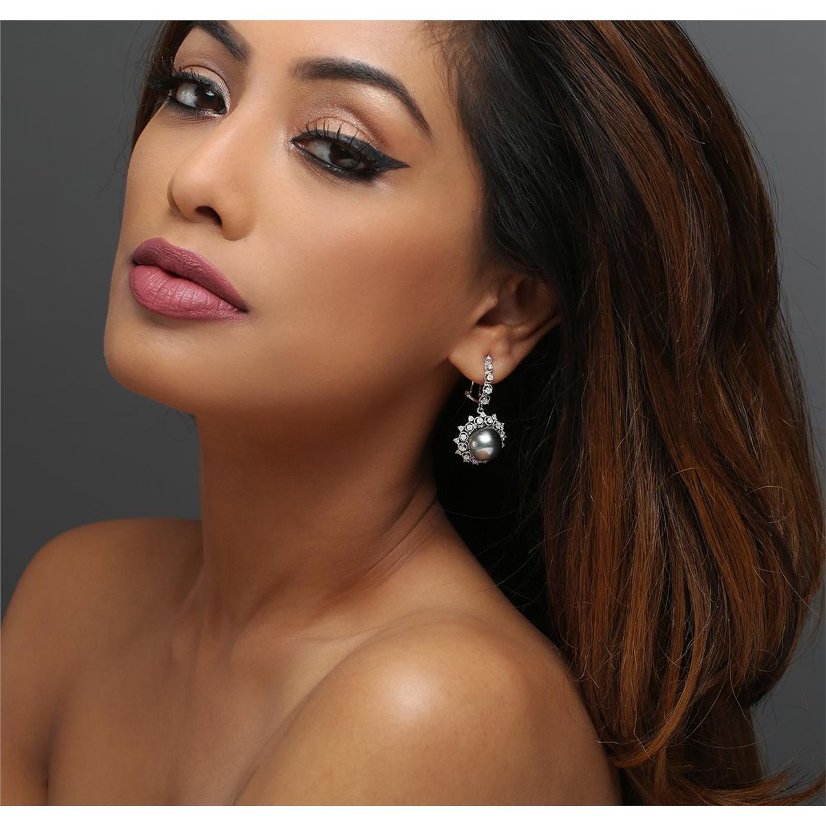One pair electronically tested 14KT white gold Ladies combination cast & assembled earrings with Omega clip backs with posts with a bright polish finish. Condition is new. Identified with markings of "14K". Containing: Two Tahitian pearls, 12.2mm in size to 12.2mm in size. The pearls are silver in color with a good luster, round, moderately blemished. Fifty-Eight prong set round brilliant cut diamonds, measuring 2.50 - 2.00 x 1.35mm (depth est.) approximate. Total Weight of 58 Stones = 2.00ct. Clarity: I-1 to I-3. Color: H - I, Cut is Good. All grading of diamonds and colored gemstones in this piece of jewelry are graded in the mounting, unless otherwise stated. Total Weight of Diamonds 2.00ct. Total Weight of Earrings 12.50 grams. GGL Appraised at $10,390.00.