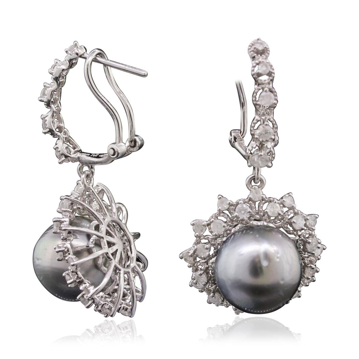 One pair electronically tested 14KT white gold Ladies combination cast & assembled earrings with Omega clip backs with posts with a bright polish finish. Condition is new. Identified with markings of "14K". Containing: Two Tahitian pearls, 12.2mm in size to 12.2mm in size. The pearls are silver in color with a good luster, round, moderately blemished. Fifty-Eight prong set round brilliant cut diamonds, measuring 2.50 - 2.00 x 1.35mm (depth est.) approximate. Total Weight of 58 Stones = 2.00ct. Clarity: I-1 to I-3. Color: H - I, Cut is Good. All grading of diamonds and colored gemstones in this piece of jewelry are graded in the mounting, unless otherwise stated. Total Weight of Diamonds 2.00ct. Total Weight of Earrings 12.50 grams. GGL Appraised at $10,390.00.