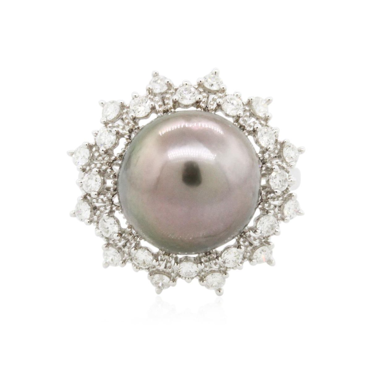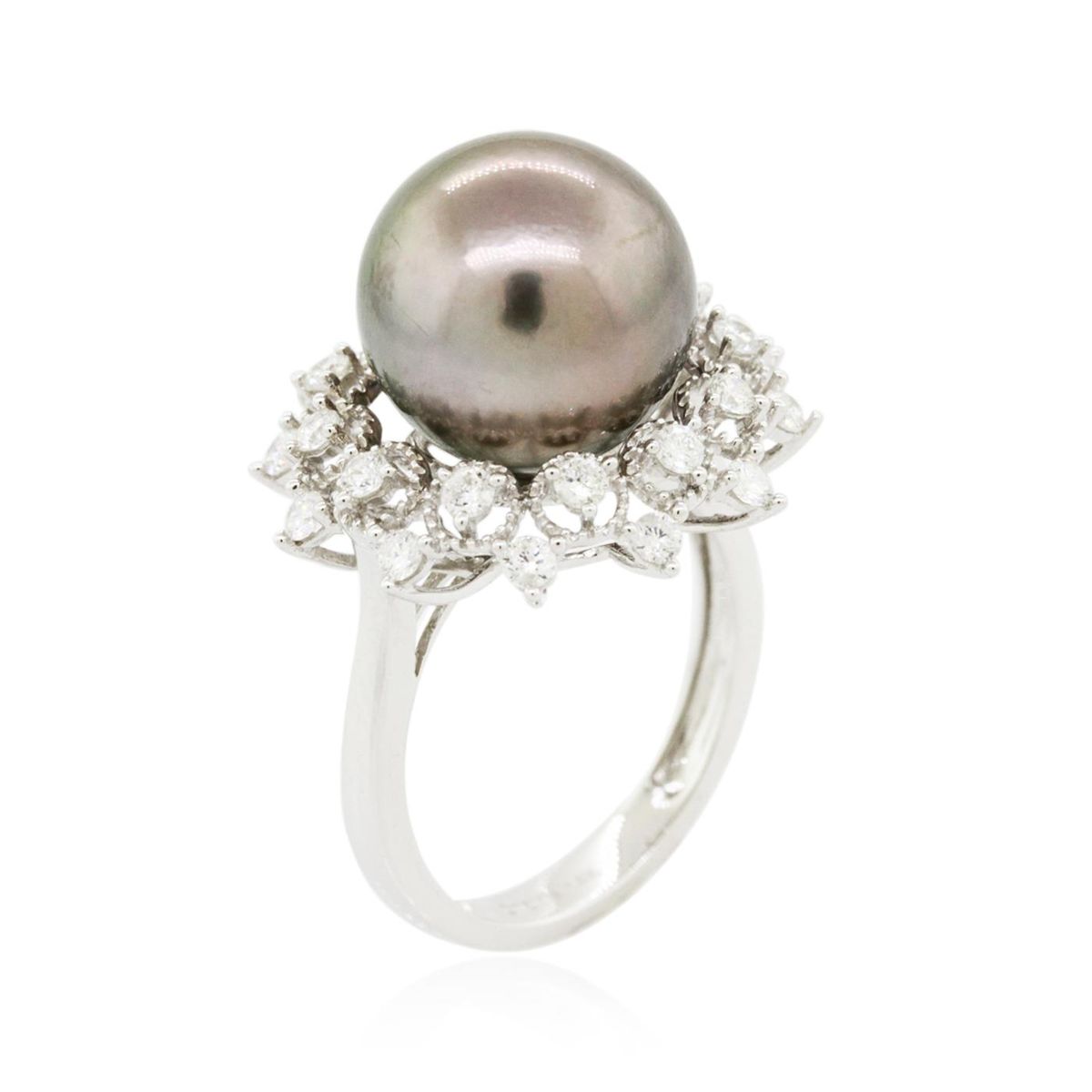 One electronically tested 14KT white gold Ladies combination cast & assembled ring with a bright polish finish. Condition is new. Identified with markings of "14K". Containing: One Tahitian pearl, 12.2mm in size to 12.2mm in size. The pearl is silver in color with a good luster, round, moderately blemished. Twenty-Four prong set round brilliant cut diamonds, measuring 2.00 - 2.00 x 1.20mm (depth est.) approximate. Total Weight of 24 Stones = 0.70ct. Clarity: I-1 to I-2. Color: H - I, Cut is Good. All grading of diamonds and colored gemstones in this piece of jewelry are graded in the mounting, unless otherwise stated. Total Weight of Diamonds 0.70ct. Total Weight of Ring 7.00 grams. GGL Appraised at $5,100.00.