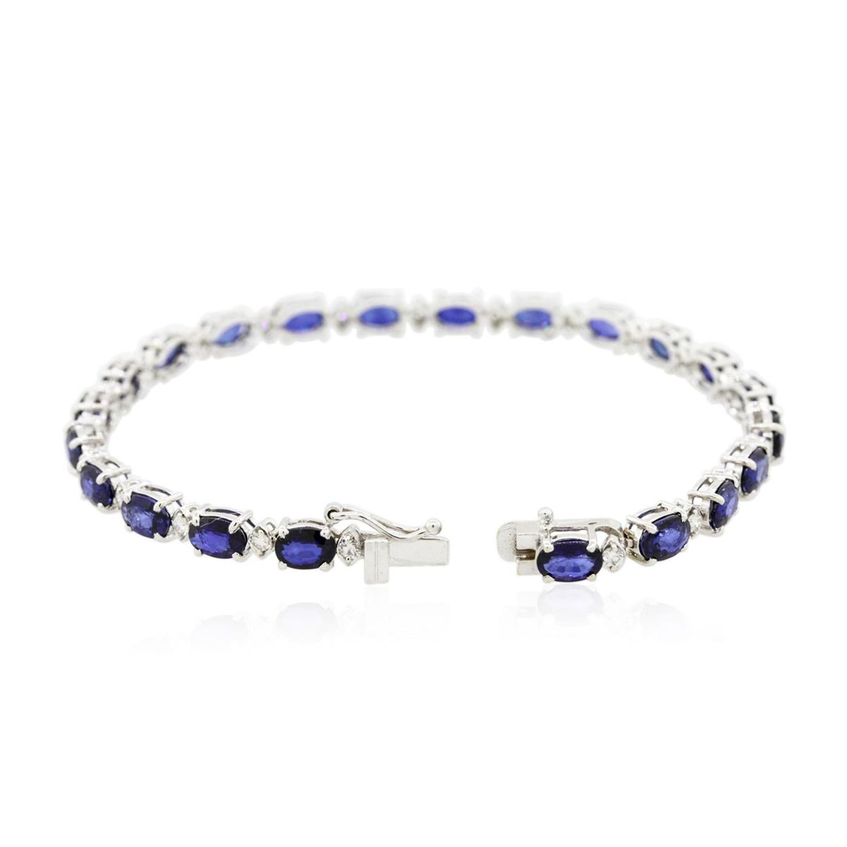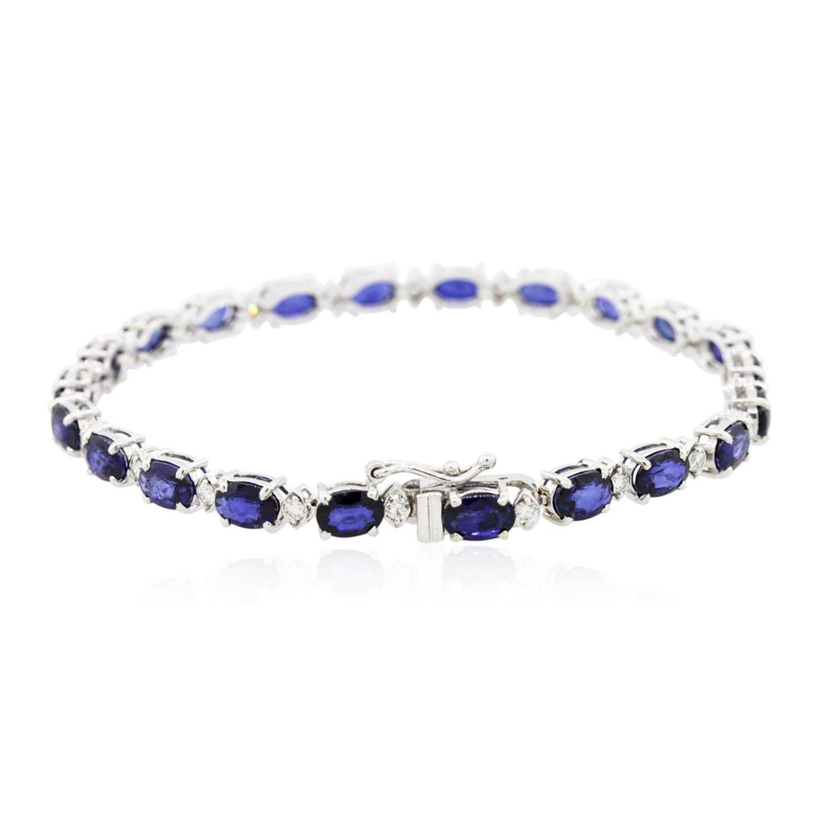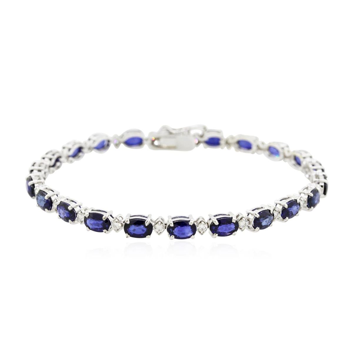 One electronically tested 14KT white gold ladies combination cast & assembled bracelet with a hidden box clasp with a bright polish finish. Measurements: 7.25" in length. Condition is new. Containing: Twenty-two prong set oval modified brilliant cut natural blue sapphires, measuring 6.40 x 4.00 x 2.60mm, approximate total weight of 12.32ct., clarity is slightly included, type II, medium, moderately strong, blue color, (GIA B 5/4), cut is good. Twenty-Two prong set round brilliant cut diamonds, measuring 1.80 - 1.80 x 1.08mm (depth est.) approximate total weight of 22 Stones = 0.47ct. Clarity: SI-1. Color: I - J, Cut is Good. Colored gemstones are presumed to have been subjected to commonly used enhancement processes. All diamonds and colored gemstones are graded in the mounting, unless otherwise stated. Total Weight of Colored Stones 12.32ct. Total Weight of Diamonds 0.47ct. Total Weight of Bracelet 10.50 grams. GGL Appraised at $9,980.00.