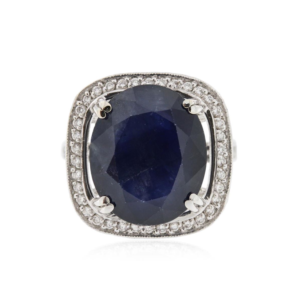 One electronically tested 14KT white gold ladies cast sapphire and diamond ring. Condition is new, good workmanship. The featured sapphire is set within a diamond bezel supported by a diamond set under gallery and diamond set shoulders, completed by a one and one-half millimeter wide band. Bright polish finish with milgrain detailing. Identified with markings of "14K". Containing: One prong set oval mixed cut natural blue sapphire, measuring 16.30 x 13.50 x 6.55mm, 6%. bulge factor, approximate weight of 12.33ct., clarity is heavily included, type II, medium dark, very slightly grayish, violetish blue color, (GIA vB 6/3), cut is good. Transmitting light diffusely, translucent. Naturally occurring internal & external characteristics are present. Colored Stone Grading Report attached. Graded in the setting. One Hundred Seventy-Eight prong set round brilliant cut diamonds, measuring 1.30 - 1.10 x 0.72mm (depth est.) approximate. Total Weight of 178 Stones = 1.22ct. Graded in the setting. Clarity: VS-2 to SI-2. Color: G - I. Total Weight of Colored Stones 12.33ct. Total Weight of Diamonds 1.22ct. Total Weight of Ring 9.16 grams. AIG Appraised at $10,140.00.