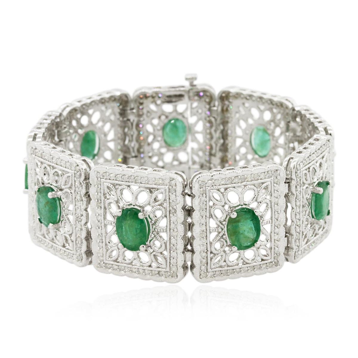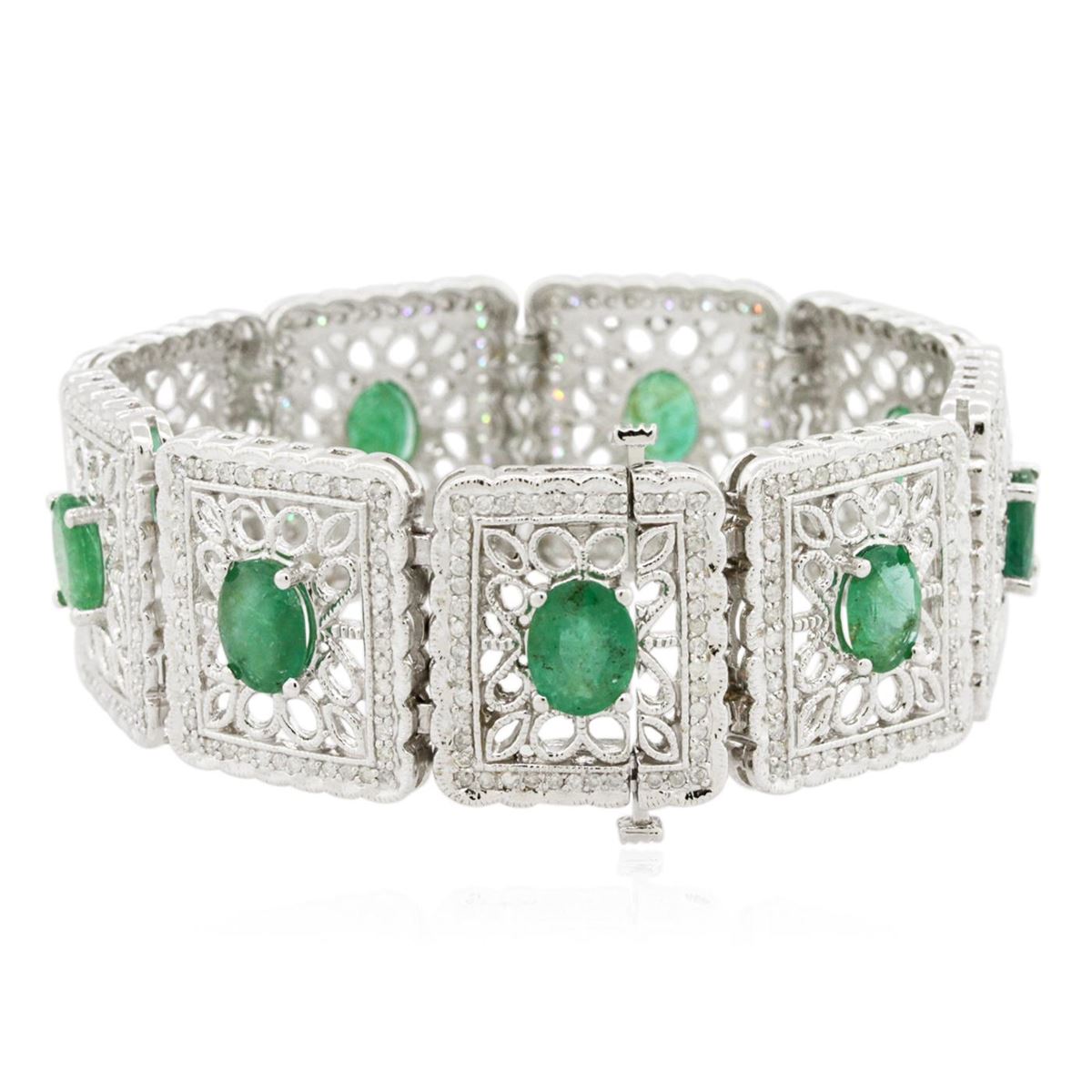 One electronically tested 14KT white gold ladies cast emerald and diamond bracelet with a hidden box clasp with a bright polish finish. Measurements: 7" in length Condition is new. Containing: Nine prong set oval modified brilliant cut natural emeralds, measuring 8.80 x 6.50 x 4.23mm, approximate total weight of 12.42ct., clarity is heavily included, type III, light, very slightly grayish, green color, (GIA G 3/3), cut is good. Three Hundred Sixty-Eight prong set round brilliant cut diamonds, measuring 1.30 - 1.30 x 0.78mm (depth est.) approximate total weight of 368 Stones = 2.94ct. Clarity: I-1 to I-3. Color: I - J. Colored gemstones are presumed to have been subjected to commonly used enhancement processes. All diamonds and colored gemstones are graded in the mounting, unless otherwise stated. Total Weight of Colored Stones 12.42ct. Total Weight of Diamonds 2.94ct. Total Weight of Bracelet 51.90 grams. GGL Appraised at $16,465.00.