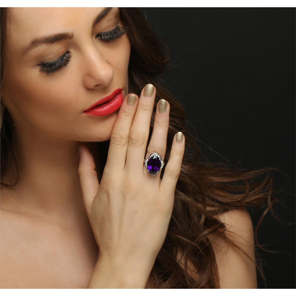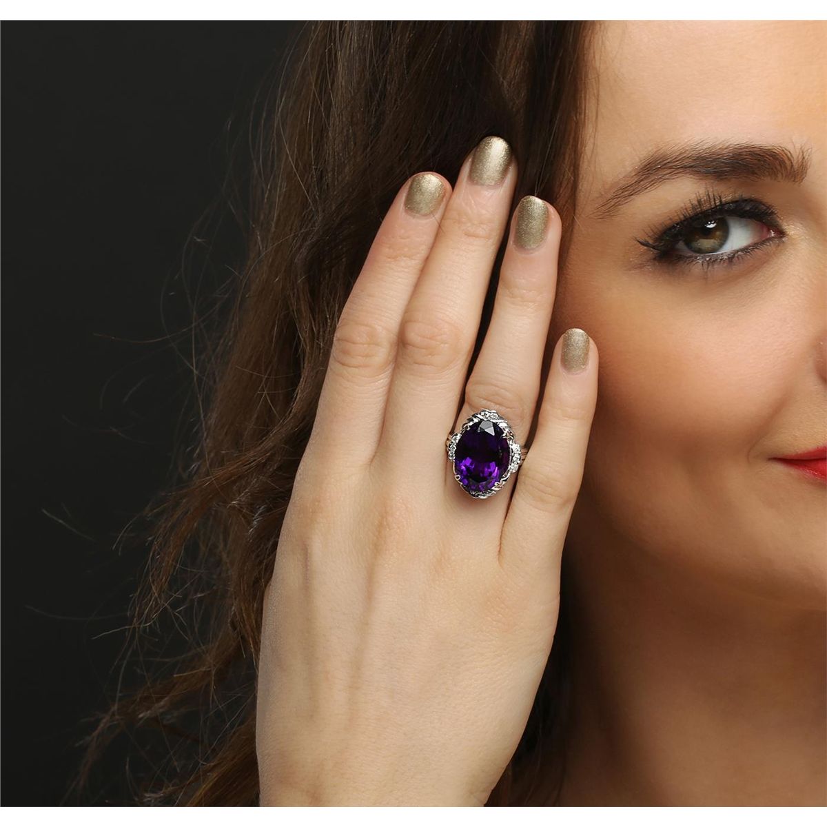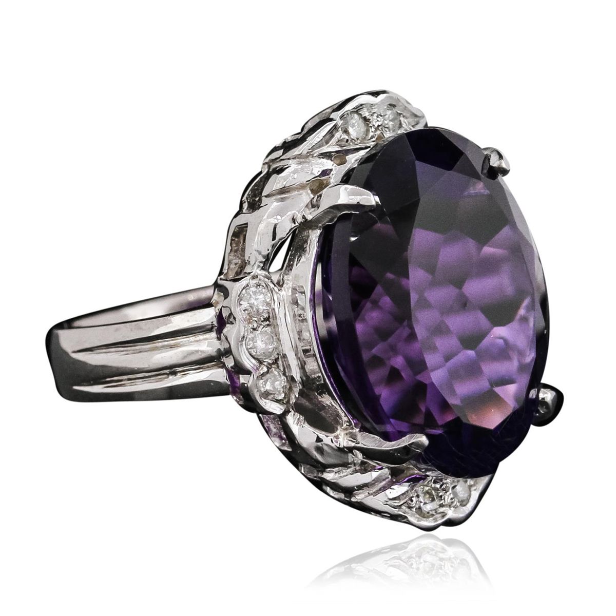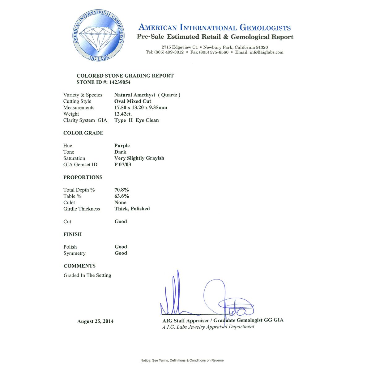 One electronically tested 14KT white gold ladies cast amethyst and diamond ring with a bright polish finish. The featured amethyst is set within a stylized diamond bezel, completed by a three and one-half millimeter wide band. Identified with markings of "14K". Condition is new, good workmanship. Containing: One prong set oval mixed cut natural amethyst, measuring 17.50 x 13.20 x 9.35mm, 6% bulge factor, approximate weight of 12.42ct., clarity is eye clean, type II, dark, very slightly grayish, purple color, (GIA P 7/3), cut is good. Transmitting light with no distortion, transparent. Colored Stone Grading Report attached. Graded in the setting. Ten bead set round brilliant cut diamonds, measuring 1.80 - 1.70 x 1.05mm (depth est.) approximate total weight of 10 Stones = 0.25ct. Graded in the setting. Clarity: I-1 to I-2. Color: G - H. Total Weight of Colored Stones 12.42ct. Total Weight of Diamonds 0.25ct. Total Weight of Ring 9.30 grams. AIG Appraised at $2,505.00.