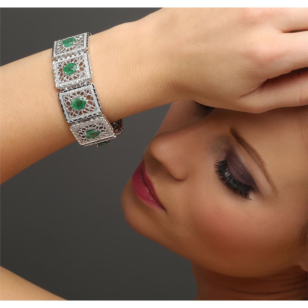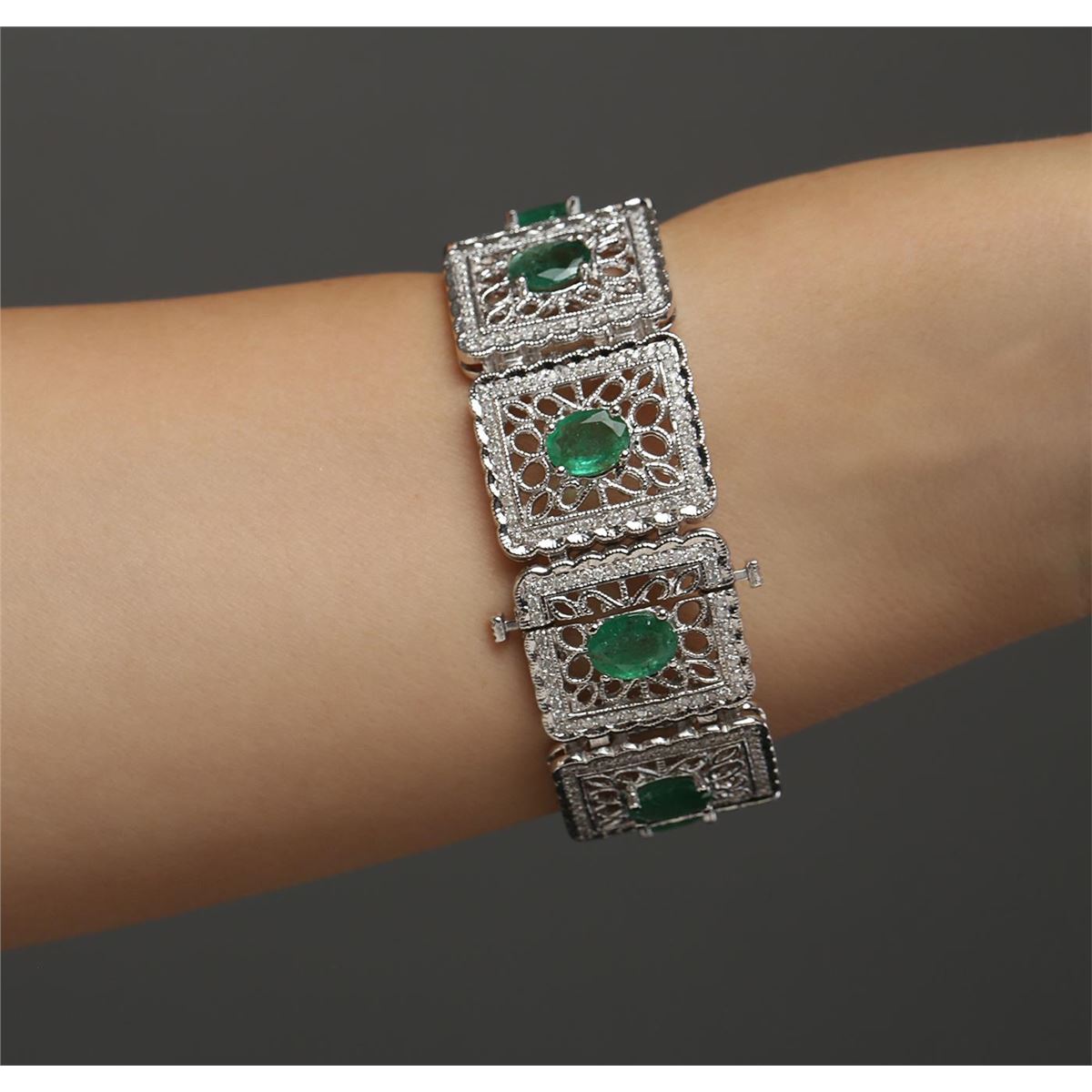 One electronically tested 14KT white gold ladies cast emerald and diamond bracelet with a hidden box clasp with a bright polish finish. Measurements: 7" in length Condition is new. Containing: Nine prong set oval modified brilliant cut natural emeralds, measuring 8.80 x 6.50 x 4.23mm, approximate total weight of 12.42ct., clarity is heavily included, type III, light, very slightly grayish, green color, (GIA G 3/3), cut is good. Three Hundred Sixty-Eight prong set round brilliant cut diamonds, measuring 1.30 - 1.30 x 0.78mm (depth est.) approximate total weight of 368 Stones = 2.94ct. Clarity: I-1 to I-3. Color: I - J. Colored gemstones are presumed to have been subjected to commonly used enhancement processes. All diamonds and colored gemstones are graded in the mounting, unless otherwise stated. Total Weight of Colored Stones 12.42ct. Total Weight of Diamonds 2.94ct. Total Weight of Bracelet 51.90 grams. GGL Appraised at $16,465.00.