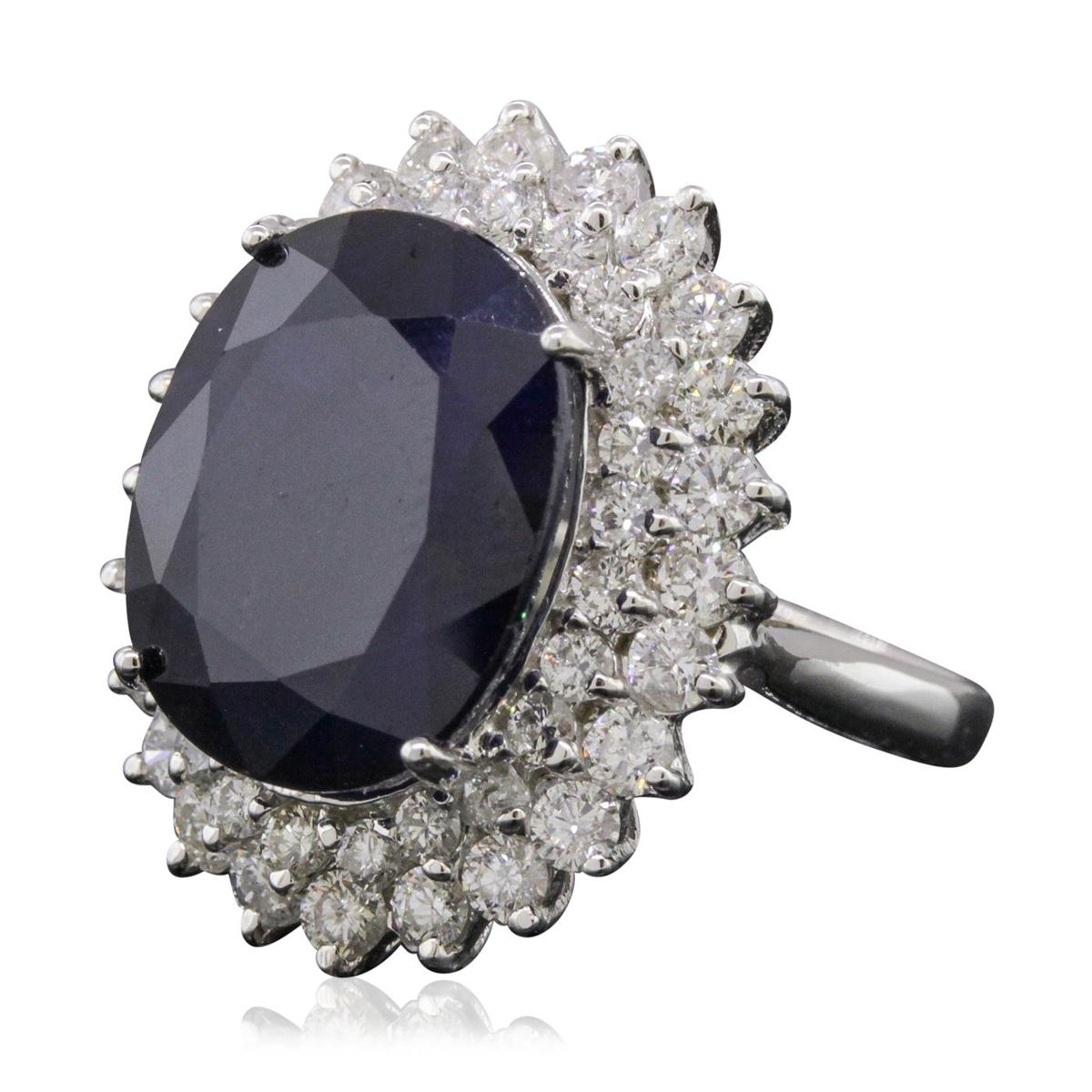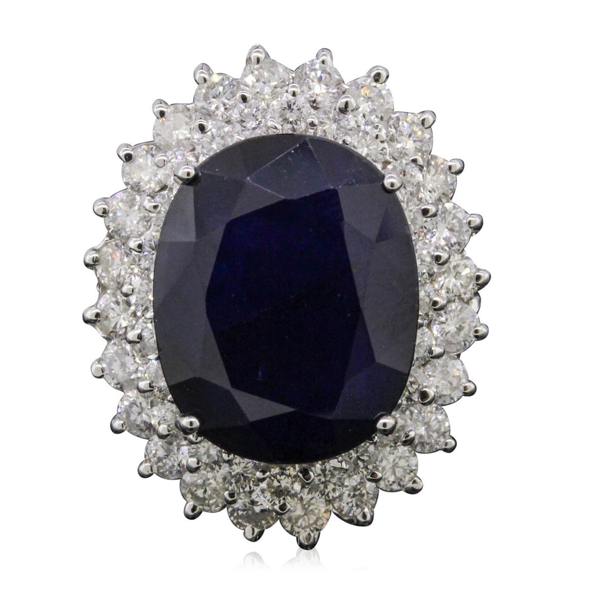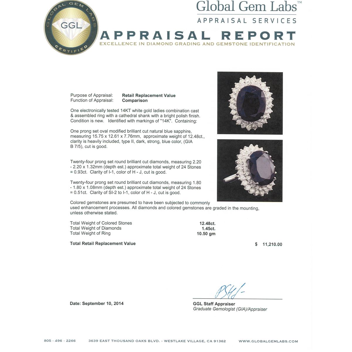 One electronically tested 14KT white gold ladies combination cast & assembled ring with a cathedral shank with a bright polish finish. Identified with markings of "14K". Condition is new. Containing: One prong set oval modified brilliant cut natural blue sapphire, measuring 15.75 x 12.61 x 7.76mm, approximate weight of 12.48ct., clarity is heavily included, type II, dark, strong, blue color, (GIA B 7/5), cut is good. Twenty-Four prong set round brilliant cut diamonds, measuring 2.20 - 2.20 x 1.32mm (depth est.) approximate total weight of 24 Stones = 0.93ct. Clarity: I-1. Color: H - J, Cut is Good. Twenty-Four prong set round brilliant cut diamonds, measuring 1.80 - 1.80 x 1.08mm (depth est.) approximate total weight of 24 Stones = 0.51ct. Clarity: SI-2 to I-1. Color: H - J, Cut is Good. Colored gemstones are presumed to have been subjected to commonly used enhancement processes. All diamonds and colored gemstones are graded in the mounting, unless otherwise stated. Total Weight of Colored Stones 12.48ct. Total Weight of Diamonds 1.45ct. Total Weight of Ring 10.50 grams. GGL Appraised at $11,210.00.