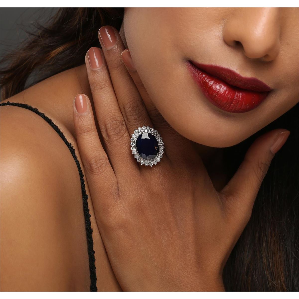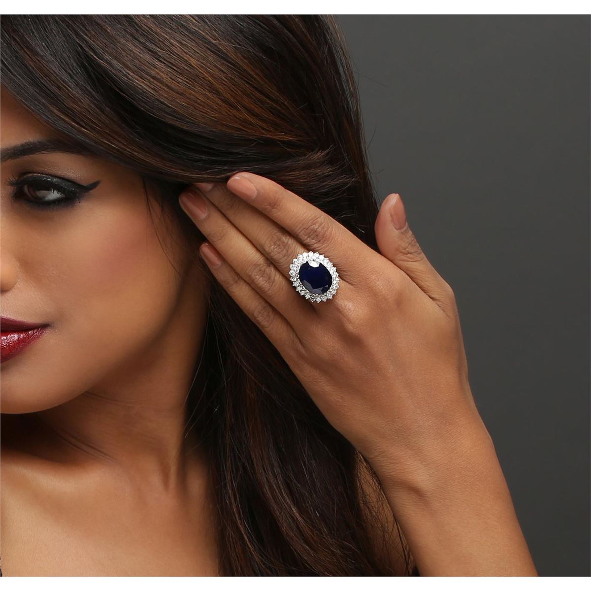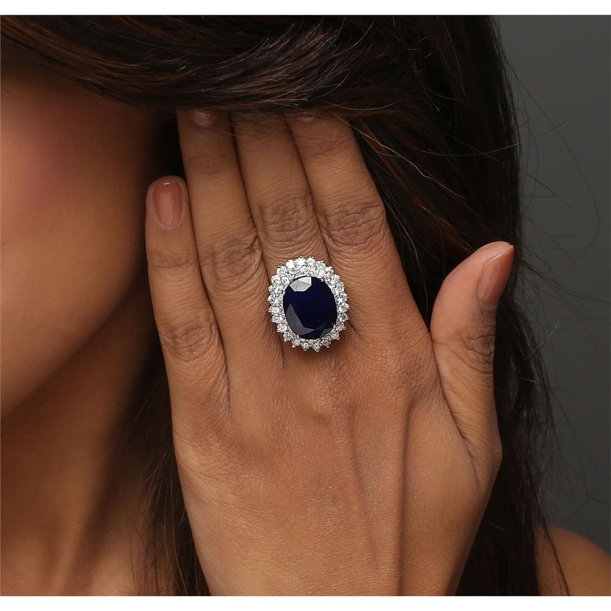 One electronically tested 14KT white gold ladies combination cast & assembled ring with a cathedral shank with a bright polish finish. Identified with markings of "14K". Condition is new. Containing: One prong set oval modified brilliant cut natural blue sapphire, measuring 15.75 x 12.61 x 7.76mm, approximate weight of 12.48ct., clarity is heavily included, type II, dark, strong, blue color, (GIA B 7/5), cut is good. Twenty-Four prong set round brilliant cut diamonds, measuring 2.20 - 2.20 x 1.32mm (depth est.) approximate total weight of 24 Stones = 0.93ct. Clarity: I-1. Color: H - J, Cut is Good. Twenty-Four prong set round brilliant cut diamonds, measuring 1.80 - 1.80 x 1.08mm (depth est.) approximate total weight of 24 Stones = 0.51ct. Clarity: SI-2 to I-1. Color: H - J, Cut is Good. Colored gemstones are presumed to have been subjected to commonly used enhancement processes. All diamonds and colored gemstones are graded in the mounting, unless otherwise stated. Total Weight of Colored Stones 12.48ct. Total Weight of Diamonds 1.45ct. Total Weight of Ring 10.50 grams. GGL Appraised at $11,210.00.