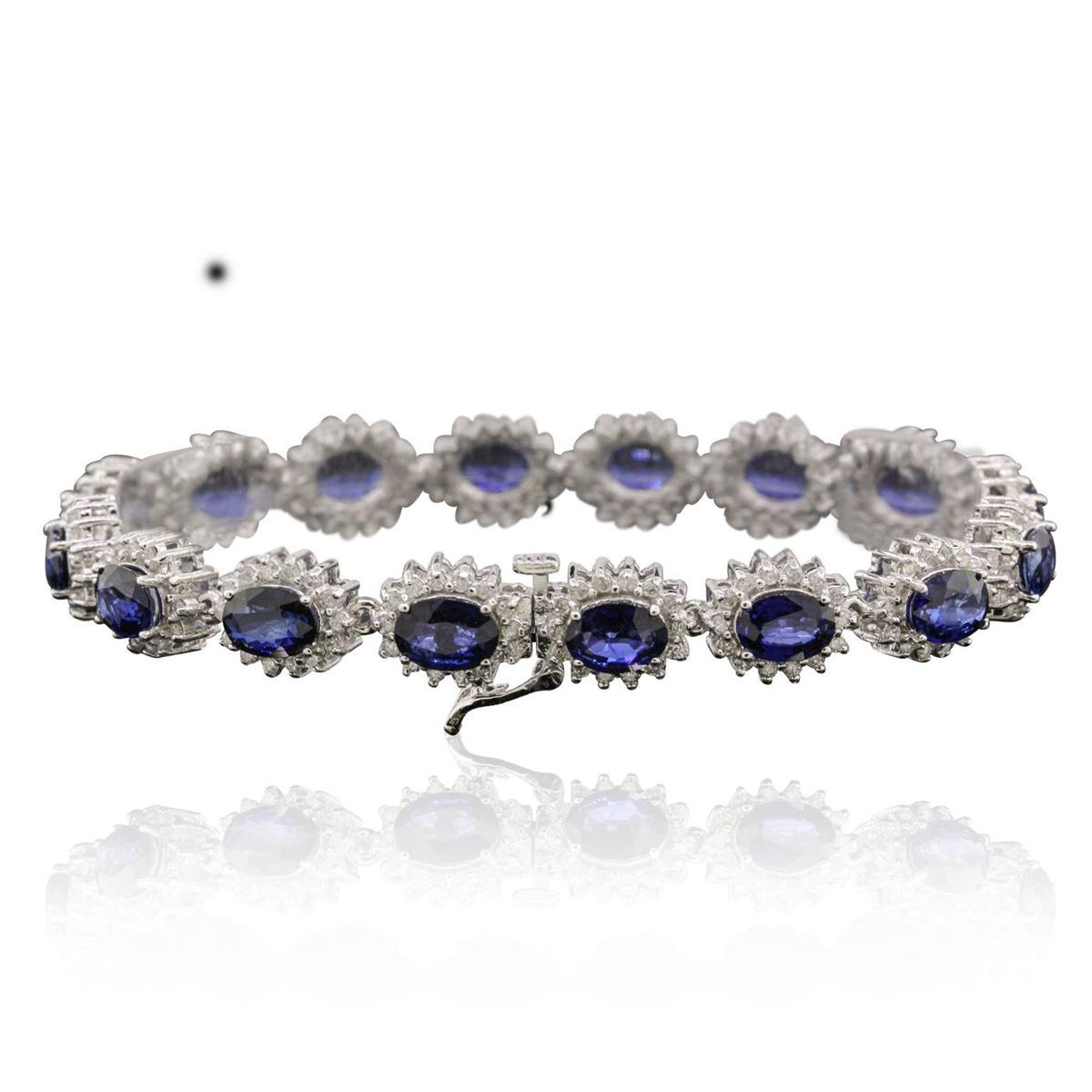 One electronically tested 14KT white gold ladies cast & assembled sapphire and diamond bracelet with a bright polish finish. Condition is new, good workmanship. Seven and one-quarter inch length bracelet features a flexible sapphire and diamond floret ribbon, terminating in a concealed clasp with safety. Identified with markings of "14K". Containing: Sixteen prong set oval mixed cut natural blue sapphires, measuring 6.90 x 5.00 x 2.60mm, 6%. bulge factor, approximate. Total Weight of 12.48ct., clarity is slightly included, type II, medium dark, moderately strong, blue color, (GIA B 6/4), cut is good. Transmitting light with a minimum of distortion, transparent. Naturally occurring internal & external characteristics are present. Measurements & the color grade are an average for the group. Indications of laboratory high temperature diffusion treatment. Graded in the setting. Two Hundred Twenty-Four prong set round brilliant cut diamonds, measuring 1.40 - 1.30 x 0.81mm (depth est.) approximate. Total Weight of 224 Stones = 2.10ct. Graded in the setting. Clarity: I-1 to I-2. Color: G - I. Total Weight of Colored Stones 12.48ct. Total Weight of Diamonds 2.10ct. Total Weight of Bracelet 20.85 grams. AIG Appraised at $13,905.00.
