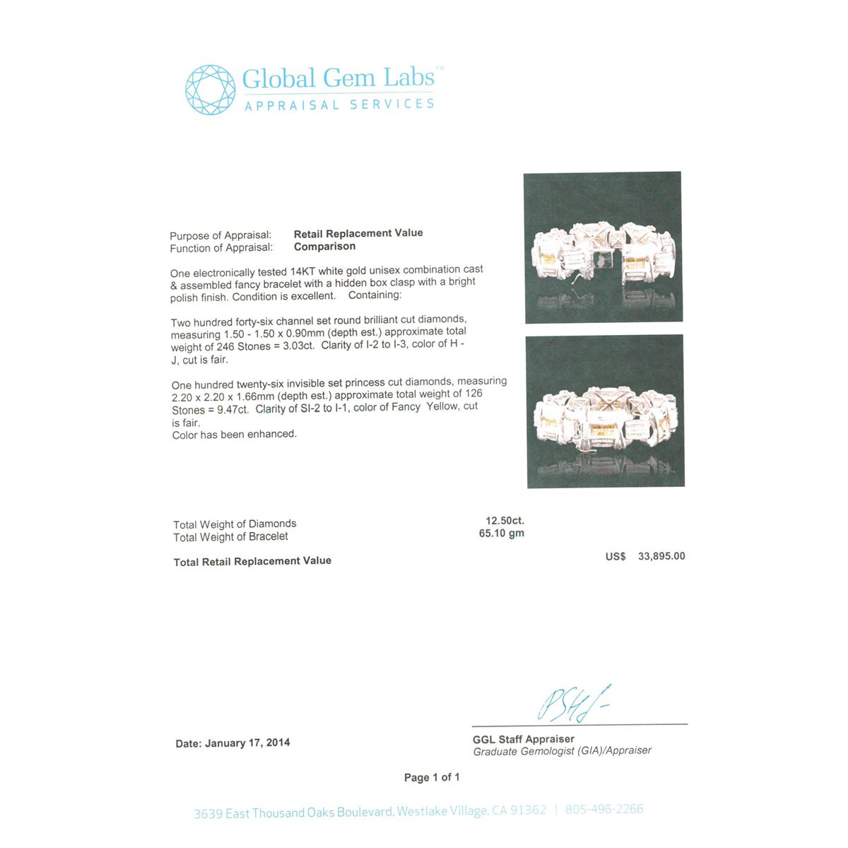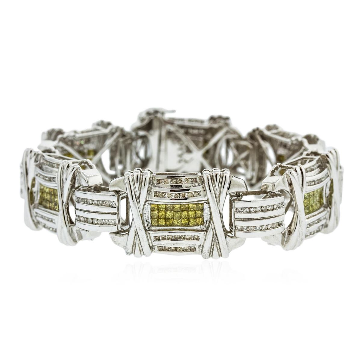 One electronically tested 14KT white gold unisex combination cast & assembled fancy bracelet with a hidden box clasp with a bright polish finish. Condition is excellent. Containing: Two Hundred Forty-Six channel set round brilliant cut diamonds, measuring 1.50 - 1.50 x 0.90mm (depth est.) approximate total weight of 246 Stones = 3.03ct. Clarity of I-2 to I-3, Color of H - J, Cut is Fair. One Hundred Twenty-Six invisible set princess cut diamonds, measuring 2.20 x 2.20 x 1.66mm (depth est.) approximate total weight of 126 Stones = 9.47ct. Clarity of SI-2 to I-1, Cut is Fair. Color has been enhanced. Total Weight of Diamonds 12.50ct. Total Weight of Bracelet 65.10gm. GGL Appraised at $33,895.00.