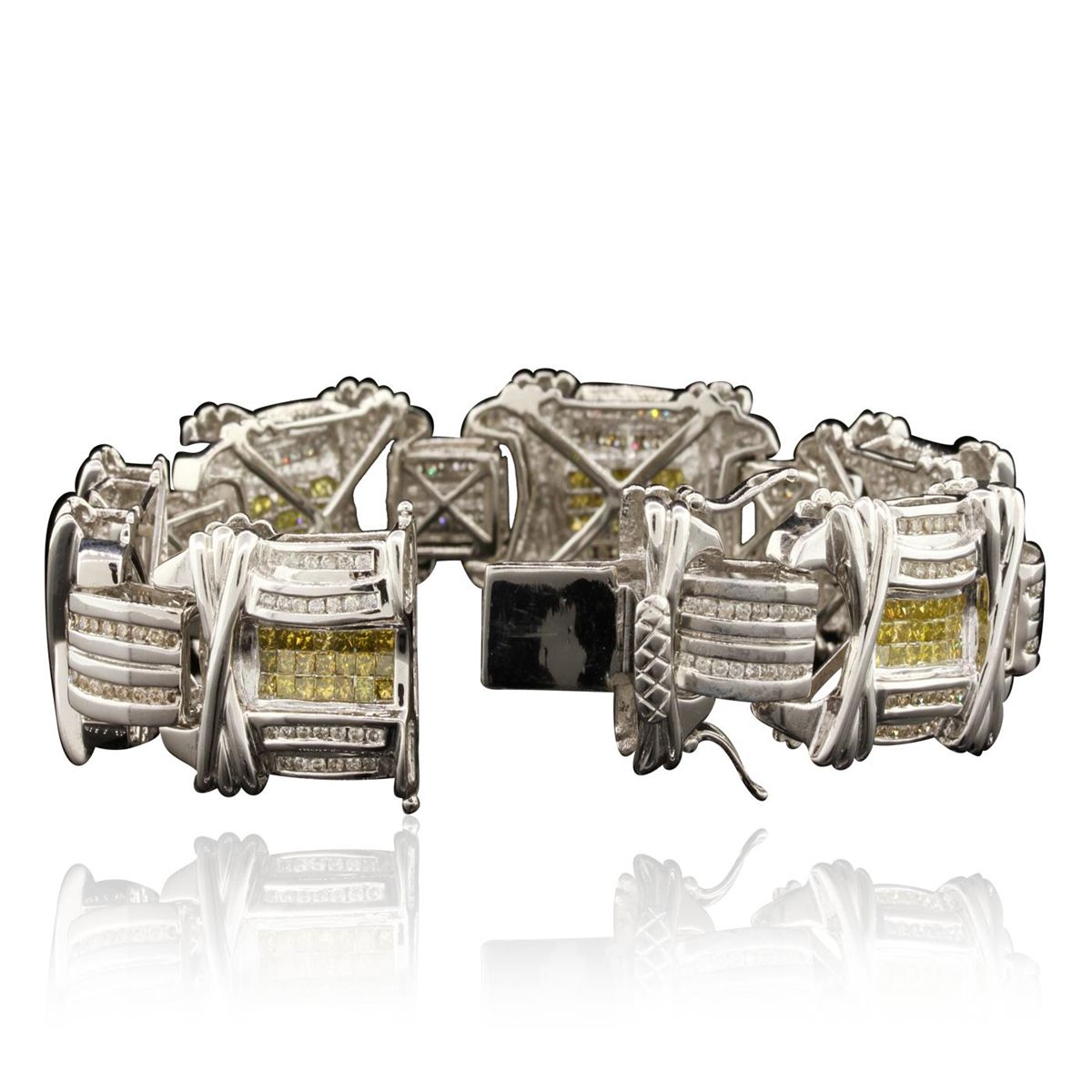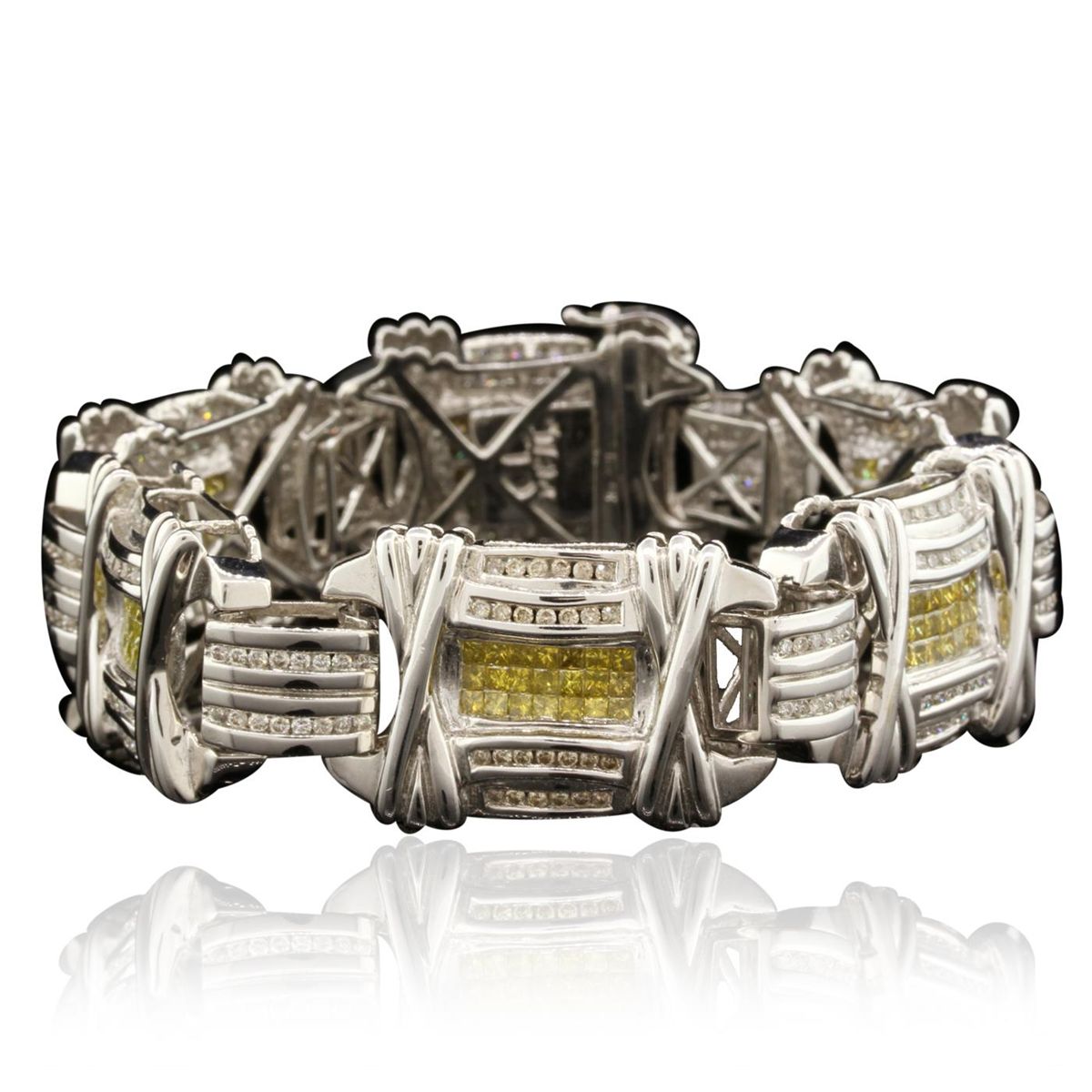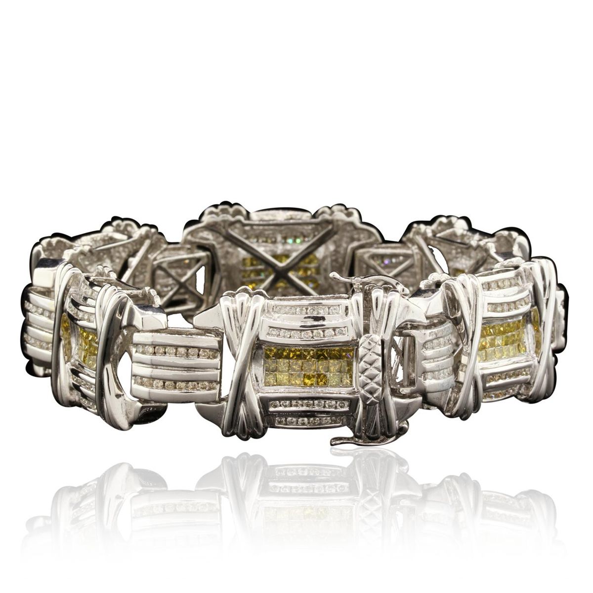 One electronically tested 14KT white gold unisex combination cast & assembled fancy bracelet with a hidden box clasp with a bright polish finish. Condition is excellent. Containing: Two Hundred Forty-Six channel set round brilliant cut diamonds, measuring 1.50 - 1.50 x 0.90mm (depth est.) approximate total weight of 246 Stones = 3.03ct. Clarity of I-2 to I-3, Color of H - J, Cut is Fair. One Hundred Twenty-Six invisible set princess cut diamonds, measuring 2.20 x 2.20 x 1.66mm (depth est.) approximate total weight of 126 Stones = 9.47ct. Clarity of SI-2 to I-1, Cut is Fair. Color has been enhanced. Total Weight of Diamonds 12.50ct. Total Weight of Bracelet 65.10gm. GGL Appraised at $33,895.00.