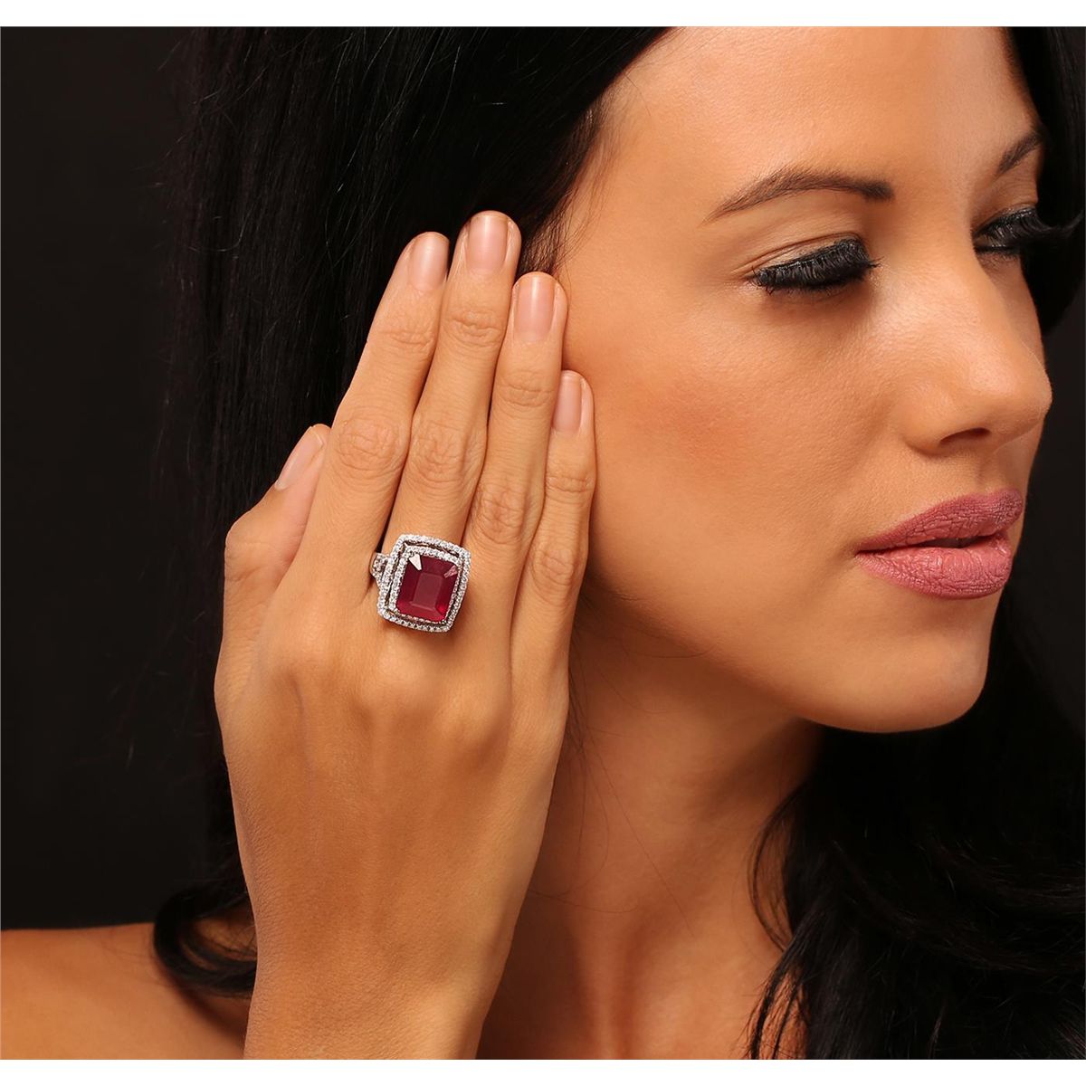 One electronically tested 14KT white gold Ladies combination cast & assembled fancy ring with a high polish finish. Condition is new. Identified with markings of "14K". Containing: One prong set oval emerald standard step cut natural ruby, measuring 12.00 x 14.00 x 10.35mm, approximate weight of 12.53ct., clarity is heavily included, type II, medium dark, moderately strong, strongly purplish red color, (GIA stpR 6/4), cut is good. Colored gemstones are presumed to have been subjected to commonly used color/clarity enhancement processes. One Hundred Fourteen bead set round brilliant cut diamonds, measuring 1.30 - 1.30 x 0.78mm (depth est.) approximate. Total Weight of 114 Stones = 1.26ct. Clarity: I-1 to I-2. Color: H - I, Cut is Good. Total Weight of Colored Stones 12.53ct. Total Weight of Diamonds 1.26ct. Total Weight of Ring 9.30 grams. GGL Appraised at $9,035.00.