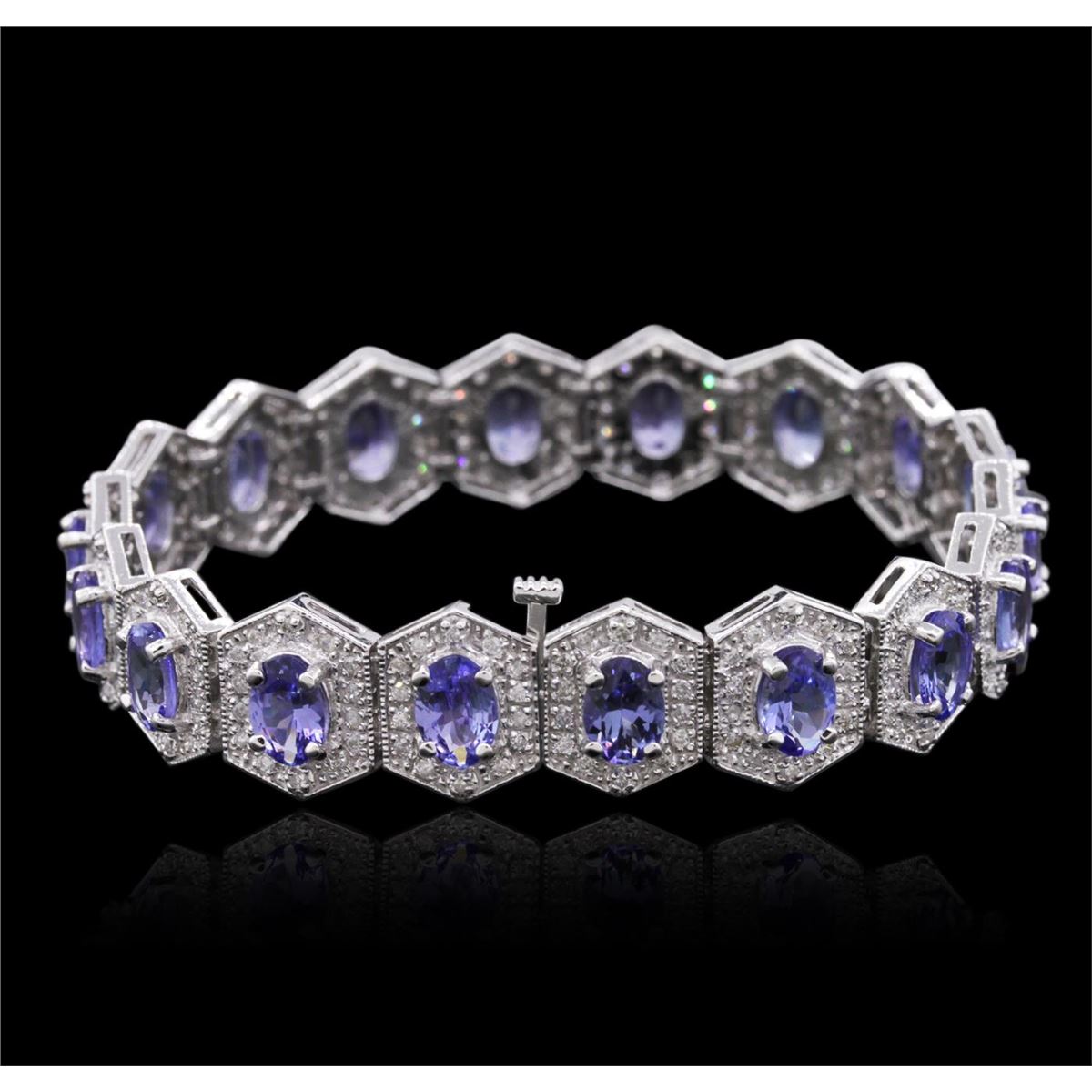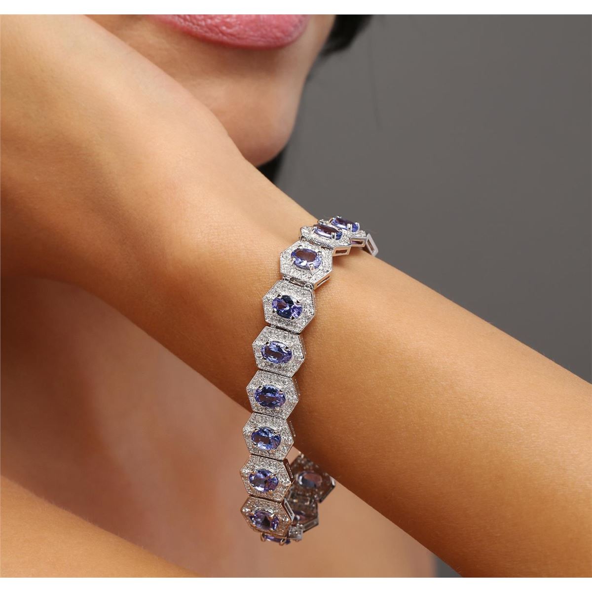 One electronically tested 14KT white gold ladies combination cast & assembled tanzanite and diamond bracelet with a hidden box clasp with a bright polish finish. Measurements: 7.25" in length. Identified with markings of "14K". Condition is new. Containing: Eighteen prong set oval modified brilliant cut natural tanzanites, measuring 7.50 x 4.50 x 2.93mm, approximate total weight of 12.60ct., clarity is eye clean, type I, medium, moderately strong, violet color, (GIA V 5/4), cut is good. Two Hundred Fifty-Two prong set round brilliant cut diamonds, measuring 1.30 - 1.30 x 0.78mm (depth est.) approximate total weight of 252 Stones = 2.02ct. Clarity: I-1 to I-2. Color: I - J, Cut is Good. Colored gemstones are presumed to have been subjected to commonly used enhancement processes. All diamonds and colored gemstones are graded in the mounting, unless otherwise stated. Total Weight of Colored Stones 12.60ct. Total Weight of Diamonds 2.02ct. Total Weight of Bracelet 27.90 grams. GGL Appraised at $15,365.00.