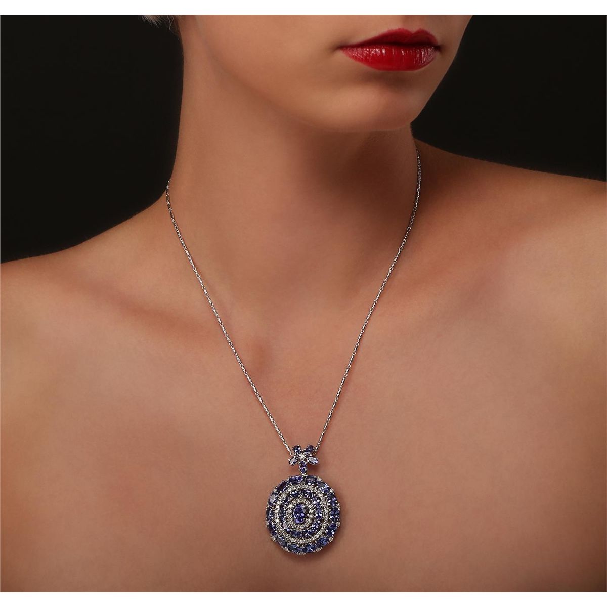 One electronically tested 14KT white gold Ladies combination cast & assembled pendant & chain 17.0" long, light fancy link with a lobster claw clasp with a bright polish finish. Condition is new. Identified with markings of "14K". Containing: One prong set oval modified brilliant cut natural tanzanite, measuring 7.80 x 6.40 x 4.16mm, approximate. Total Weight of 1.41ct., clarity is eye clean, type I, medium, moderately strong, bluish violet color, (GIA bV 5/4), cut is good. Fourteen prong set oval modified brilliant cut natural tanzanites, measuring 6.40 x 4.50 x 2.93mm, approximate. Total Weight of 8.12ct., clarity is eye clean, type I, medium, moderately strong, bluish violet color, (GIA bV 5/4), cut is good. Fifteen prong set oval modified brilliant cut natural tanzanites, measuring 5.00 x 3.00 x 1.95mm, approximate. Total Weight of 3.15ct., clarity is eye clean, type I, medium, moderately strong, bluish violet color, (GIA bV 5/4), cut is good. Colored gemstones are presumed to have been subjected to commonly used color/clarity enhancement processes. Sixty-Nine prong set round brilliant cut diamonds, measuring 1.50 - 1.50 x 0.90mm (depth est.) approximate. Total Weight of 69 Stones = 0.85ct. Clarity: I-1 to I-3. Color: H - I, Cut is Good. Total Weight of Colored Stones 12.68ct. Total Weight of Diamonds 0.85ct. Total Weight of Pendant & Chain 24.00 grams. GGL Appraised at $18,305.00.