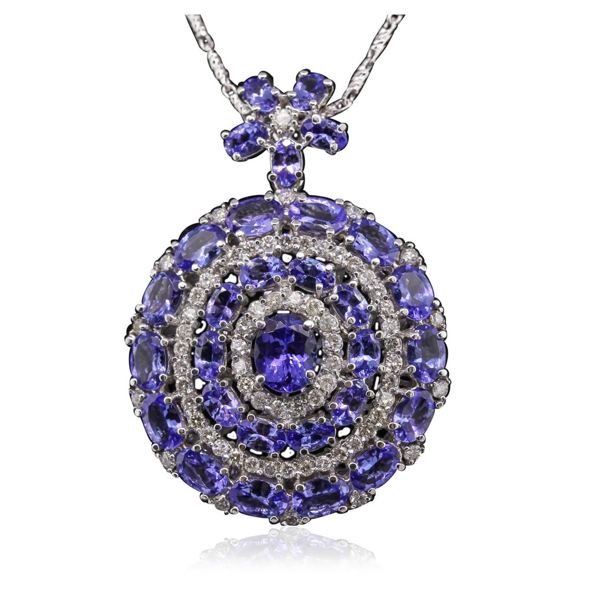 One electronically tested 14KT white gold Ladies combination cast & assembled pendant & chain 17.0" long, light fancy link with a lobster claw clasp with a bright polish finish. Condition is new. Identified with markings of "14K". Containing: One prong set oval modified brilliant cut natural tanzanite, measuring 7.80 x 6.40 x 4.16mm, approximate. Total Weight of 1.41ct., clarity is eye clean, type I, medium, moderately strong, bluish violet color, (GIA bV 5/4), cut is good. Fourteen prong set oval modified brilliant cut natural tanzanites, measuring 6.40 x 4.50 x 2.93mm, approximate. Total Weight of 8.12ct., clarity is eye clean, type I, medium, moderately strong, bluish violet color, (GIA bV 5/4), cut is good. Fifteen prong set oval modified brilliant cut natural tanzanites, measuring 5.00 x 3.00 x 1.95mm, approximate. Total Weight of 3.15ct., clarity is eye clean, type I, medium, moderately strong, bluish violet color, (GIA bV 5/4), cut is good. Colored gemstones are presumed to have been subjected to commonly used color/clarity enhancement processes. Sixty-Nine prong set round brilliant cut diamonds, measuring 1.50 - 1.50 x 0.90mm (depth est.) approximate. Total Weight of 69 Stones = 0.85ct. Clarity: I-1 to I-3. Color: H - I, Cut is Good. Total Weight of Colored Stones 12.68ct. Total Weight of Diamonds 0.85ct. Total Weight of Pendant & Chain 24.00 grams. GGL Appraised at $18,305.00.