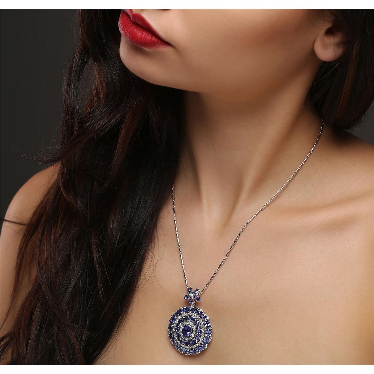 One electronically tested 14KT white gold Ladies combination cast & assembled pendant & chain 17.0" long, light fancy link with a lobster claw clasp with a bright polish finish. Condition is new. Identified with markings of "14K". Containing: One prong set oval modified brilliant cut natural tanzanite, measuring 7.80 x 6.40 x 4.16mm, approximate. Total Weight of 1.41ct., clarity is eye clean, type I, medium, moderately strong, bluish violet color, (GIA bV 5/4), cut is good. Fourteen prong set oval modified brilliant cut natural tanzanites, measuring 6.40 x 4.50 x 2.93mm, approximate. Total Weight of 8.12ct., clarity is eye clean, type I, medium, moderately strong, bluish violet color, (GIA bV 5/4), cut is good. Fifteen prong set oval modified brilliant cut natural tanzanites, measuring 5.00 x 3.00 x 1.95mm, approximate. Total Weight of 3.15ct., clarity is eye clean, type I, medium, moderately strong, bluish violet color, (GIA bV 5/4), cut is good. Colored gemstones are presumed to have been subjected to commonly used color/clarity enhancement processes. Sixty-Nine prong set round brilliant cut diamonds, measuring 1.50 - 1.50 x 0.90mm (depth est.) approximate. Total Weight of 69 Stones = 0.85ct. Clarity: I-1 to I-3. Color: H - I, Cut is Good. Total Weight of Colored Stones 12.68ct. Total Weight of Diamonds 0.85ct. Total Weight of Pendant & Chain 24.00 grams. GGL Appraised at $18,305.00.