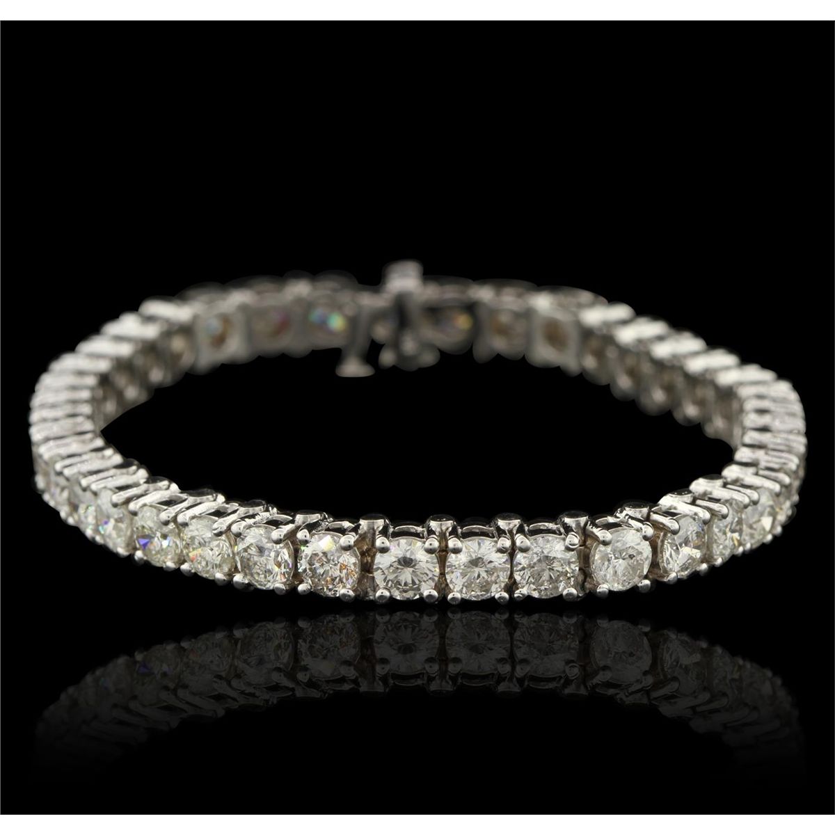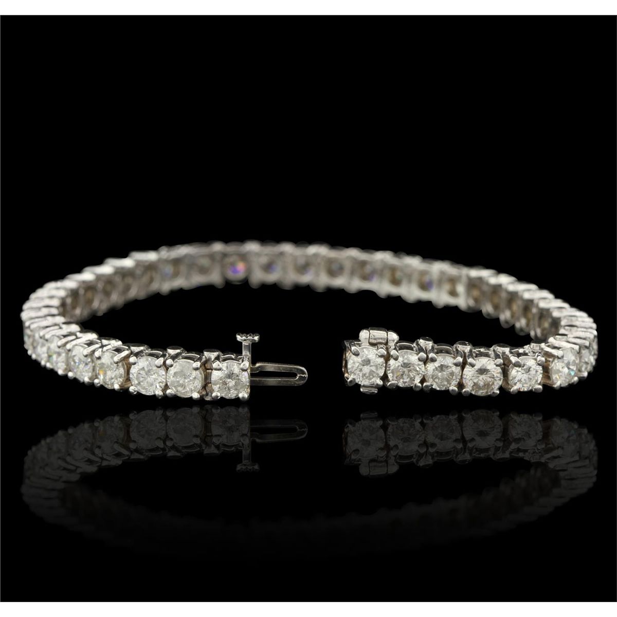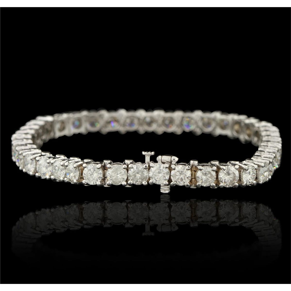 One electronically tested 14KT white gold ladies cast & assembled diamond tennis bracelet with a bright polish finish. Seven inch length bracelet composed of a flexible ribbon of diamonds, terminating in a concealed clasp with safety. Identified with markings of "14K". Condition is new, good workmanship. Tennis bracelets & necklaces got their unusual name from an incident involving the U.S. professional tennis player Chris Evert during a tennis match in the 1980's. Evert had been wearing an expensive diamond bracelet, an inline string of individually-set diamonds. Previously these bracelets were known as eternity bracelets. When the clasp snapped during play, she asked the officials to stop the tennis match until the bracelet could be found. Since that day, bracelets and necklaces featuring an inline string of diamonds have been called tennis bracelets and tennis necklaces. Containing: Thirty-nine prong set round brilliant cut diamonds, measuring 4.50 - 4.40 x 2.67mm (depth est.) approximate total weight of 39 Stones = 12.85ct. Graded in the setting. Clarity SI-2 to I-2. Color H - J. Total Weight of Diamonds 12.85ct. Total Weight of Tennis Bracelet 23.95gm. AIG Appraised at $56,000.00.