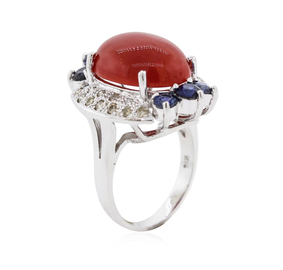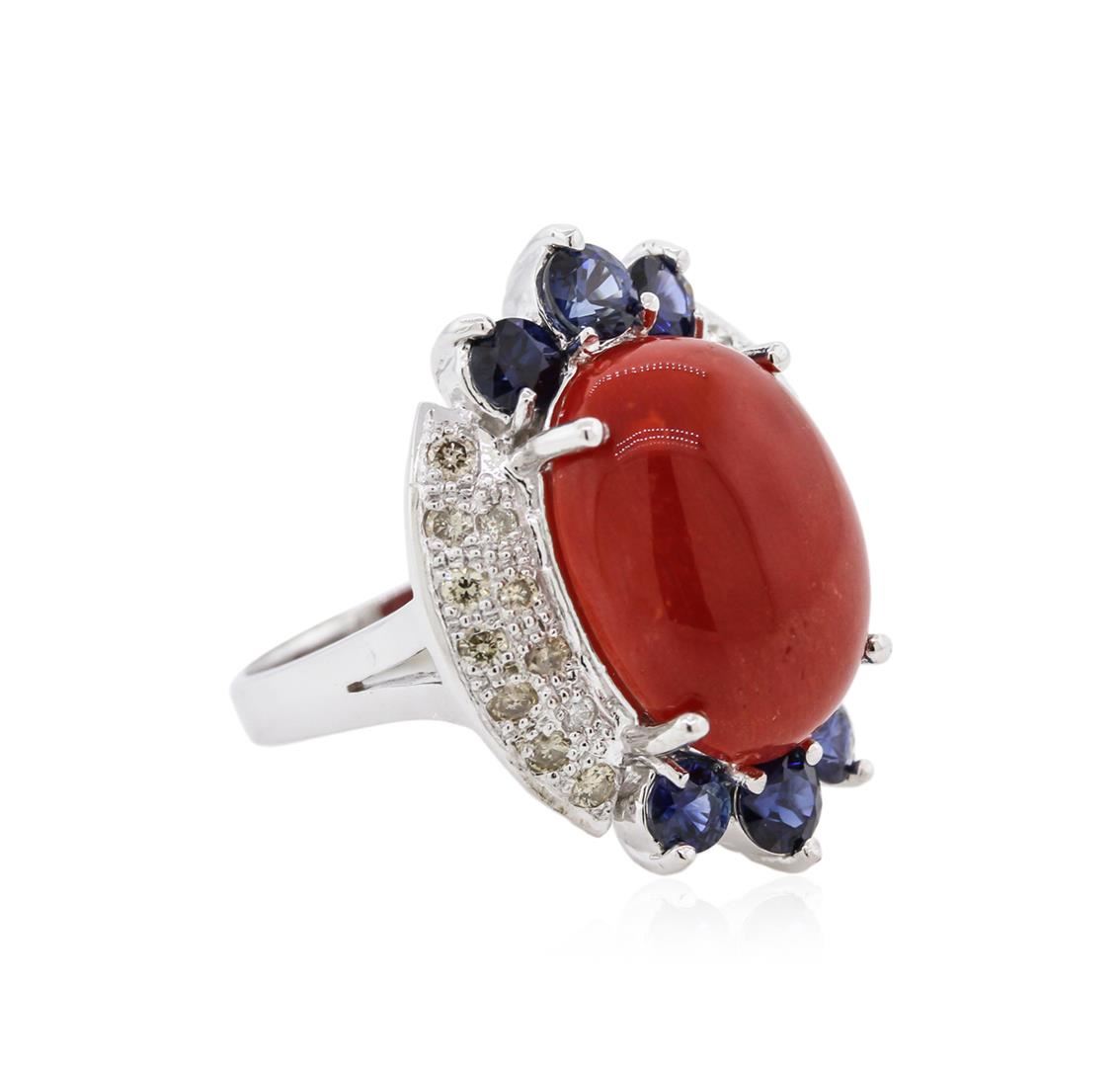 One electronically tested 14KT white gold ladies cast coral, sapphire and diamond ring with a bright polish finish. Identified with markings of "14K". Condition is new. Containing: One prong set oval cabochon cut natural red coral, measuring 15.00 x 11.00 x 7.15mm, approximate weight of 12.90ct., clarity is heavily included, medium, brownish, red color, (GIA R 5/1), cut is good. Six prong set round modified brilliant cut natural blue sapphires, measuring 4.00 - 4.00 x 2.60 mm, approximate total weight of 1.98ct., clarity is eye clean, type II, medium, moderately strong, blue color, (GIA B 5/4), cut is good. Twenty-Two prong set round brilliant cut diamonds, measuring 1.50 - 1.50 x 0.90mm (depth est.) approximate total weight of 22 Stones = 0.27ct. Clarity: I-1. Color: J - K, Cut is Good. All diamonds and colored gemstones are graded in the mounting, unless otherwise stated. Colored gemstones are presumed to have been subjected to commonly used enhancement processes. Total Weight of Colored Stones 14.88ct. Total Weight of Diamonds 0.27ct. Total Weight of Ring 8.00 grams. GGL Appraised at $3,955.00.