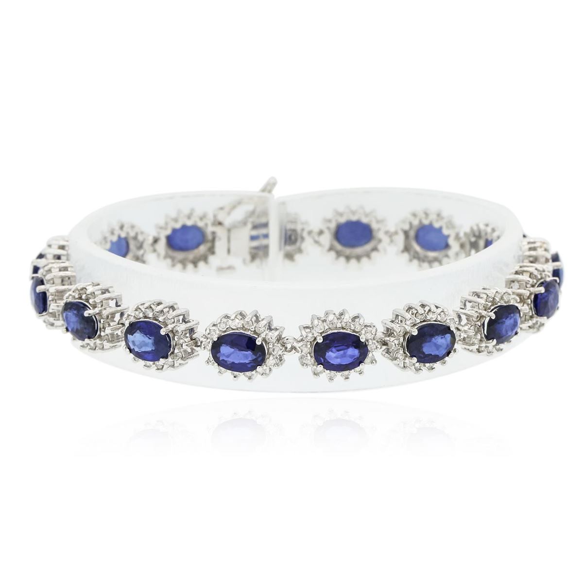 One electronically tested 14KT white gold ladies cast & assembled sapphire and diamond bracelet with a bright polish finish. Condition is new, good workmanship. Seven and one-quarter inch length bracelet features a flexible sapphire and diamond floret ribbon, terminating in a concealed clasp with safety. Identified with markings of "14K". Containing: Sixteen prong set oval mixed cut natural blue sapphires, measuring 7.00 x 5.00 x 2.60mm, 8%. bulge factor, approximate. Total Weight of 12.96ct., clarity is slightly included, type II, medium dark, moderately strong, blue color, (GIA B 6/4), cut is good. Transmitting light with a minimum of distortion, transparent. Naturally occurring internal & external characteristics are present. Measurements & the color grade are an average for the group. Indications of laboratory high temperature diffusion treatment. Graded in the setting. Two Hundred Twenty-Four prong set round brilliant cut diamonds, measuring 1.40 - 1.30 x 0.81mm (depth est.) approximate. Total Weight of 224 Stones = 2.11ct. Graded in the setting. Clarity: I-1 to I-2. Color: G - I. Total Weight of Colored Stones 12.96ct. Total Weight of Diamonds 2.11ct. Total Weight of Bracelet 21.65 grams. AIG Appraised at $14,240.00.