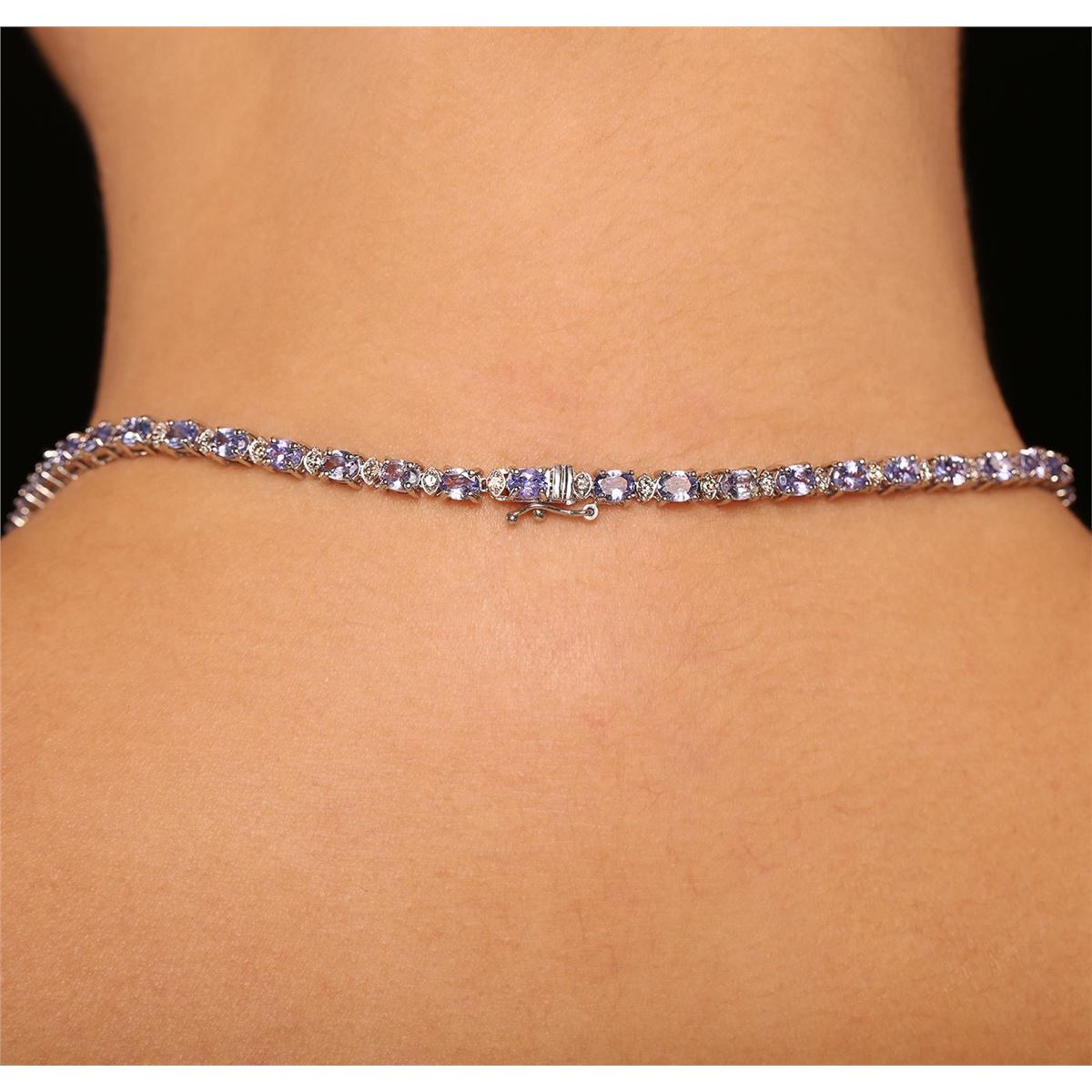 One electronically tested 14KT white gold ladies cast & assembled tanzanite and diamond necklace. Condition is new, good workmanship. Eighteen and one-half inch length necklace features a flexible tanzanite and diamond ribbon, terminating in a concealed clasp with safety. Bright polish finish. Identified with markings of "K14". Containing: Seventy-two prong set oval mixed cut natural tanzanites, measuring 4.20 x 3.10 x 2.00mm, approximate. Total Weight of 12.96ct., clarity is slightly included, type I, medium, very slightly grayish, bluish violet color, (GIA bV 5/3), cut is good. Transmitting light with a minimum of distortion, transparent. Naturally occurring internal & external characteristics are present. Measurements & the color grade are an average for the group. Graded in the setting. Tanzanite is a very rare gemstone that is only found in the country of Tanzania. Originally discovered in 1967. Tiffany & Company, named the stone Tanzanite. It is found in the Usumburu Mountains that border the Umba Valley of northern Tanzania. Tanzanite occurs in gray, brown, violet, blue, reddish-purple, & green. The gem is interesting because of its exceptional pleochroism. Rotated in different directions a tanzanite will exhibit multiple changes of color. Tanzanite has a low tolerance to ultrasonic cleaning, and should not be cleaned using this method. Seventy-Two prong set round brilliant cut diamonds, measuring 1.70 - 1.60 x 0.99mm (depth est.) approximate. Total Weight of 72 Stones = 1.28ct. Graded in the setting. Clarity: SI-1 to I-1. Color: H - J. Total Weight of Colored Stones 12.96ct. Total Weight of Diamonds 1.28ct. Total Weight of Necklace 20.32 grams. AIG Appraised at $13,955.00.