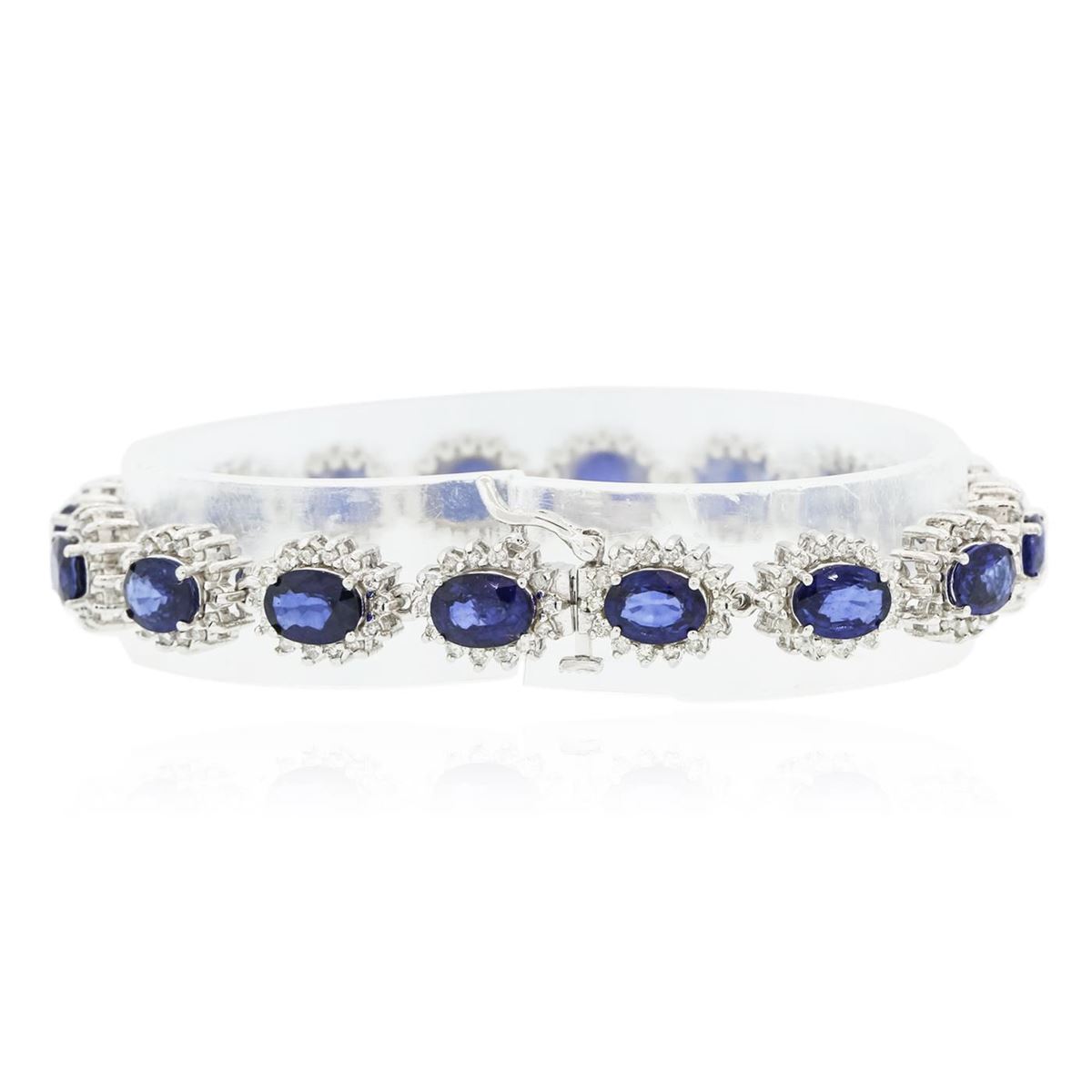 One electronically tested 14KT white gold ladies cast & assembled sapphire and diamond bracelet with a bright polish finish. Condition is new, good workmanship. Seven and one-quarter inch length bracelet features a flexible sapphire and diamond floret ribbon, terminating in a concealed clasp with safety. Identified with markings of "14K". Containing: Sixteen prong set oval mixed cut natural blue sapphires, measuring 7.00 x 5.00 x 2.60mm, 8%. bulge factor, approximate. Total Weight of 12.96ct., clarity is slightly included, type II, medium dark, moderately strong, blue color, (GIA B 6/4), cut is good. Transmitting light with a minimum of distortion, transparent. Naturally occurring internal & external characteristics are present. Measurements & the color grade are an average for the group. Indications of laboratory high temperature diffusion treatment. Graded in the setting. Two Hundred Twenty-Four prong set round brilliant cut diamonds, measuring 1.40 - 1.30 x 0.81mm (depth est.) approximate. Total Weight of 224 Stones = 2.11ct. Graded in the setting. Clarity: I-1 to I-2. Color: G - I. Total Weight of Colored Stones 12.96ct. Total Weight of Diamonds 2.11ct. Total Weight of Bracelet 21.65 grams. AIG Appraised at $14,240.00.