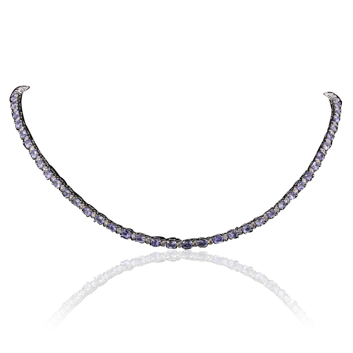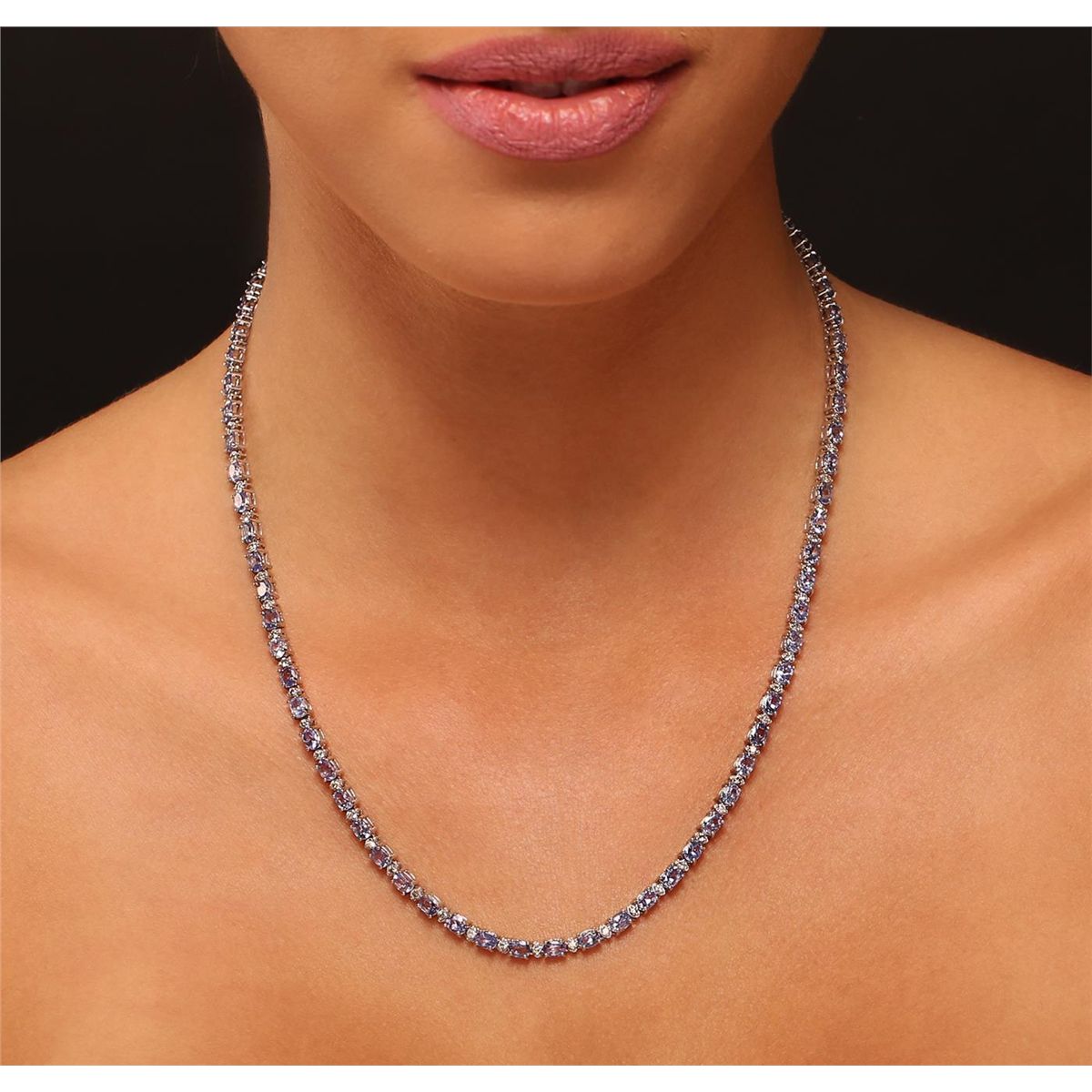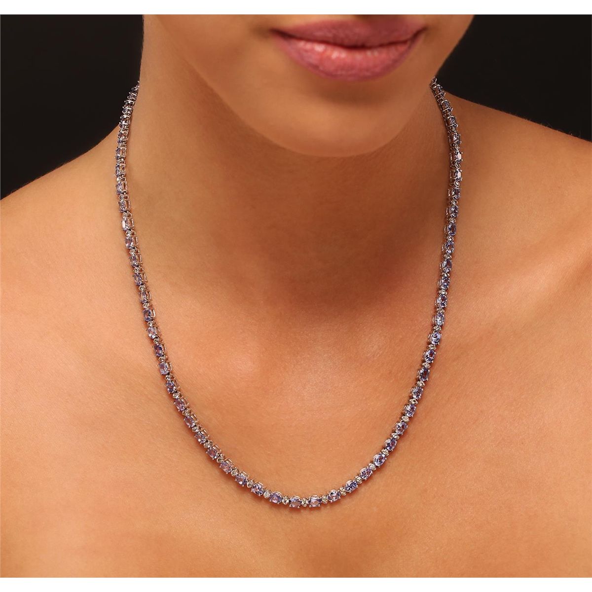 One electronically tested 14KT white gold ladies cast & assembled tanzanite and diamond necklace. Condition is new, good workmanship. Eighteen and one-half inch length necklace features a flexible tanzanite and diamond ribbon, terminating in a concealed clasp with safety. Bright polish finish. Identified with markings of "K14". Containing: Seventy-two prong set oval mixed cut natural tanzanites, measuring 4.20 x 3.10 x 2.00mm, approximate. Total Weight of 12.96ct., clarity is slightly included, type I, medium, very slightly grayish, bluish violet color, (GIA bV 5/3), cut is good. Transmitting light with a minimum of distortion, transparent. Naturally occurring internal & external characteristics are present. Measurements & the color grade are an average for the group. Graded in the setting. Tanzanite is a very rare gemstone that is only found in the country of Tanzania. Originally discovered in 1967. Tiffany & Company, named the stone Tanzanite. It is found in the Usumburu Mountains that border the Umba Valley of northern Tanzania. Tanzanite occurs in gray, brown, violet, blue, reddish-purple, & green. The gem is interesting because of its exceptional pleochroism. Rotated in different directions a tanzanite will exhibit multiple changes of color. Tanzanite has a low tolerance to ultrasonic cleaning, and should not be cleaned using this method. Seventy-Two prong set round brilliant cut diamonds, measuring 1.70 - 1.60 x 0.99mm (depth est.) approximate. Total Weight of 72 Stones = 1.28ct. Graded in the setting. Clarity: SI-1 to I-1. Color: H - J. Total Weight of Colored Stones 12.96ct. Total Weight of Diamonds 1.28ct. Total Weight of Necklace 20.32 grams. AIG Appraised at $13,955.00.