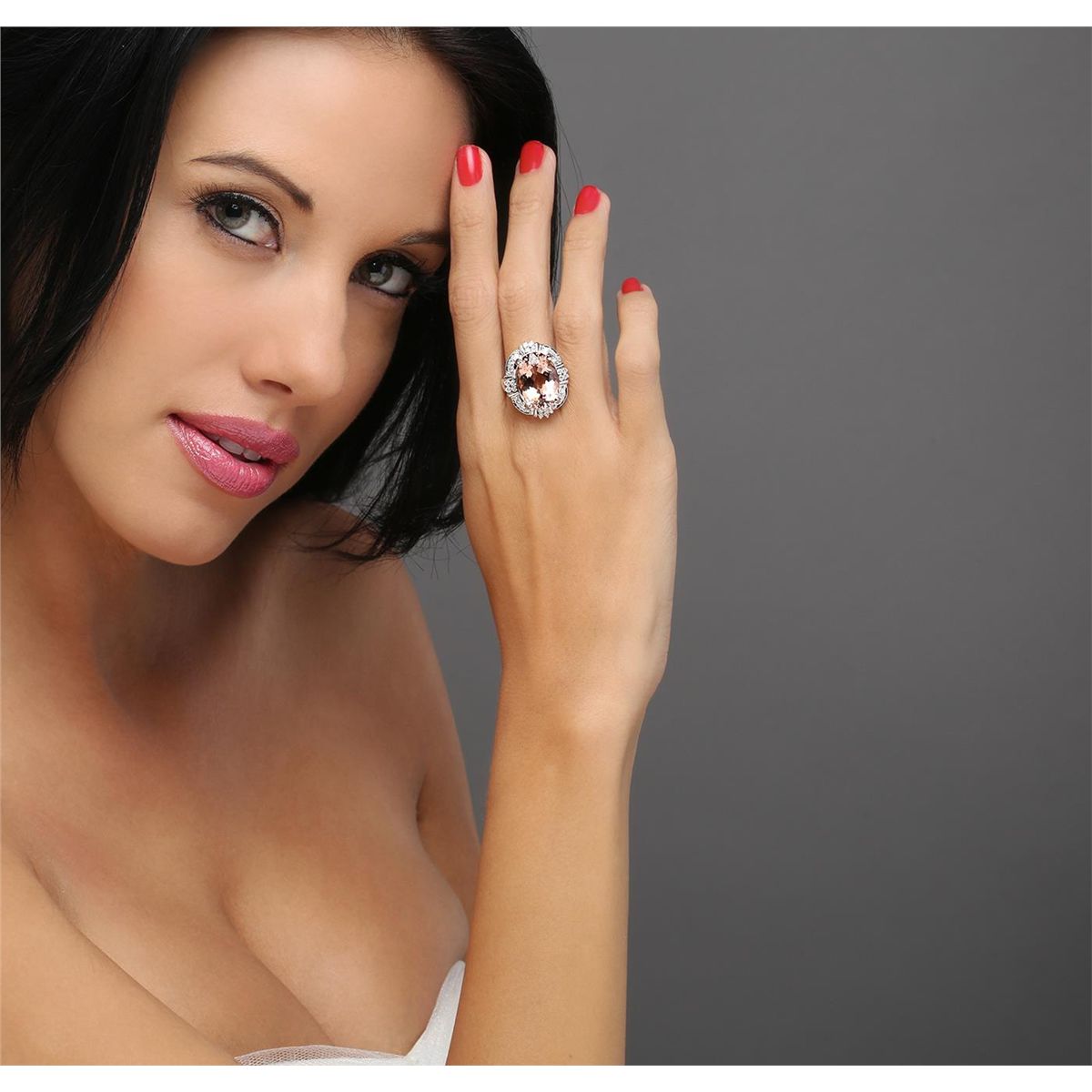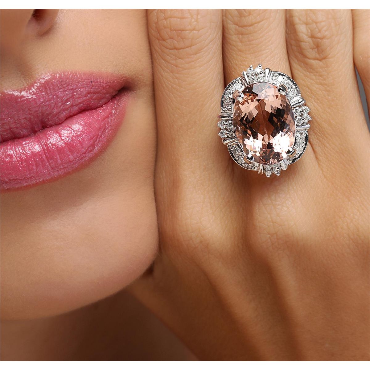 One electronically tested 14KT white gold ladies combination cast & assembled morganite and diamond ring with a bright polish finish. Identified with markings of "K14". Condition is new. Containing: One prong set oval modified brilliant cut natural morganite, measuring 18.25 x 13.29 x 9.44mm, approximate weight of 13.08ct., clarity is eye clean, type I, light, brownish, red orange color, (GIA RO 3/1), cut is good. Twenty-Eight prong set round brilliant cut diamonds, measuring 1.80 - 1.60 x 1.02mm (depth est.) approximate total weight of 28 Stones = 0.50ct. Clarity: SI-2 to I-1. Color: I - J, Cut is Good. Colored gemstones are presumed to have been subjected to commonly used enhancement processes. All diamonds and colored gemstones are graded in the mounting, unless otherwise stated. Total Weight of Colored Stones 13.08ct. Total Weight of Diamonds 0.50ct. Total Weight of Ring 11.50 grams. GGL Appraised at $7,135.00.