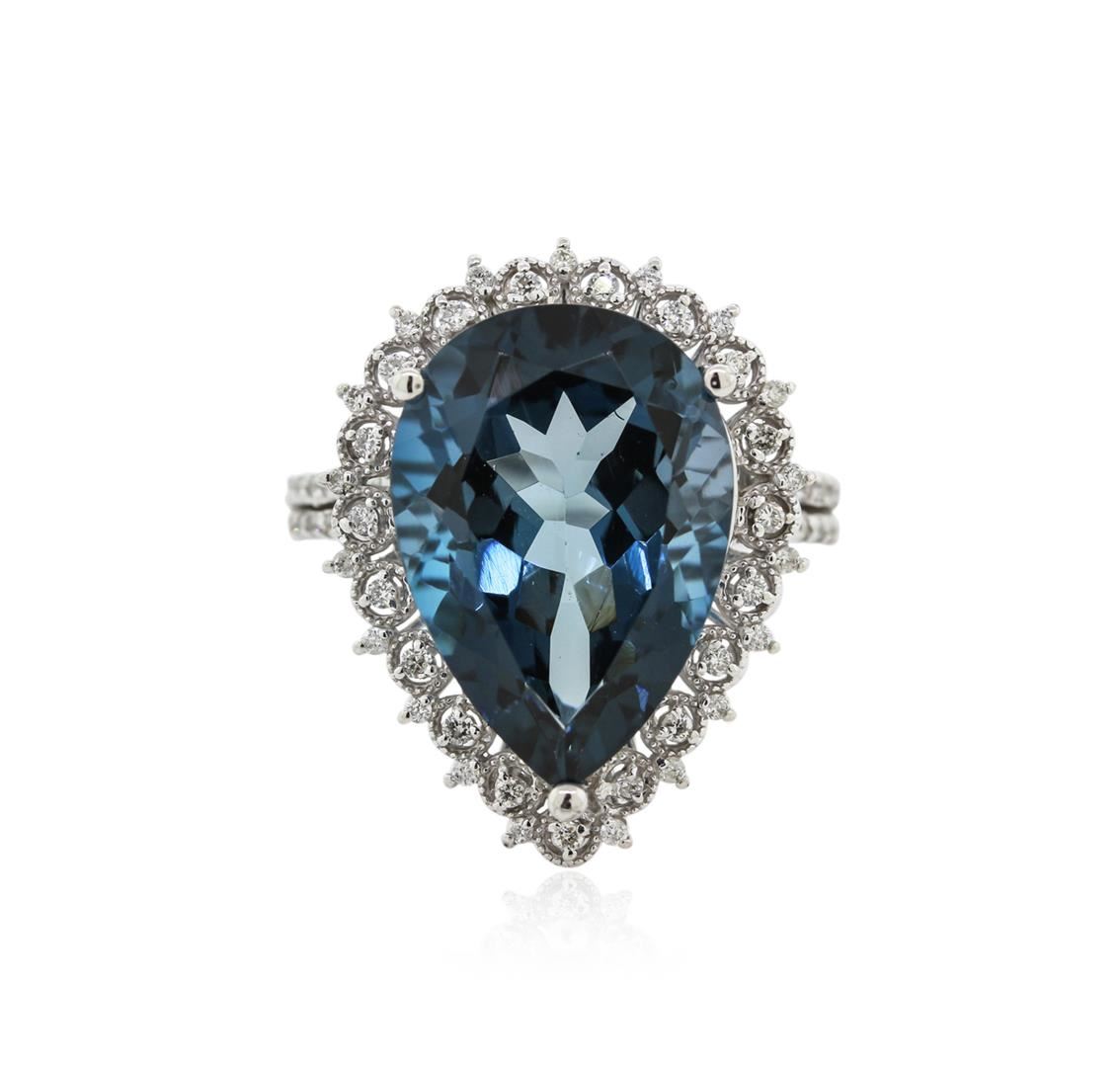 One electronically tested 14KT white gold ladies cast topaz and diamond ring with a split shoulder shank with a bright polish finish. Identified with markings of "14K". Condition is new. Containing: One prong set pear modified brilliant cut natural blue topaz, measuring 18.80 x 13.00 x 8.45mm, approximate weight of 13.10ct., clarity is eye clean, type I, medium, very slightly grayish, very slightly greenish blue color, (GIA vslgB 5/3), cut is good. Sixty-Six prong set round brilliant cut diamonds, measuring 1.20 - 1.20 x 0.72mm (depth est.) approximate total weight of 66 Stones = 0.39ct. Clarity: SI-2 to I-1. Color: H - I, Cut is Good. All diamonds and colored gemstones are graded in the mounting, unless otherwise stated. Colored gemstones are presumed to have been subjected to commonly used enhancement processes.. Total Weight of Colored Stones 13.10ct. Total Weight of Diamonds 0.39ct. Total Weight of Ring 8.90 grams. GGL Appraised at $3,090.00.