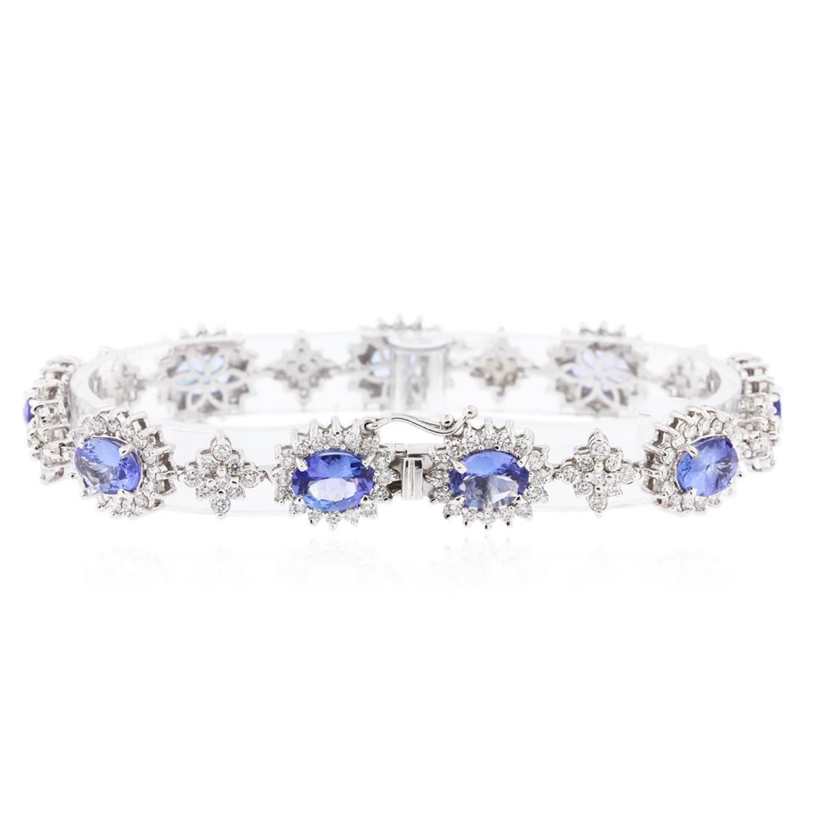 One electronically tested 14KT white gold ladies cast tanzanite and diamond bracelet with a hidden box clasp with safety closer with a bright polish finish. Measurements: 7.25" in length Identified with markings of "14K". Condition is new. Containing: Nine prong set oval modified brilliant cut natural tanzanites, measuring 8.30 x 6.20 x 4.03mm, approximate total weight of 13.14ct., clarity is eye clean, type I, medium light, very slightly grayish, violet color, (GIA V 4/3), cut is good. Two Hundred Sixteen prong set round brilliant cut diamonds, measuring 1.80 - 1.80 x 1.08mm (depth est.) approximate total weight of 216 Stones = 4.60ct. Clarity: SI-1 to SI-2. Color: I - J. Colored gemstones are presumed to have been subjected to commonly used enhancement processes, All diamonds and colored gemstones are graded in the mounting, unless otherwise stated. Total Weight of Colored Stones 13.14ct. Total Weight of Diamonds 4.60ct. Total Weight of Bracelet 23.40 grams. GGL Appraised at $13,955.00.