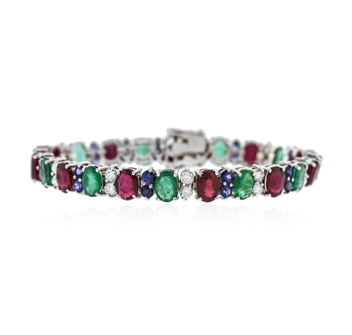 One electronically tested 14KT white gold ladies cast emerald, ruby, sapphire and diamond bracelet with a hidden box clasp with a bright polish finish. Measurements: 6.75" in length Identified with markings of "14K". Condition is new. Containing: Eleven prong set oval modified brilliant cut natural emeralds, measuring 6.80 x 5.50 x 3.58mm, approximate total weight of 8.36ct., clarity is moderately included, type III, medium light, very slightly grayish, green color, (GIA G 4/3), cut is good. Eleven prong set oval modified brilliant cut natural rubies, measuring 7.00 x 5.60 x 3.64mm, approximate total weight of 13.20ct., clarity is heavily included, type II, medium dark, moderately strong, strongly purplish red color, (GIA stpR 6/4), cut is good. Twenty-two prong set round modified brilliant cut natural blue sapphires, measuring 3.00 - 3.00 x 1.95 mm, approximate total weight of 3.08ct., clarity is eye clean, type II, medium, moderately strong, blue color, (GIA B 5/4), cut is good. Twenty-Two prong set round brilliant cut diamonds, measuring 2.90 - 2.90 x 1.74mm (depth est.) approximate total weight of 22 Stones = 1.96ct. Clarity: SI-1 to SI-2. Color: I - J, Cut is Good. Colored gemstones are presumed to have been subjected to commonly used enhancement processes. All diamonds and colored gemstones are graded in the mounting, unless otherwise stated. Total Weight of Colored Stones 24.64ct. Total Weight of Diamonds 1.96ct. Total Weight of Diamond Bracelet 19.80 grams. GGL Appraised at $8,495.00.