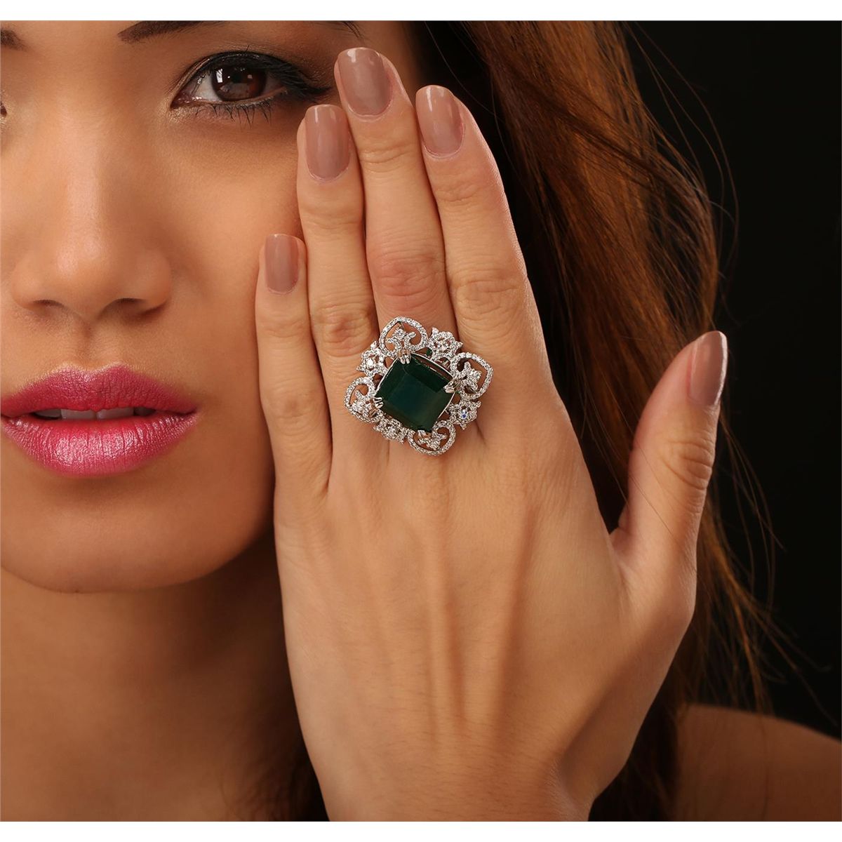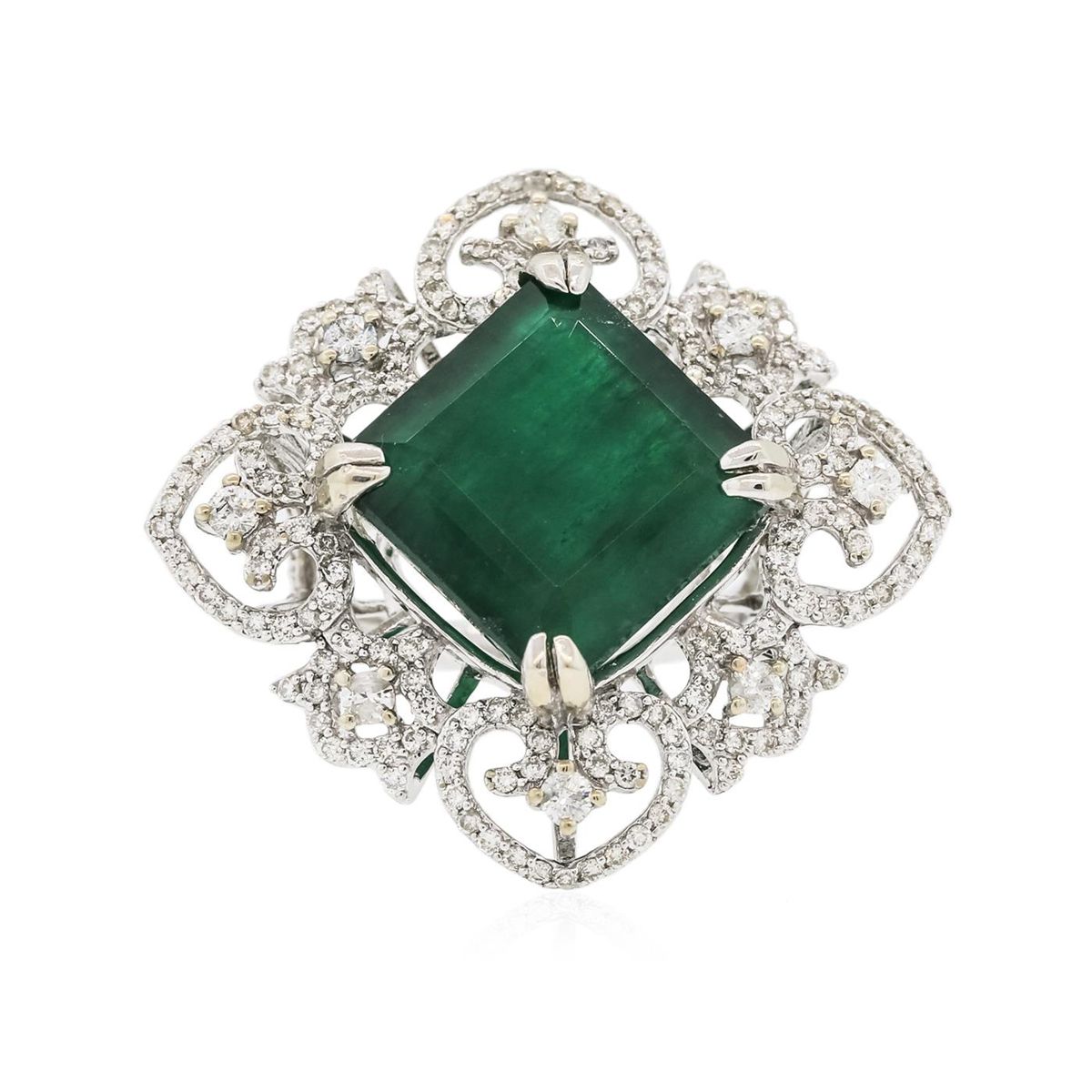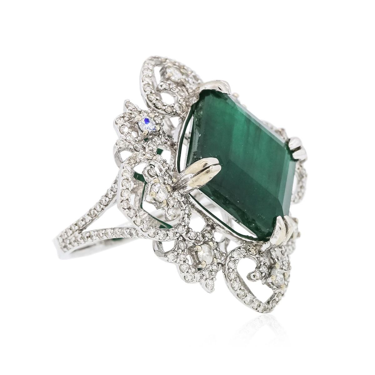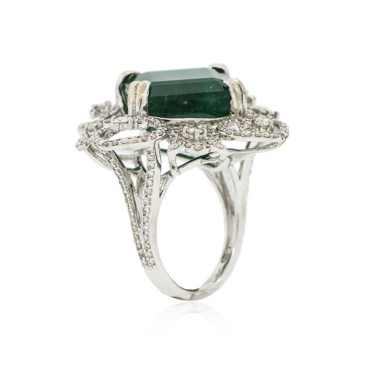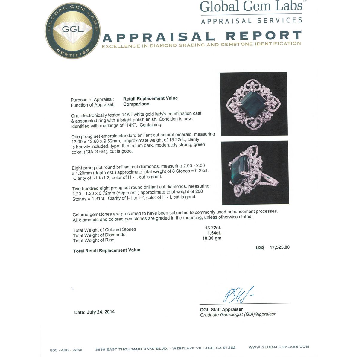 One electronically tested 14KT white gold ladies combination cast & assembled ring with a bright polish finish. Condition is new. Identified with markings of "14K". Containing: One prong set emerald standard brilliant cut natural emerald, measuring 13.90 x 13.60 x 9.52mm, approximate weight of 13.22ct., clarity is heavily included, type III, medium dark, moderately strong, green color, (GIA G 6/4), cut is good. Eight prong set round brilliant cut diamonds, measuring 2.00 - 2.00 x 1.20mm (depth est.) approximate total weight of 8 Stones = 0.23ct. Clarity: I-1 to I-2. Color: H - I, Cut is Good. Two Hundred Eight prong set round brilliant cut diamonds, measuring 1.20 - 1.20 x 0.72mm (depth est.) approximate total weight of 208 Stones = 1.31ct. Clarity: I-1 to I-2. Color: H - I, Cut is Good. Colored gemstones are presumed to have been subjected to commonly used enhancement processes. All diamonds and colored gemstones are graded in the mounting, unless otherwise stated. Total Weight of Colored Stones 13.22ct. Total Weight of Diamonds 1.54ct. Total Weight of Ring 10.30 grams. GGL Appraised at $17,525.00.