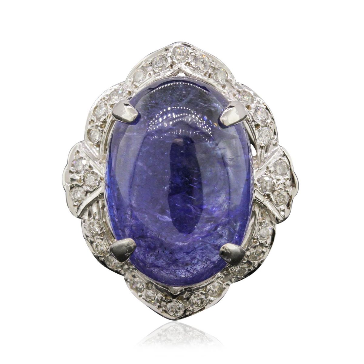 One electronically tested 14KT white gold ladies combination cast & assembled ring with a bright polish finish. Condition is new. Identified with markings of "14K". Containing: One prong set oval cabochon cut natural tanzanite, measuring 20.07 x 10.46 x 6.97mm, approximate weight of 13.23ct., clarity is moderately included, type I, medium light, very slightly grayish, bluish violet color, (GIA bV 4/3), cut is good. Twenty prong set round brilliant cut diamonds, measuring 1.80 - 1.80 x 1.08mm (depth est.) approximate. Total Weight of 20 Stones = 0.43ct. Clarity: I-1 to I-2. Color: I - J, Cut is Good. Colored gemstones are presumed to have been subjected to commonly used enhancement processes. All diamonds and colored gemstones are graded in the mounting, unless otherwise stated. Total Weight of Colored Stones 13.23ct. Total Weight of Diamonds 0.43ct. Total Weight of Ring 12.60 grams. GGL Appraised at $12,755.00.