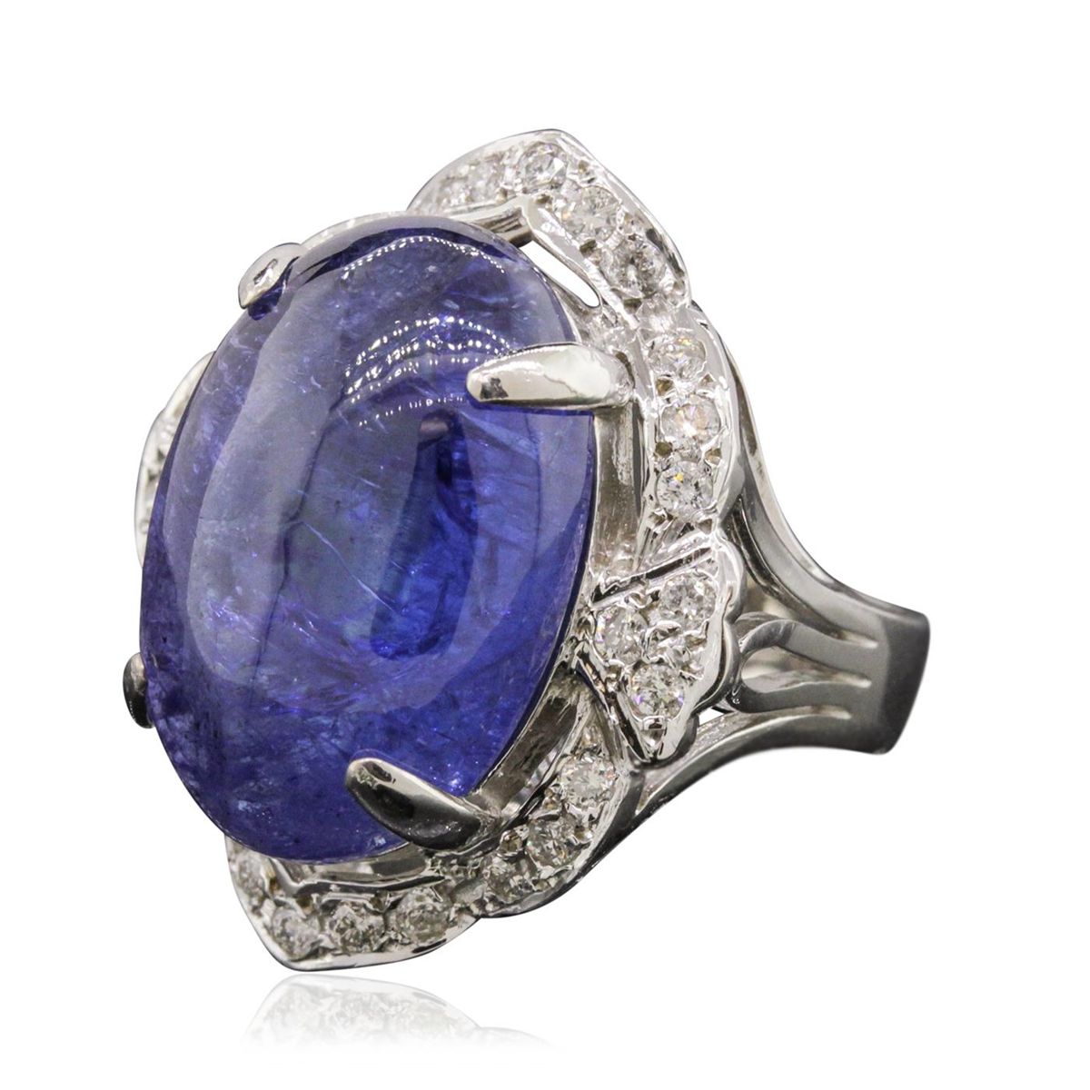 One electronically tested 14KT white gold ladies combination cast & assembled ring with a bright polish finish. Condition is new. Identified with markings of "14K". Containing: One prong set oval cabochon cut natural tanzanite, measuring 20.07 x 10.46 x 6.97mm, approximate weight of 13.23ct., clarity is moderately included, type I, medium light, very slightly grayish, bluish violet color, (GIA bV 4/3), cut is good. Twenty prong set round brilliant cut diamonds, measuring 1.80 - 1.80 x 1.08mm (depth est.) approximate. Total Weight of 20 Stones = 0.43ct. Clarity: I-1 to I-2. Color: I - J, Cut is Good. Colored gemstones are presumed to have been subjected to commonly used enhancement processes. All diamonds and colored gemstones are graded in the mounting, unless otherwise stated. Total Weight of Colored Stones 13.23ct. Total Weight of Diamonds 0.43ct. Total Weight of Ring 12.60 grams. GGL Appraised at $12,755.00.