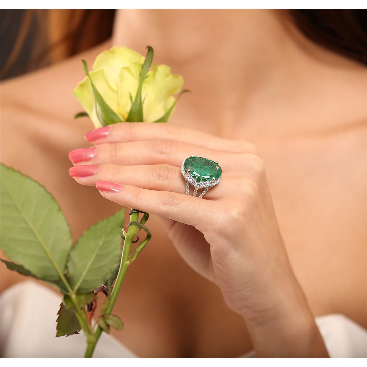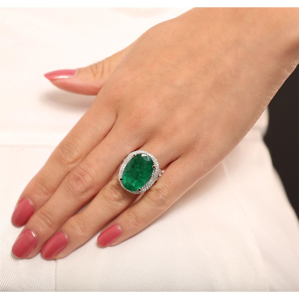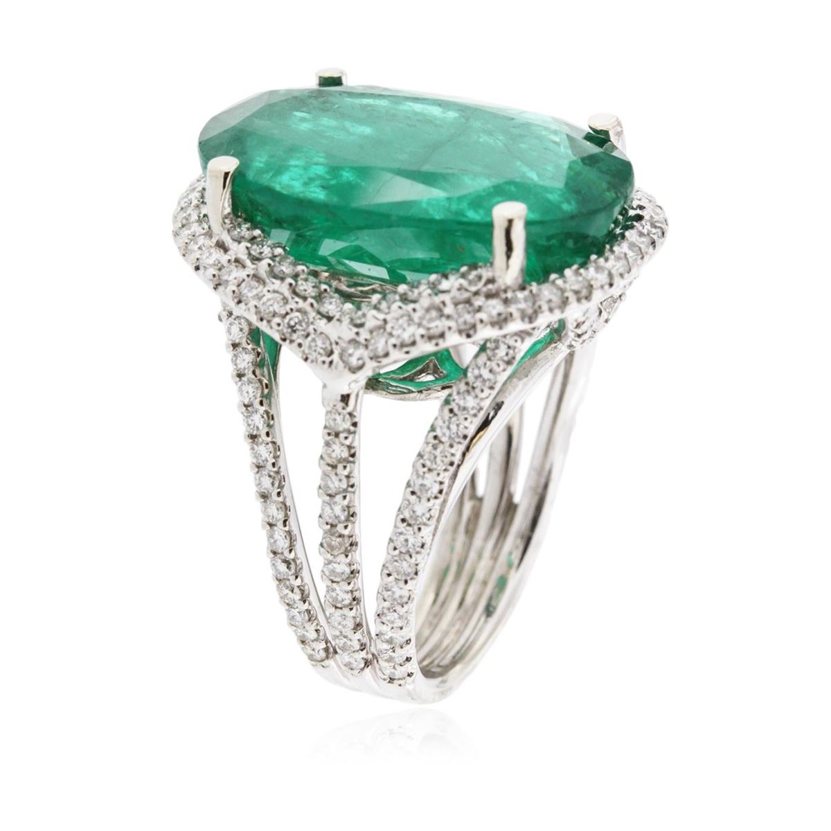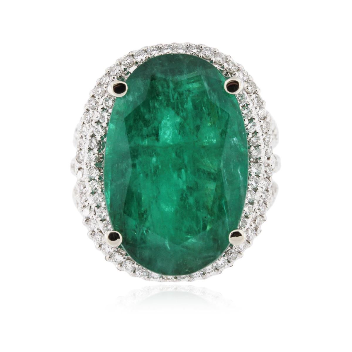 One electronically tested 14KT white gold ladies cast emerald and diamond ring with a bright polish finish. Condition is good. The featured emerald is set within a diamond lattice gallery, supported by diamond set three-way split shoulders and completed by a four and one-half millimeter wide band. Identified with markings of "14K". Containing: One prong set oval mixed cut natural emerald, measuring 20.60 x 13.35 x 8.68mm, approximate weight of 13.24ct., clarity is heavily included, type III, medium dark, moderately strong, very slightly bluish green color, (GIA vslbG 6/4), cut is good. Transmitting light with minimum of distortion, transparent. Naturally occurring internal & external characteristics are present. Indication of oil, & opticon residue. Colored Stone Grading Report attached. Graded in the setting. One hundred fifty-six prong set round brilliant cut diamonds, measuring 1.30- 1.30 x 0.78mm (depth est.) approximate total weight of 156 Stones = 1.38ct. Graded in the setting. Clarity SI-1 to I-1. Color F - H. Total Weight of Emerald 13.24ct. Total Weight of Diamonds 1.38ct. Total Weight of Ring 12.10gm. AIG Appraised at $42,750.00.