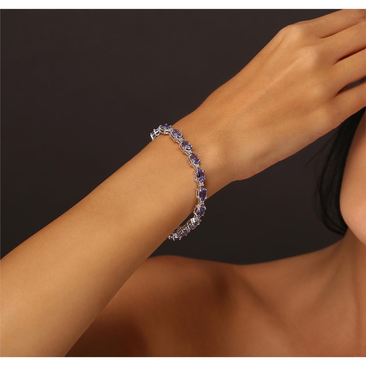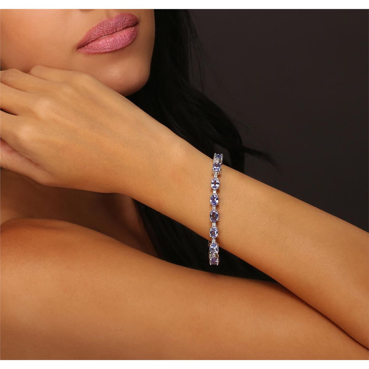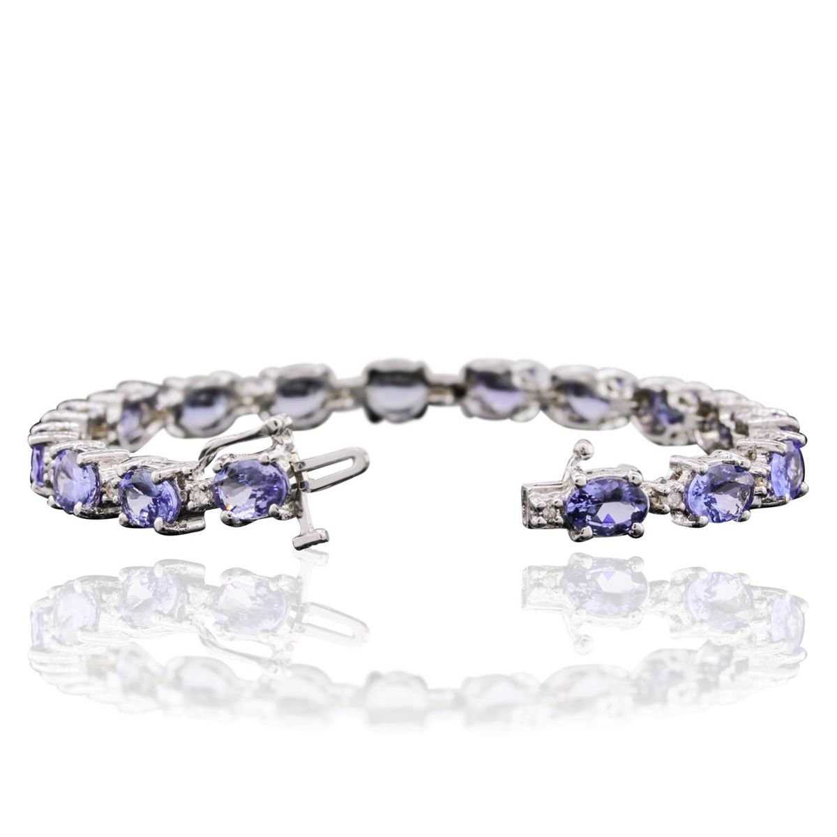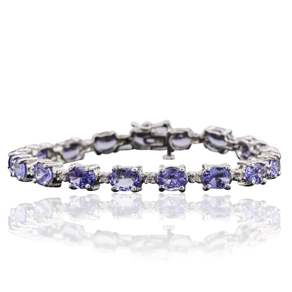 One electronically tested 14KT white gold Ladies combination cast & assembled bracelet with a hidden box clasp with a bright polish finish. Measurements: 7" in length. Identified with markings of "14K". Condition is new. Containing: Seventeen prong set oval modified brilliant cut natural tanzanites, measuring 7.33 x 5.83 x 2.70mm, approximate. Total Weight of 13.26ct., clarity is eye clean, type I, medium light, very slightly grayish, violet color, (GIA V 4/3), cut is good. Colored gemstones are presumed to have been subjected to commonly used color/clarity enhancement processes. Seventeen prong set round brilliant cut diamonds, measuring 2.00 - 2.00 x 1.20mm (depth est.) approximate. Total Weight of 17 Stones = 0.50ct. Clarity: I-1 to I-2. Color: I - J, Cut is Good. Total Weight of Colored Stones 13.26ct. Total Weight of Diamonds 0.50ct. Total Weight of Bracelet 17.30 grams. GGL Appraised at $16,100.00.