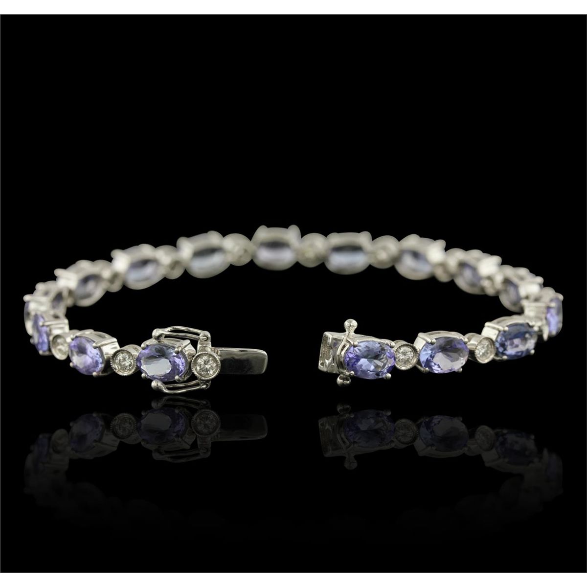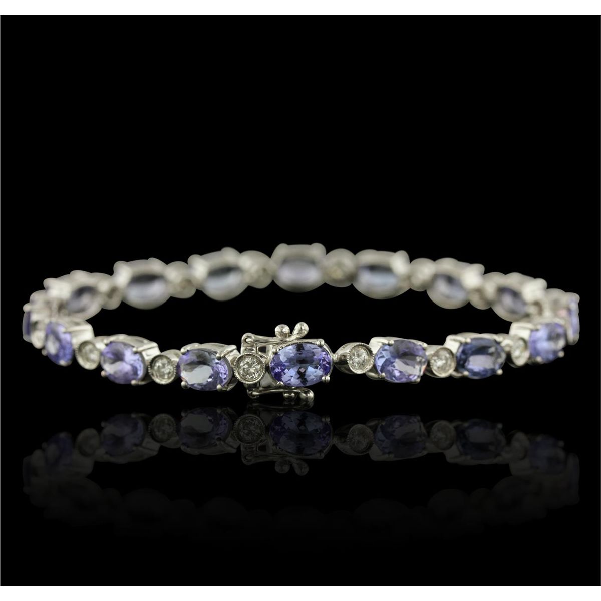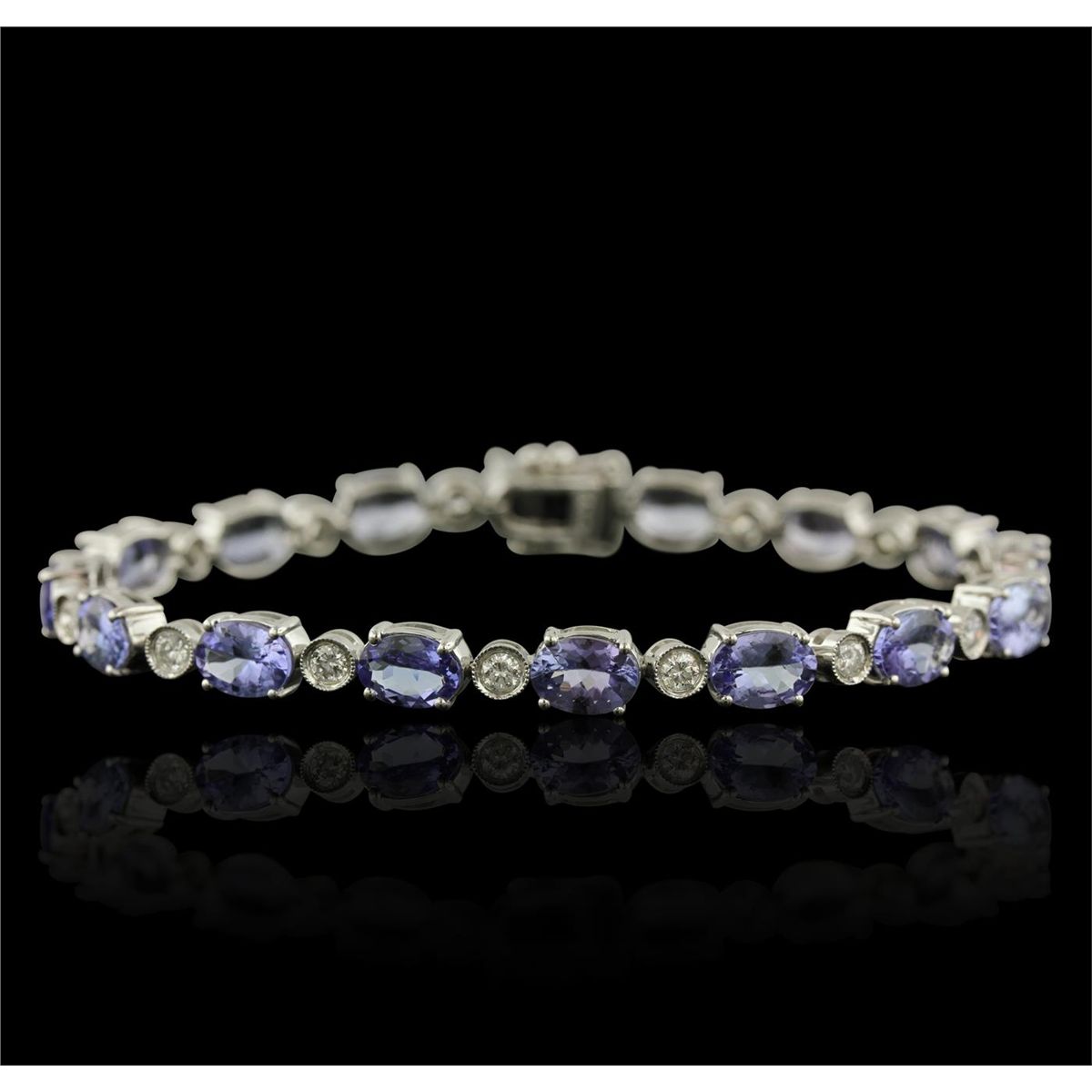One electronically tested 14KT white gold ladies cast & assembled tanzanite and diamond bracelet. Condition is new, good workmanship. Seven inch length bracelet is composed of a ribbon of tanzanite alternated by individually set diamonds , terminating in a concealed clasp with twin safeties. Bright polish finish with milgrain detailing throughout. Trademark is UCG. Identified with markings of "14K 585". Containing: Sixteen prong set oval mixed cut natural tanzanites, measuring 7.00 x 5.00 x 3.25mm, 6%. bulge factor, approximate. Total Weight of 13.28ct., clarity is eye clean, type I, medium, very slightly grayish, bluish violet color, (GIA bV 5/3), cut is good. Transmitting light with no distortion, transparent. Measurements & the color grade are an average for the group. Graded in the setting. Tanzanite is a very rare gemstone that is only found in the country of Tanzania. Originally discovered in 1967. Tiffany & Company, named the stone Tanzanite. It is found in the Usumburu Mountains that border the Umba Valley of northern Tanzania. Tanzanite occurs in gray, brown, violet, blue, reddish-purple, & green. The gem is interesting because of its exceptional pleochroism. Rotated in different directions a tanzanite will exhibit multiple changes of color. Tanzanite has a low tolerance to ultrasonic cleaning, and should not be cleaned using this method. Sixteen bezel set round brilliant cut diamonds, measuring 2.60 - 2.60 x 1.56mm (depth est.) approximate. Total Weight of 16 Stones = 1.13ct. Graded in the setting. Clarity: SI-2 to I-1. Color: F - H. Total Weight of Colored Stones 13.28ct. Total Weight of Diamonds 1.13ct. Total Weight of Bracelet 15.00 grams. AIG Appraised at $15,000.00.