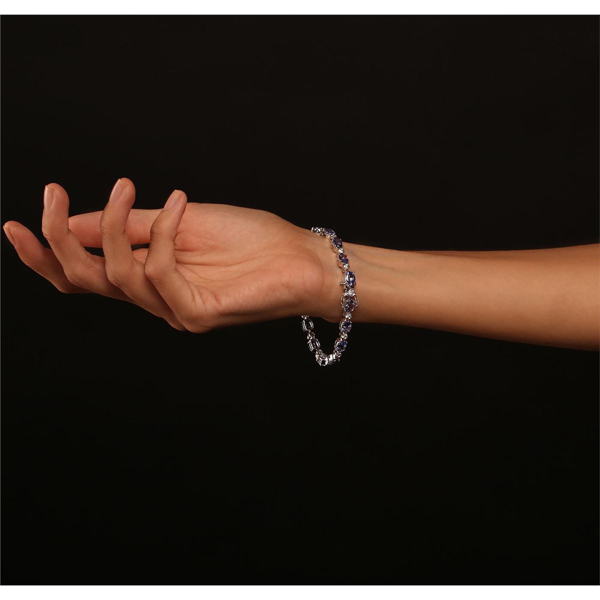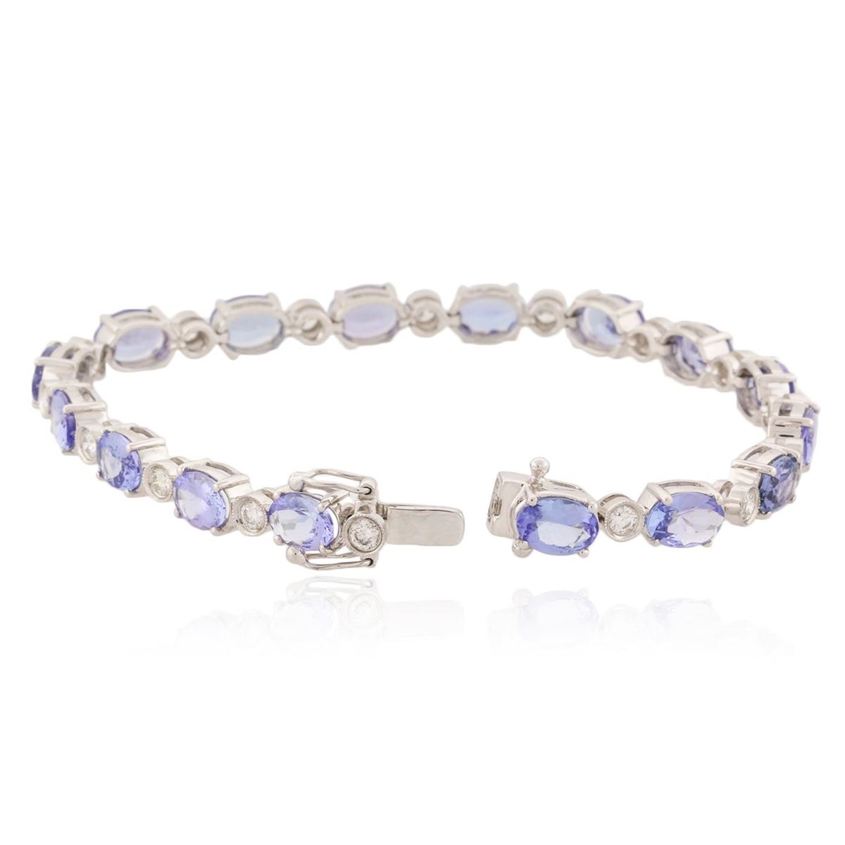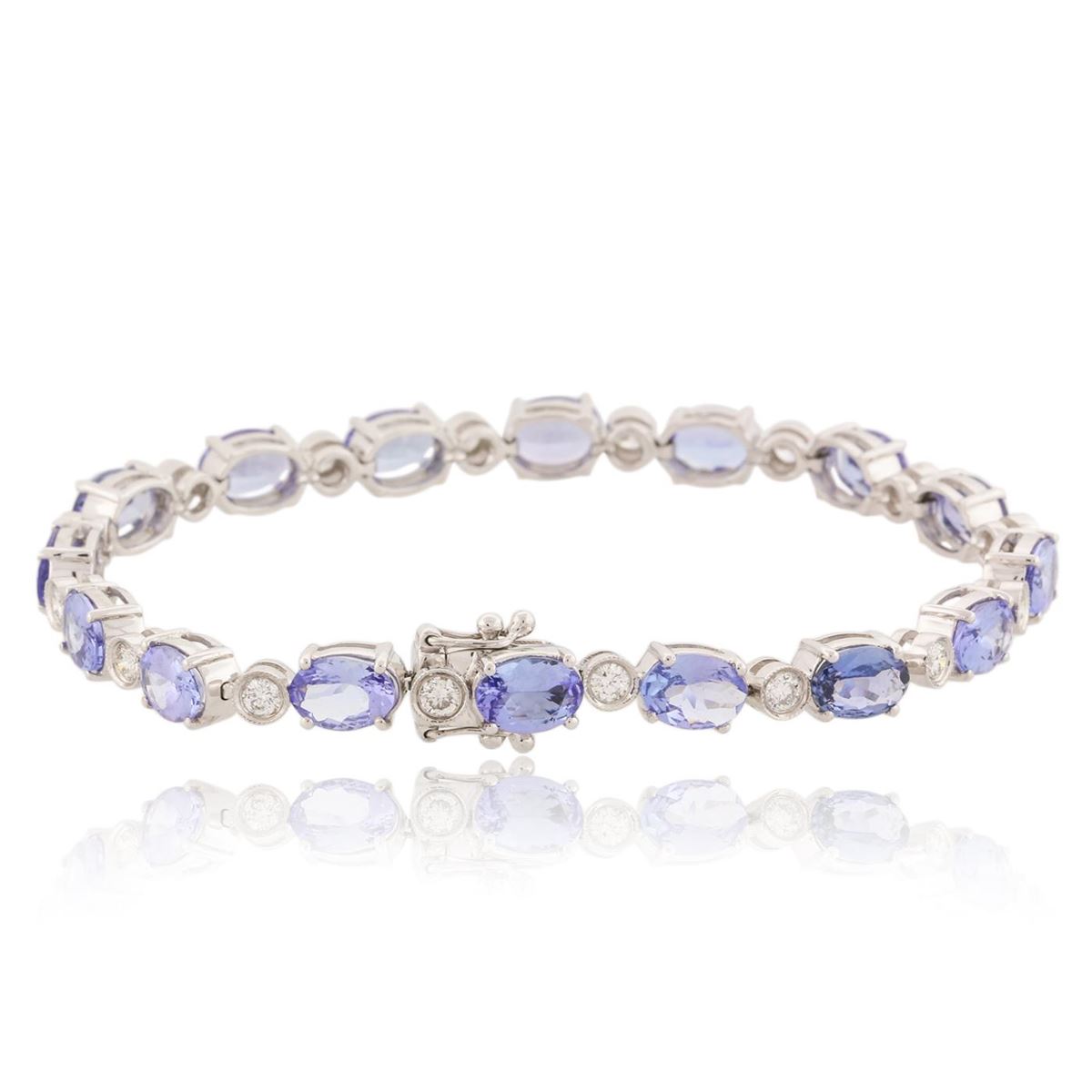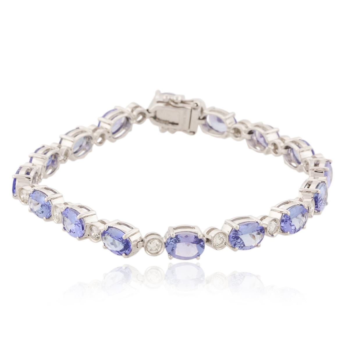 One electronically tested 14KT white gold ladies cast & assembled tanzanite and diamond bracelet. Condition is new, good workmanship. Seven inch length bracelet is composed of a ribbon of tanzanite alternated by individually set diamonds , terminating in a concealed clasp with twin safeties. Bright polish finish with milgrain detailing throughout. Trademark is UCG. Identified with markings of "14K 585". Containing: Sixteen prong set oval mixed cut natural tanzanites, measuring 7.00 x 5.00 x 3.25mm, 6%. bulge factor, approximate. Total Weight of 13.28ct., clarity is eye clean, type I, medium, very slightly grayish, bluish violet color, (GIA bV 5/3), cut is good. Transmitting light with no distortion, transparent. Measurements & the color grade are an average for the group. Graded in the setting. Tanzanite is a very rare gemstone that is only found in the country of Tanzania. Originally discovered in 1967. Tiffany & Company, named the stone Tanzanite. It is found in the Usumburu Mountains that border the Umba Valley of northern Tanzania. Tanzanite occurs in gray, brown, violet, blue, reddish-purple, & green. The gem is interesting because of its exceptional pleochroism. Rotated in different directions a tanzanite will exhibit multiple changes of color. Tanzanite has a low tolerance to ultrasonic cleaning, and should not be cleaned using this method. Sixteen bezel set round brilliant cut diamonds, measuring 2.60 - 2.60 x 1.56mm (depth est.) approximate. Total Weight of 16 Stones = 1.13ct. Graded in the setting. Clarity: SI-2 to I-1. Color: F - H. Total Weight of Colored Stones 13.28ct. Total Weight of Diamonds 1.13ct. Total Weight of Bracelet 15.00 grams. AIG Appraised at $15,000.00.