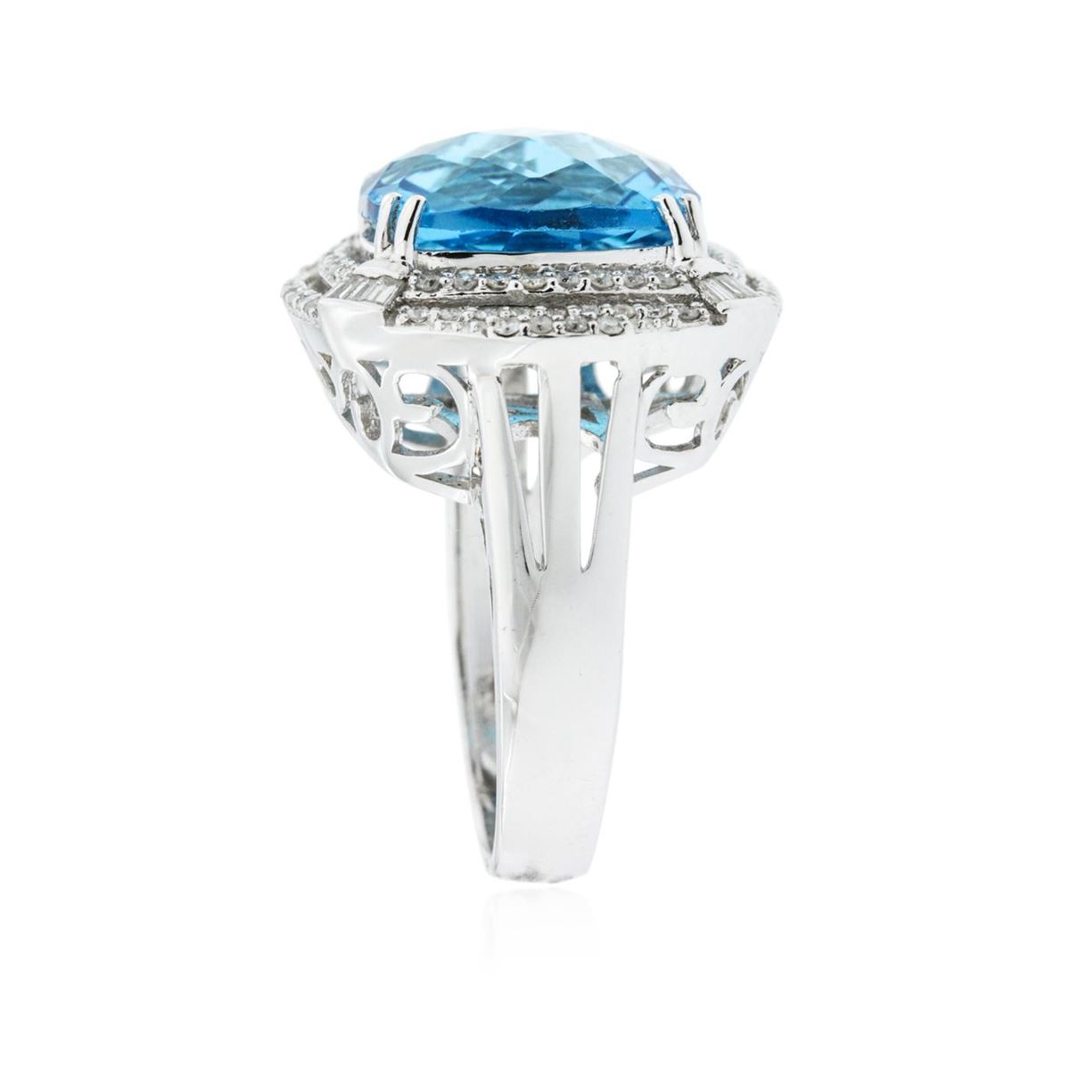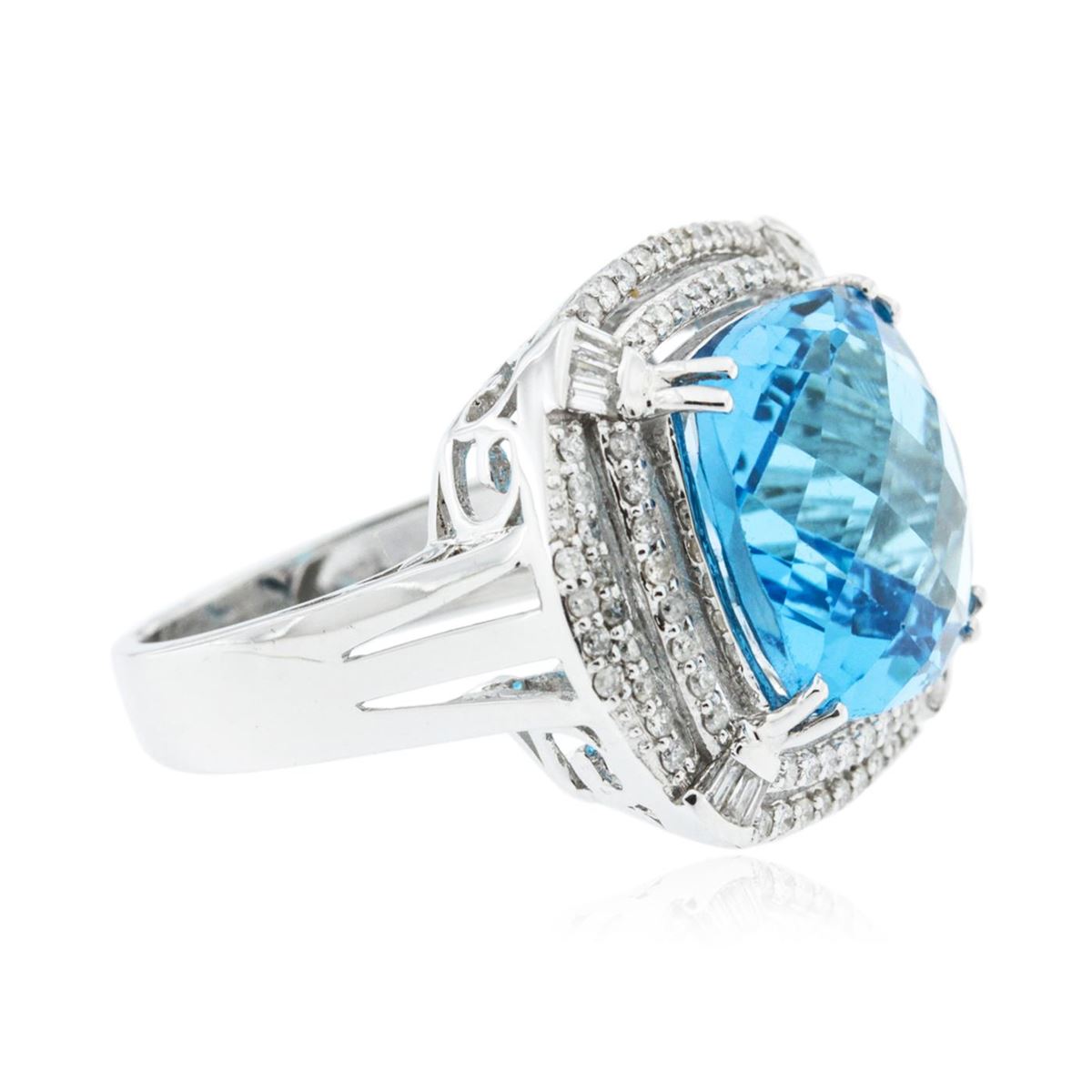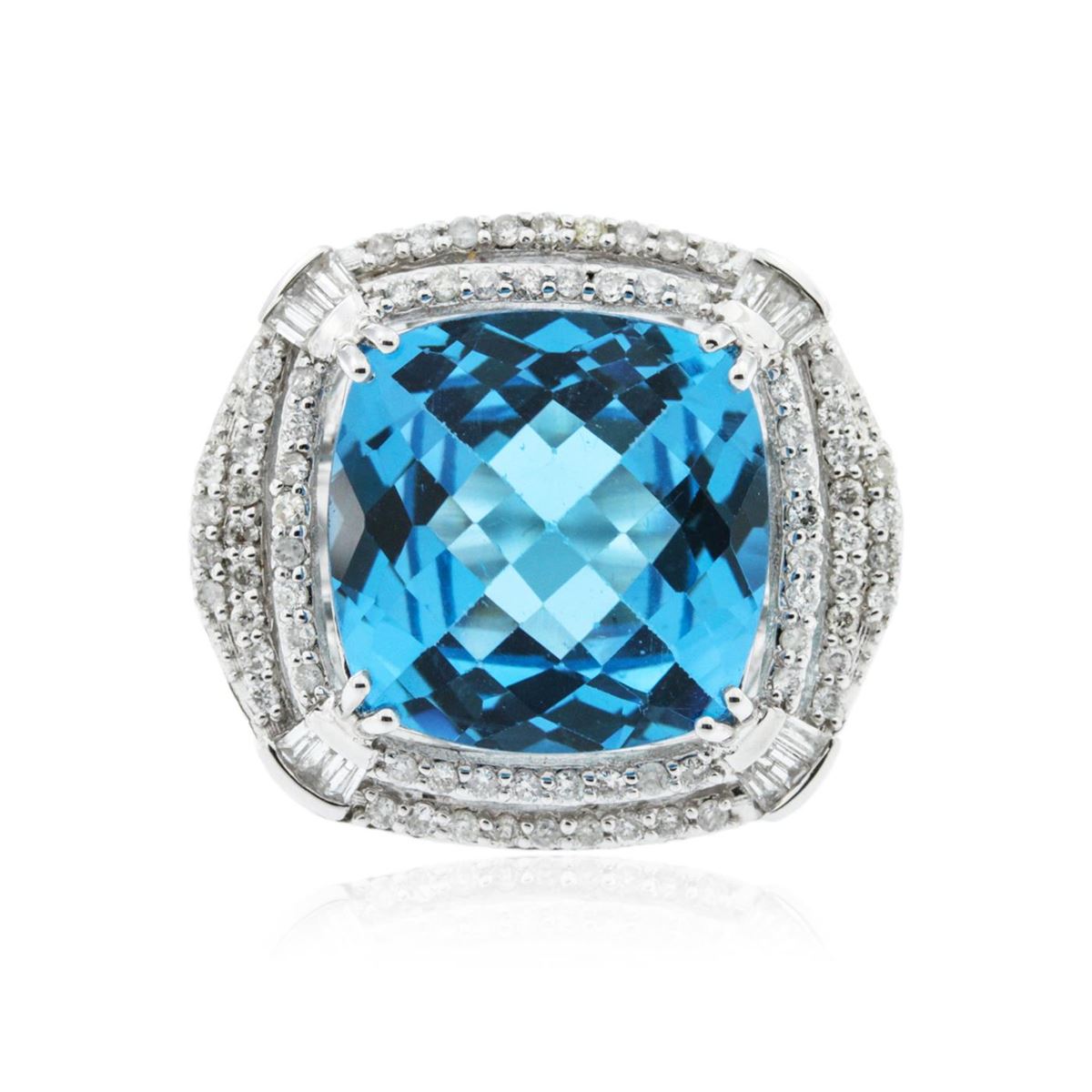 One ring featuring: 14KT white gold weighing 8.89 grams containing one blue topaz center stone with a total weight of 13.29ct and round diamonds with a total weight of 0.73ct.