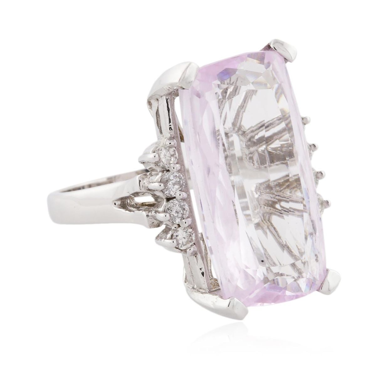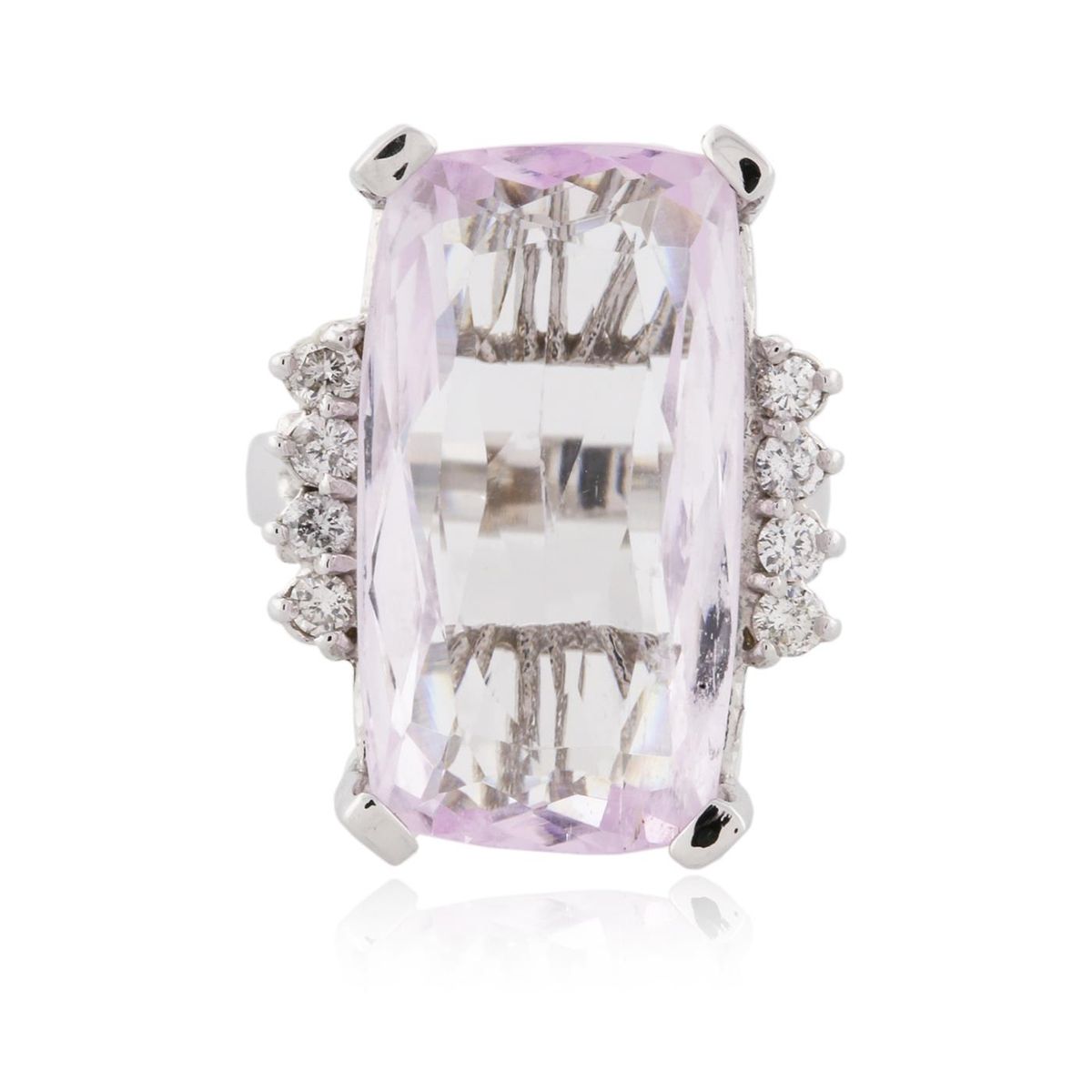 One electronically tested 14KT white gold ladies cast kunzite and diamond ring with a bright polish finish. Condition is new, good workmanship. The featured kunzite is supported by diamond accented shoulders, completed by a two and one-half millimeter wide band. Identified with markings of "14K". Containing: One prong set rectangular cushion mixed cut natural kunzite, measuring 21.20 x 11.50 x 6.35mm, 15%. bulge factor, approximate weight of 13.30ct., clarity is slightly included, type I, medium light, very slightly grayish, reddish purple color, (GIA rP 4/3), cut is good. Transmitting light with a minimum of distortion, transparent. Naturally occurring internal & external characteristics are present. Colored Stone Grading Report attached. Graded in the setting. Eight prong set round brilliant cut diamonds, measuring 2.30 - 2.20 x 1.35mm (depth est.) approximate. Total Weight of 8 Stones = 0.43ct. Graded in the setting. Clarity: SI-2 to I-1. Color: H - I. Total Weight of Colored Stones 13.30ct. Total Weight of Diamonds 0.43ct. Total Weight of Ring 9.75 grams. AIG Appraised at $6,700.00.