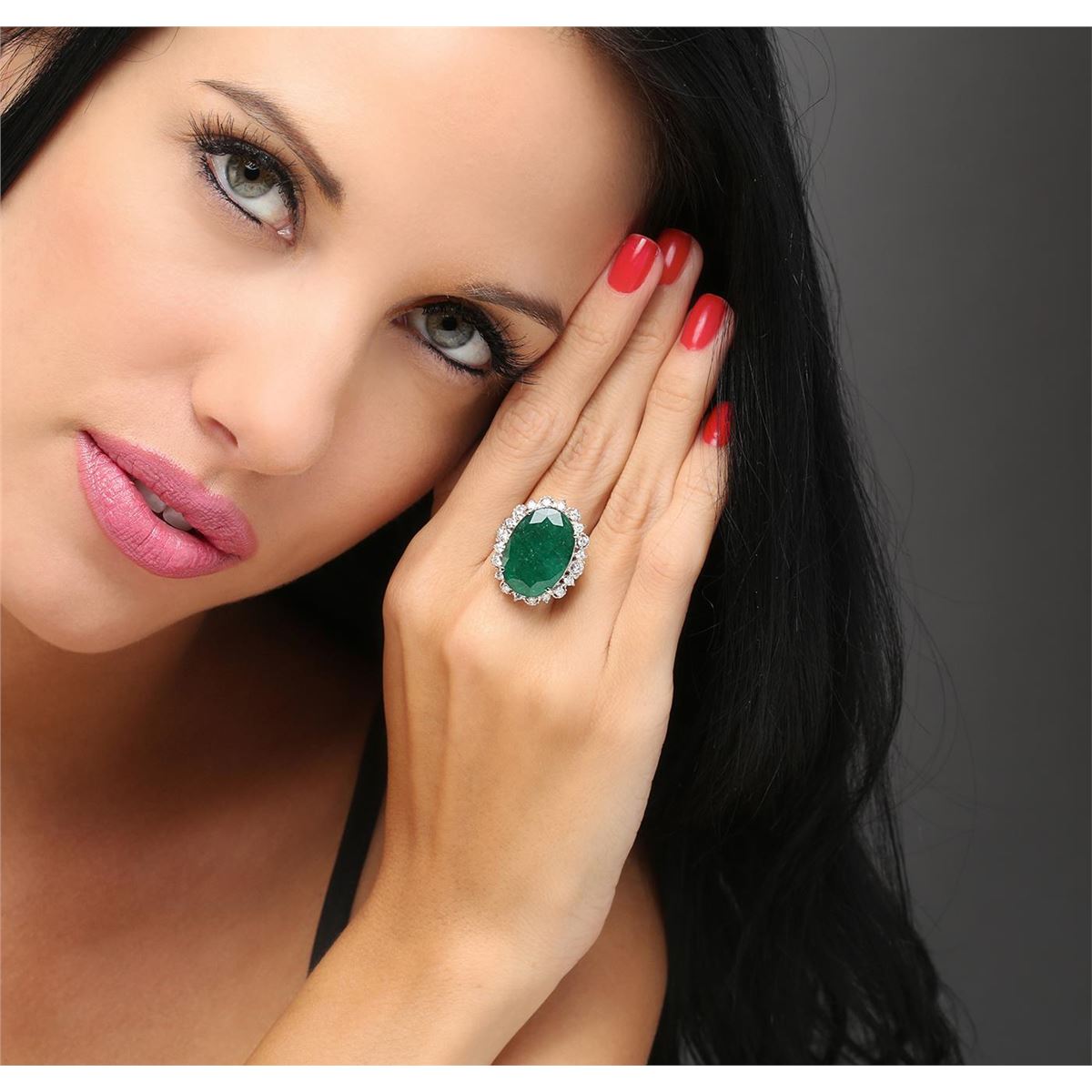 One electronically tested 14KT white gold ladies combination cast & assembled emerald and diamond ring with a bright polish finish. Identified with markings of "K14". Condition is new. Containing: One prong set oval modified brilliant cut natural emerald, measuring 20.46 x 14.42 x 7.92mm, approximate weight of 13.35ct., clarity is heavily included, type III, medium dark, moderately strong, green color, (GIA G 6/4), cut is good. Twenty prong set round brilliant cut diamonds, measuring 2.00 - 2.00 x 1.20mm (depth est.) approximate total weight of 20 Stones = 0.58ct. Clarity: SI-2 to I-1. Color: I - J, Cut is Good. Colored gemstones are presumed to have been subjected to commonly used enhancement processes. All diamonds and colored gemstones are graded in the mounting, unless otherwise stated. Total Weight of Colored Stones 13.35ct. Total Weight of Diamonds 0.58ct. Total Weight of Ring 9.40 grams. GGL Appraised at $7,335.00.