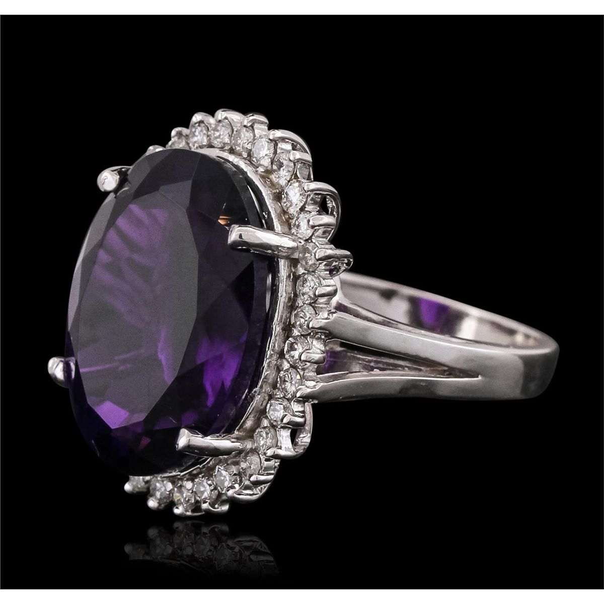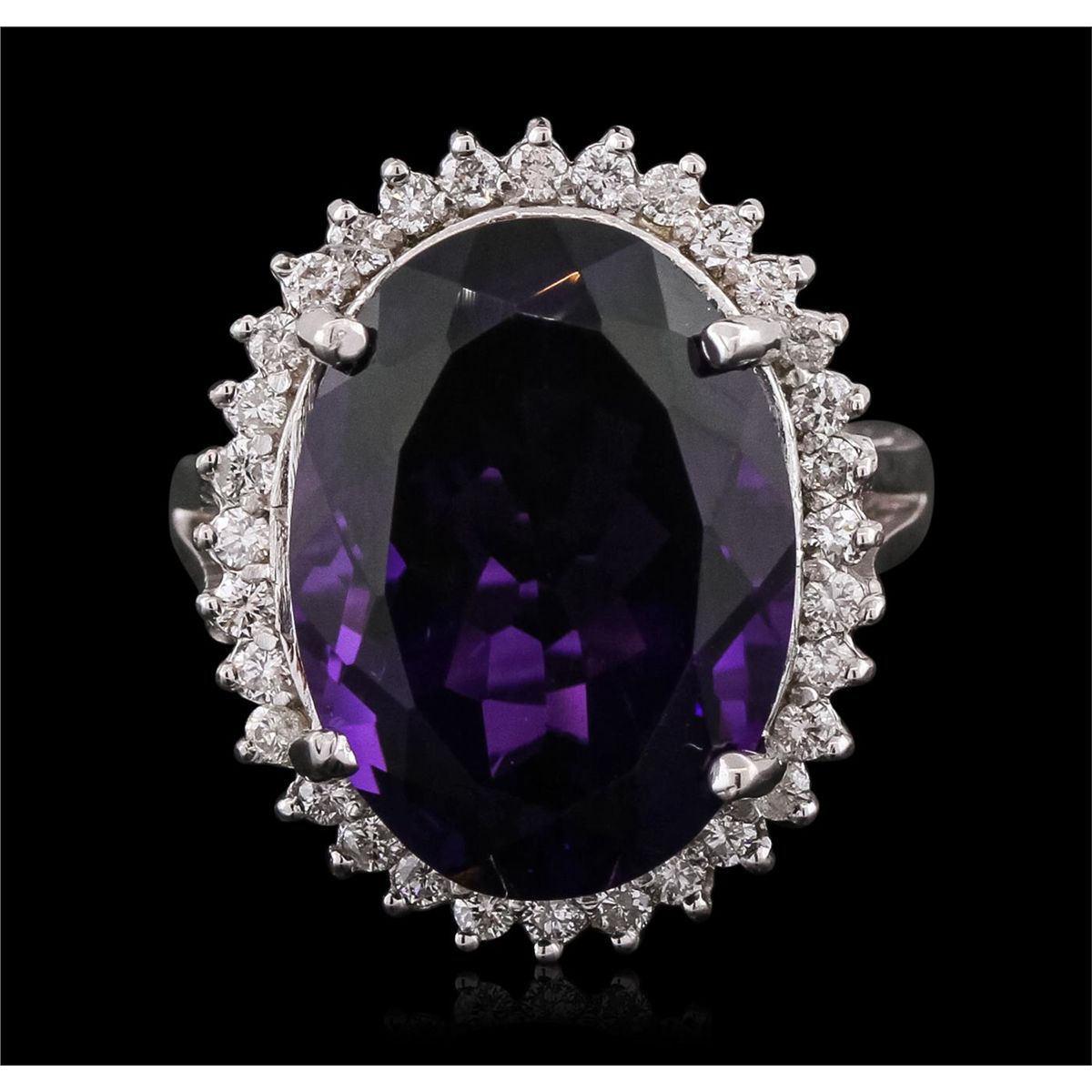One electronically tested 14KT white gold ladies combination cast & assembled ring with a bright polish finish. Identified with markings of "14K". Condition is new. Containing: One prong set oval modified brilliant cut natural amethyst, measuring 18.00 x 13.50 x 10.13mm, approximate weight of 13.37ct., clarity is eye clean, type II, dark, moderately strong, purple color, (GIA P 7/4), cut is good. Thirty-Two prong set round brilliant cut diamonds, measuring 1.50 - 1.50 x 0.90mm (depth est.) approximate total weight of 32 Stones = 0.39ct. Clarity: I-1 to I-2. Color: I - J, Cut is Good. Colored gemstones are presumed to have been subjected to commonly used enhancement processes. All diamonds and colored gemstones are graded in the mounting, unless otherwise stated. Total Weight of Colored Stones 13.37ct. Total Weight of Diamonds 0.39ct. Total Weight of Ring 8.90 grams. GGL Appraised at $5,625.00.