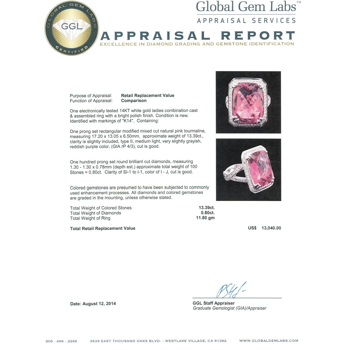 One electronically tested 14KT white gold ladies combination cast & assembled ring with a bright polish finish. Condition is new. Identified with markings of "K14". Containing: One prong set rectangular modified mixed cut natural pink tourmaline, measuring 17.20 x 13.05 x 6.50mm, approximate weight of 13.39ct., clarity is slightly included, type II, medium light, very slightly grayish, reddish purple color, (GIA rP 4/3), cut is good. One Hundred prong set round brilliant cut diamonds, measuring 1.30 - 1.30 x 0.78mm (depth est.) approximate. Total Weight of 100 Stones = 0.80ct. Clarity: SI-1 to I-1. Color: I - J, Cut is Good. Colored gemstones are presumed to have been subjected to commonly used enhancement processes. All diamonds and colored gemstones are graded in the mounting, unless otherwise stated. Total Weight of Colored Stones 13.39ct. Total Weight of Diamonds 0.80ct. Total Weight of Ring 11.80 grams. GGL Appraised at $13,040.00.