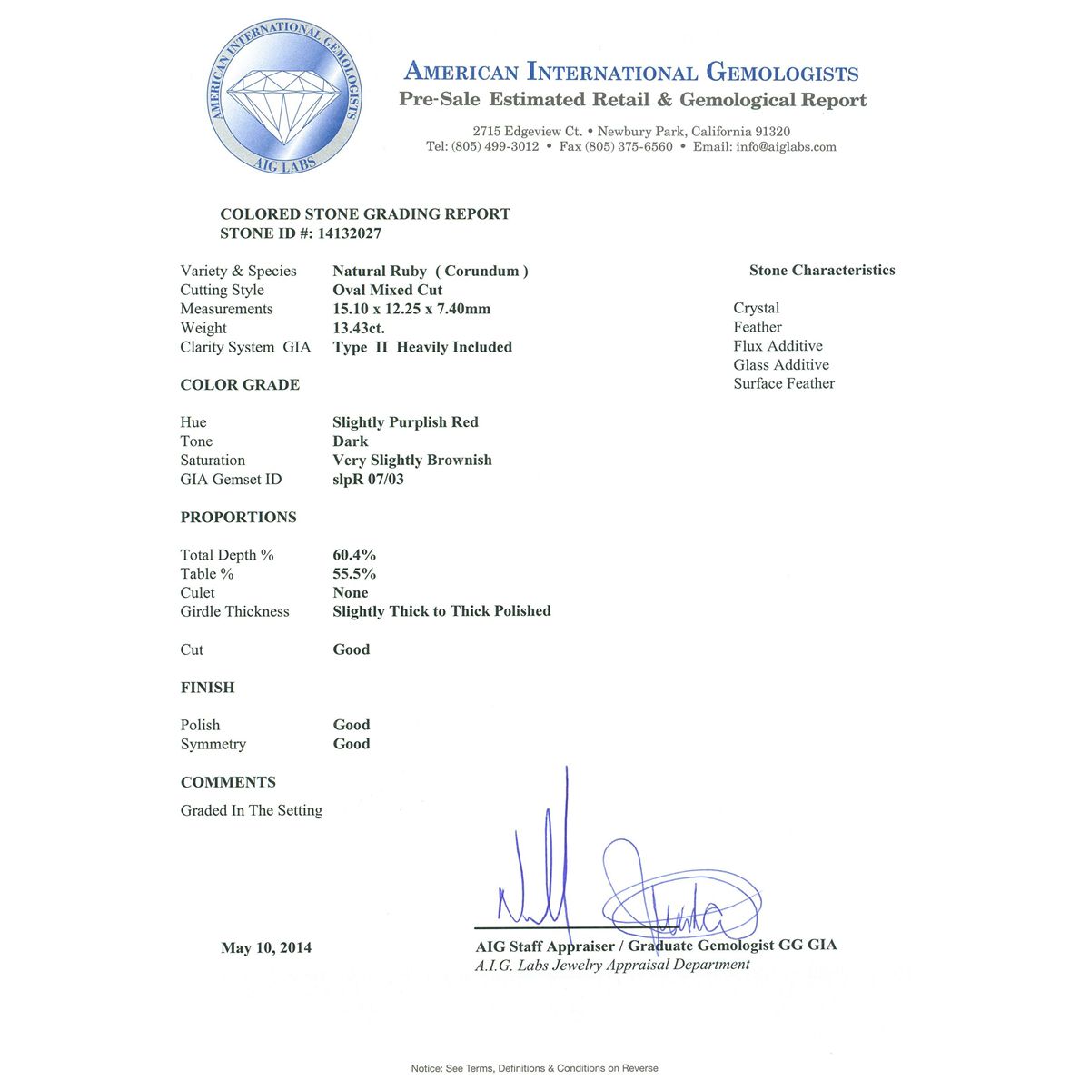 One electronically tested 14KT white gold ladies cast ruby and diamond ring with a bright polish finish. Condition is new, good workmanship. The featured ruby is set within a diamond bezel, completed by a three millimeter wide band. Identified with markings of "14K". Containing: One prong set oval mixed cut natural ruby, measuring 15.10 x 12.25 x 7.40mm, 20%. bulge factor, approximate weight of 13.43ct., clarity is heavily included, type II, dark, very slightly brownish, slightly purplish red color, (GIA slpR 7/3), cut is good. Transmitting light somewhat diffusely, transparent to translucent. Naturally occurring internal & external characteristics are present. Indications of laboratory high temperature heat treatment, with glass & flux additives. Colored Stone Grading Report attached. Graded in the setting. Ruby has a low tolerance to rhodium plating, repolishing the surface, & ultrasonic cleaning. Twenty-Six prong set round brilliant cut diamonds, measuring 2.00 - 1.90 x 1.17mm (depth est.) approximate. Total Weight of 26 Stones = 0.77ct. Graded in the setting. Clarity: SI-1 to I-1. Color: G - I. Total Weight of Colored Stones 13.43ct. Total Weight of Diamonds 0.77ct. Total Weight of Ring 8.40grams. AIG Appraised at $6,790.00.