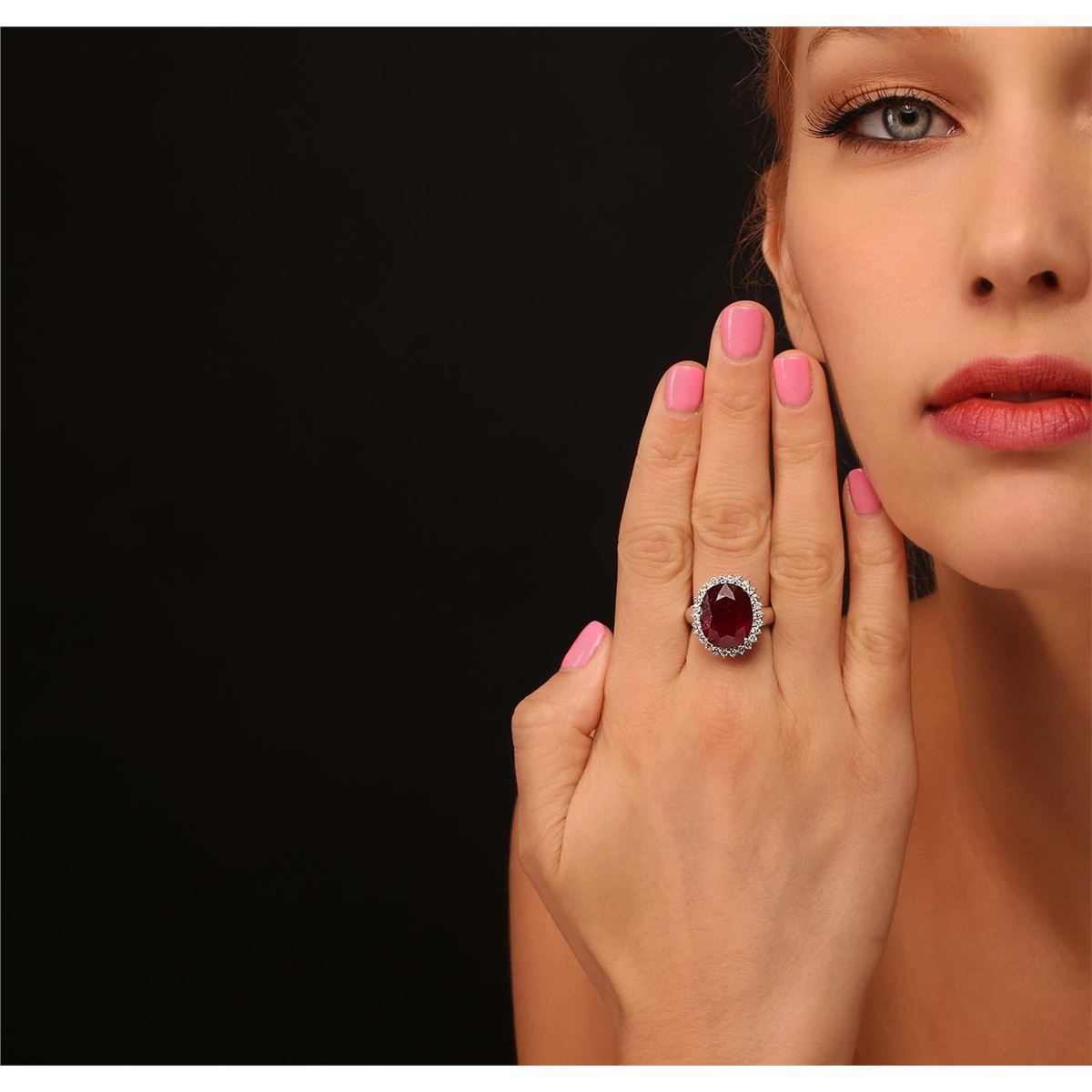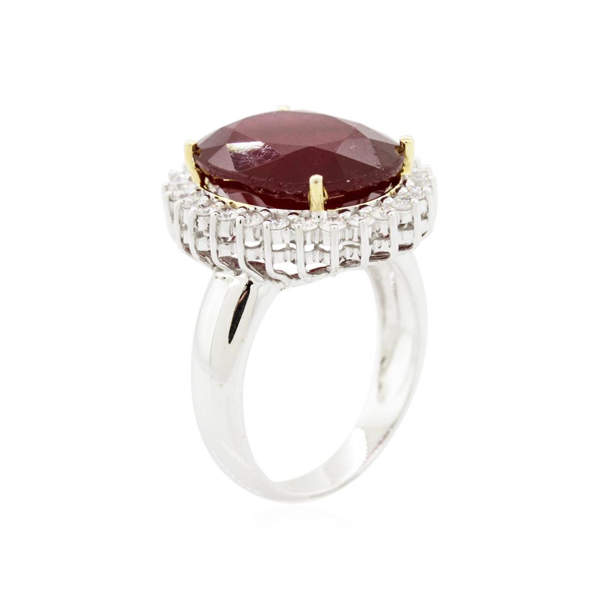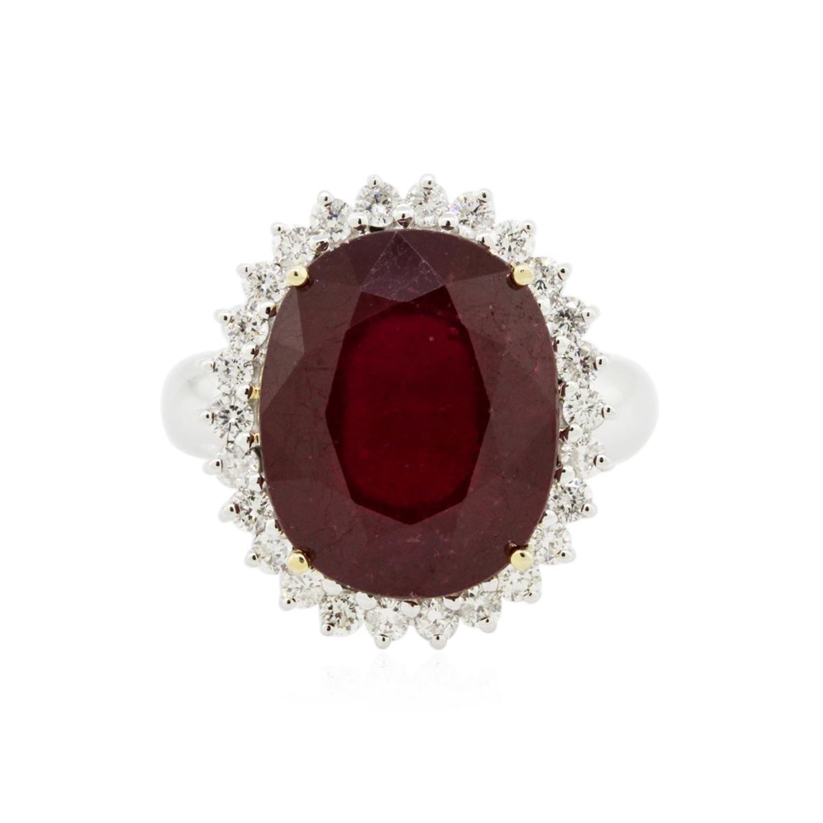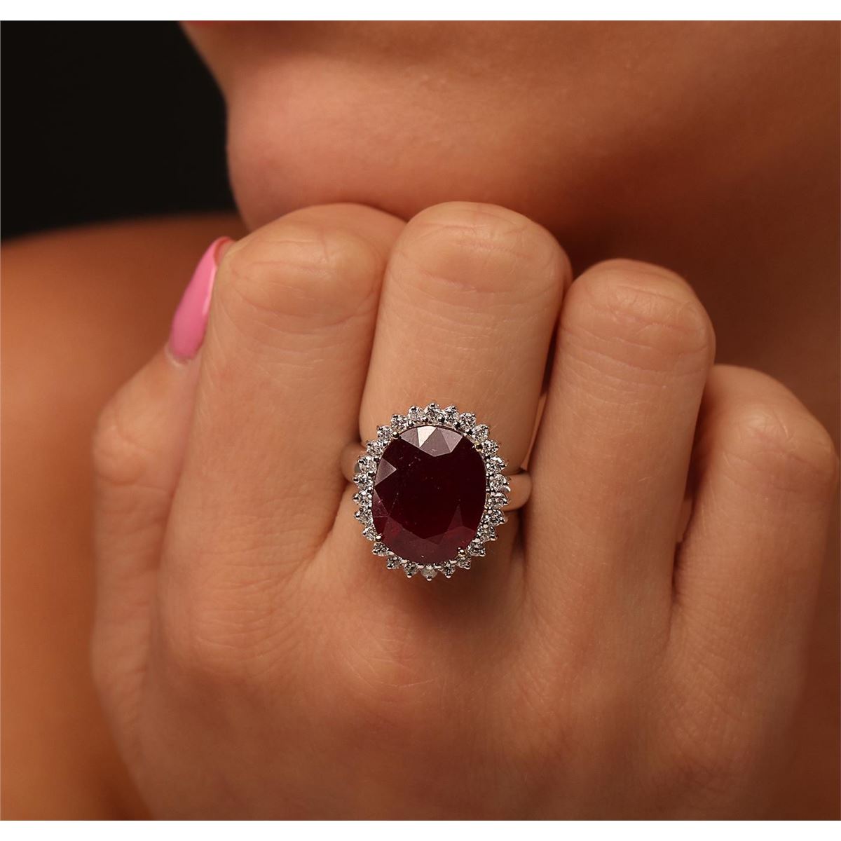 One electronically tested 14KT white gold ladies cast ruby and diamond ring with a bright polish finish. Condition is new, good workmanship. The featured ruby is set within a diamond bezel, completed by a three millimeter wide band. Identified with markings of "14K". Containing: One prong set oval mixed cut natural ruby, measuring 15.10 x 12.25 x 7.40mm, 20%. bulge factor, approximate weight of 13.43ct., clarity is heavily included, type II, dark, very slightly brownish, slightly purplish red color, (GIA slpR 7/3), cut is good. Transmitting light somewhat diffusely, transparent to translucent. Naturally occurring internal & external characteristics are present. Indications of laboratory high temperature heat treatment, with glass & flux additives. Colored Stone Grading Report attached. Graded in the setting. Ruby has a low tolerance to rhodium plating, repolishing the surface, & ultrasonic cleaning. Twenty-Six prong set round brilliant cut diamonds, measuring 2.00 - 1.90 x 1.17mm (depth est.) approximate. Total Weight of 26 Stones = 0.77ct. Graded in the setting. Clarity: SI-1 to I-1. Color: G - I. Total Weight of Colored Stones 13.43ct. Total Weight of Diamonds 0.77ct. Total Weight of Ring 8.40grams. AIG Appraised at $6,790.00.