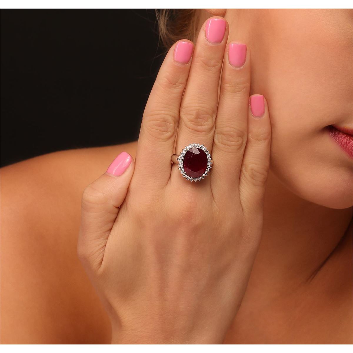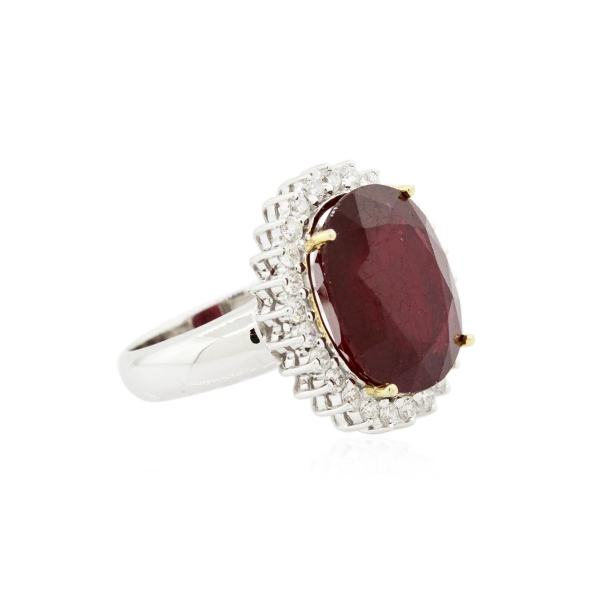 One electronically tested 14KT white gold ladies cast ruby and diamond ring with a bright polish finish. Condition is new, good workmanship. The featured ruby is set within a diamond bezel, completed by a three millimeter wide band. Identified with markings of "14K". Containing: One prong set oval mixed cut natural ruby, measuring 15.10 x 12.25 x 7.40mm, 20%. bulge factor, approximate weight of 13.43ct., clarity is heavily included, type II, dark, very slightly brownish, slightly purplish red color, (GIA slpR 7/3), cut is good. Transmitting light somewhat diffusely, transparent to translucent. Naturally occurring internal & external characteristics are present. Indications of laboratory high temperature heat treatment, with glass & flux additives. Colored Stone Grading Report attached. Graded in the setting. Ruby has a low tolerance to rhodium plating, repolishing the surface, & ultrasonic cleaning. Twenty-Six prong set round brilliant cut diamonds, measuring 2.00 - 1.90 x 1.17mm (depth est.) approximate. Total Weight of 26 Stones = 0.77ct. Graded in the setting. Clarity: SI-1 to I-1. Color: G - I. Total Weight of Colored Stones 13.43ct. Total Weight of Diamonds 0.77ct. Total Weight of Ring 8.40grams. AIG Appraised at $6,790.00.